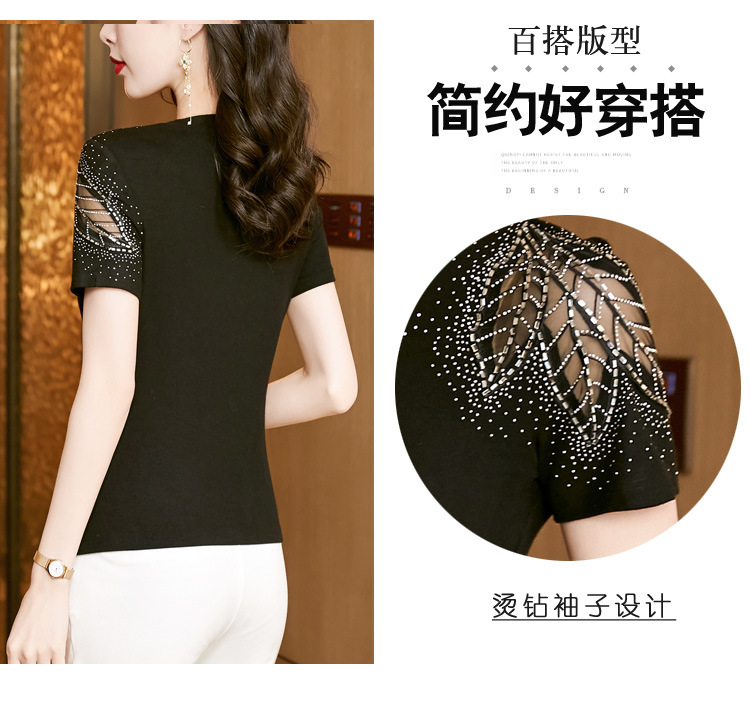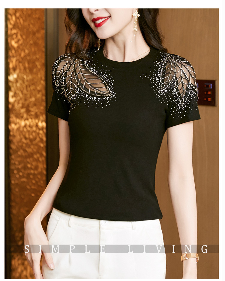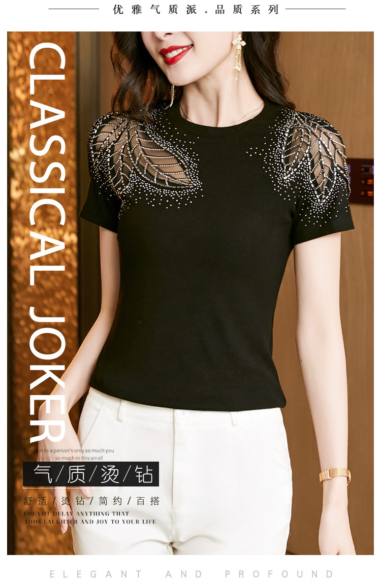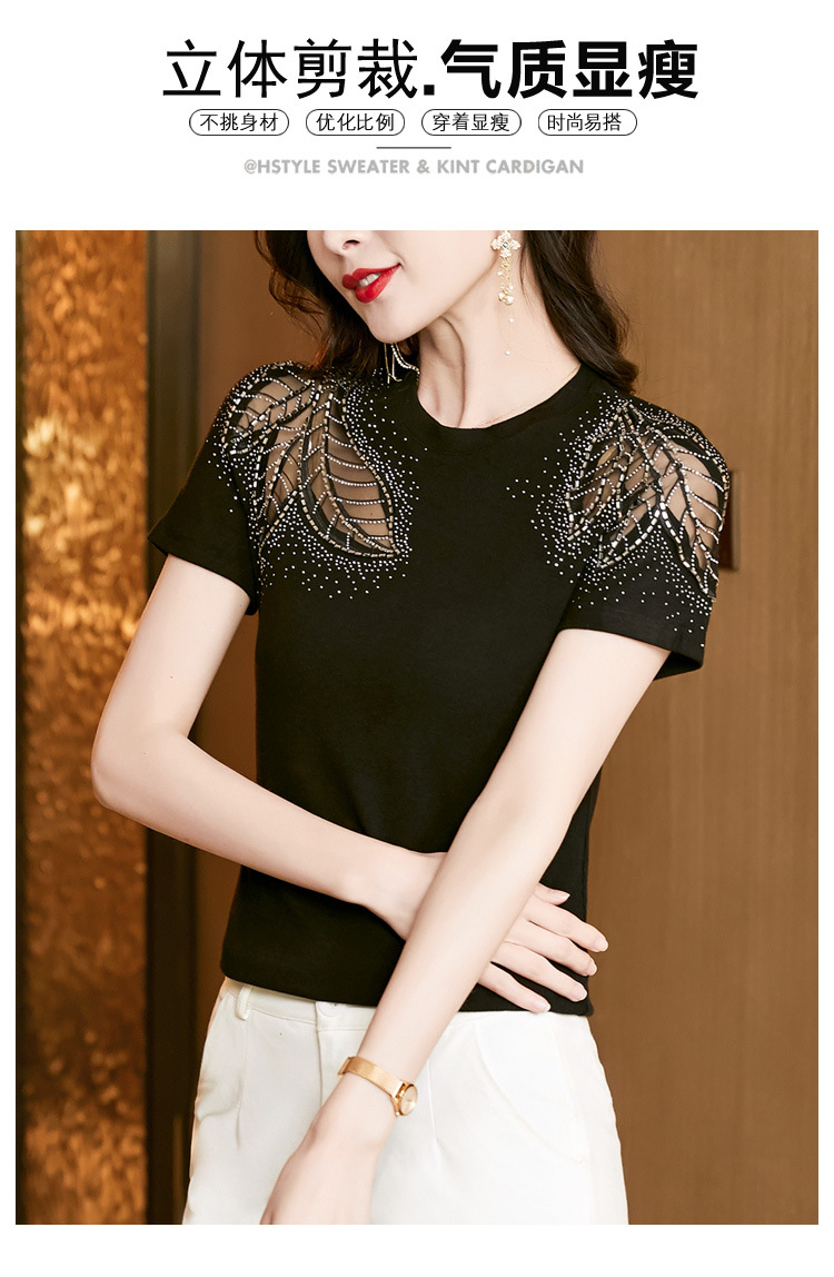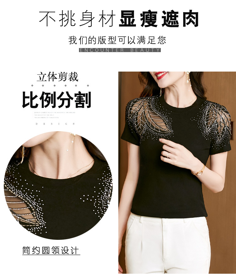 时尚百搭,圆领修身打底衫黑色蕾丝拼接烫钻短袖t恤KQL-2301
