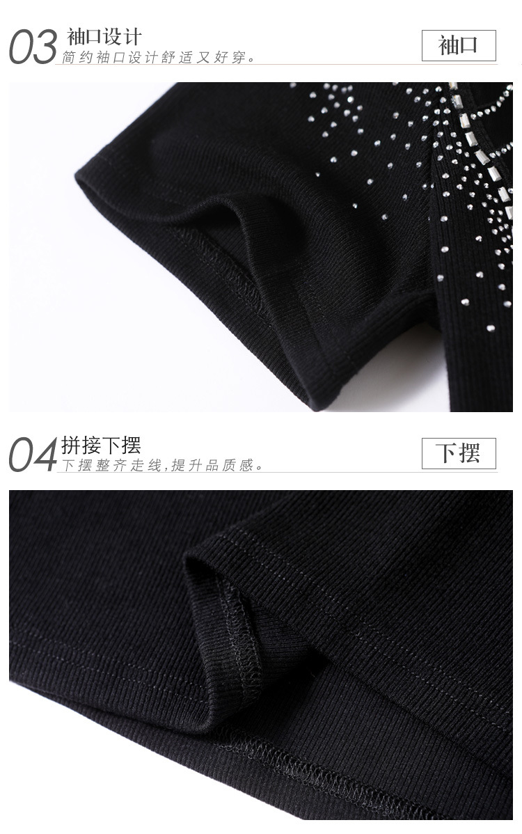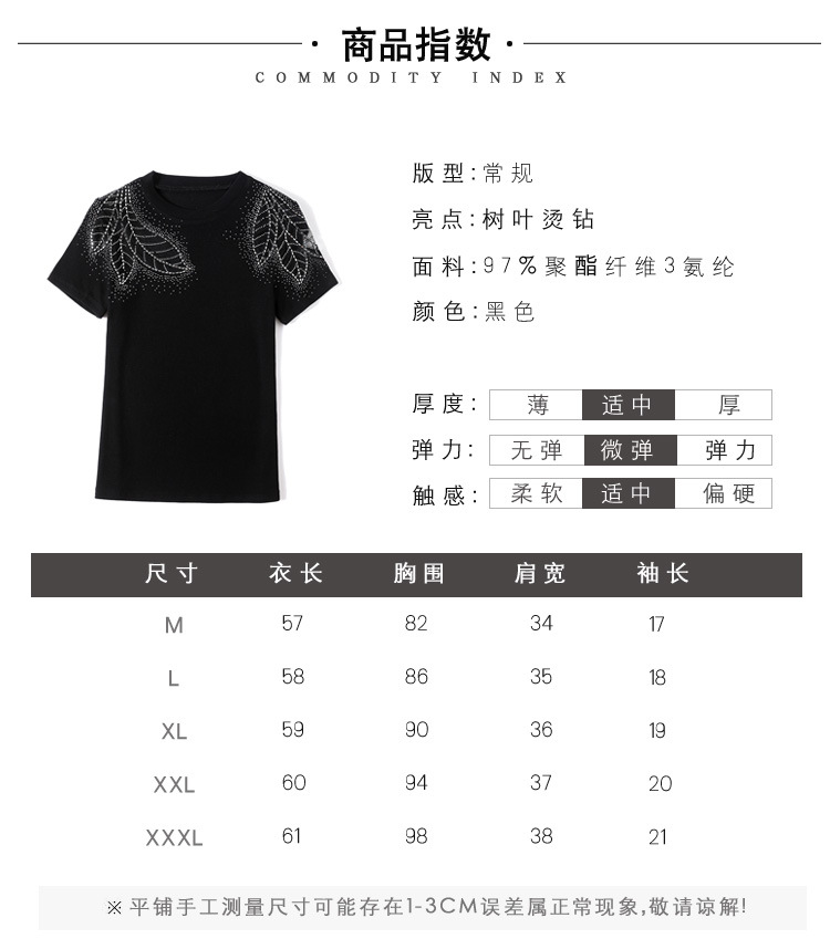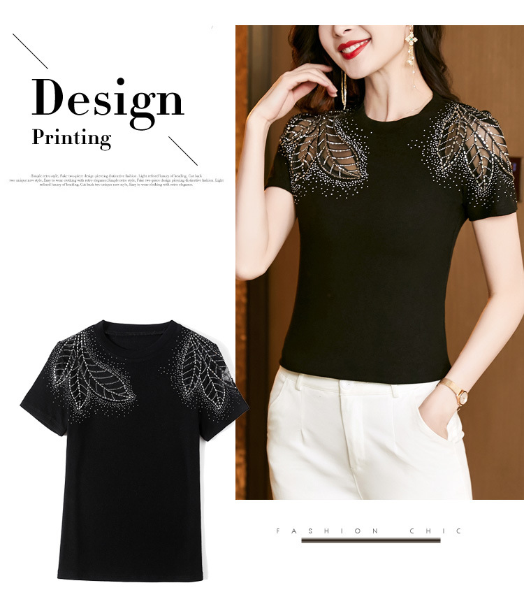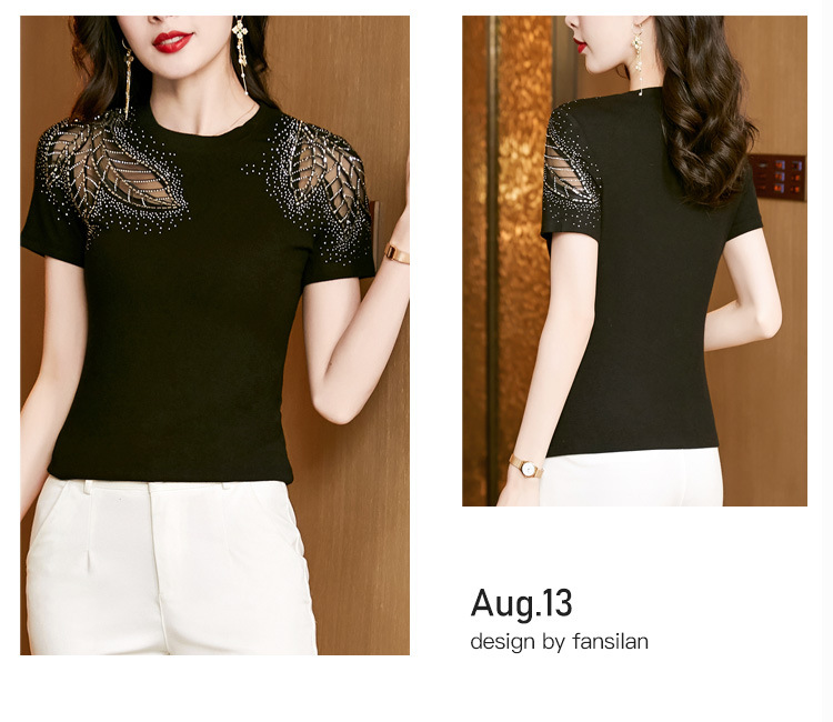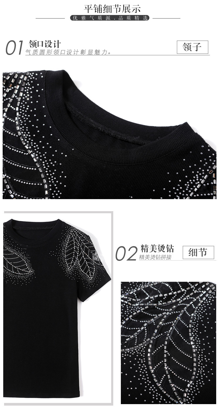 时尚百搭,圆领修身打底衫黑色蕾丝拼接烫钻短袖t恤KQL-2301