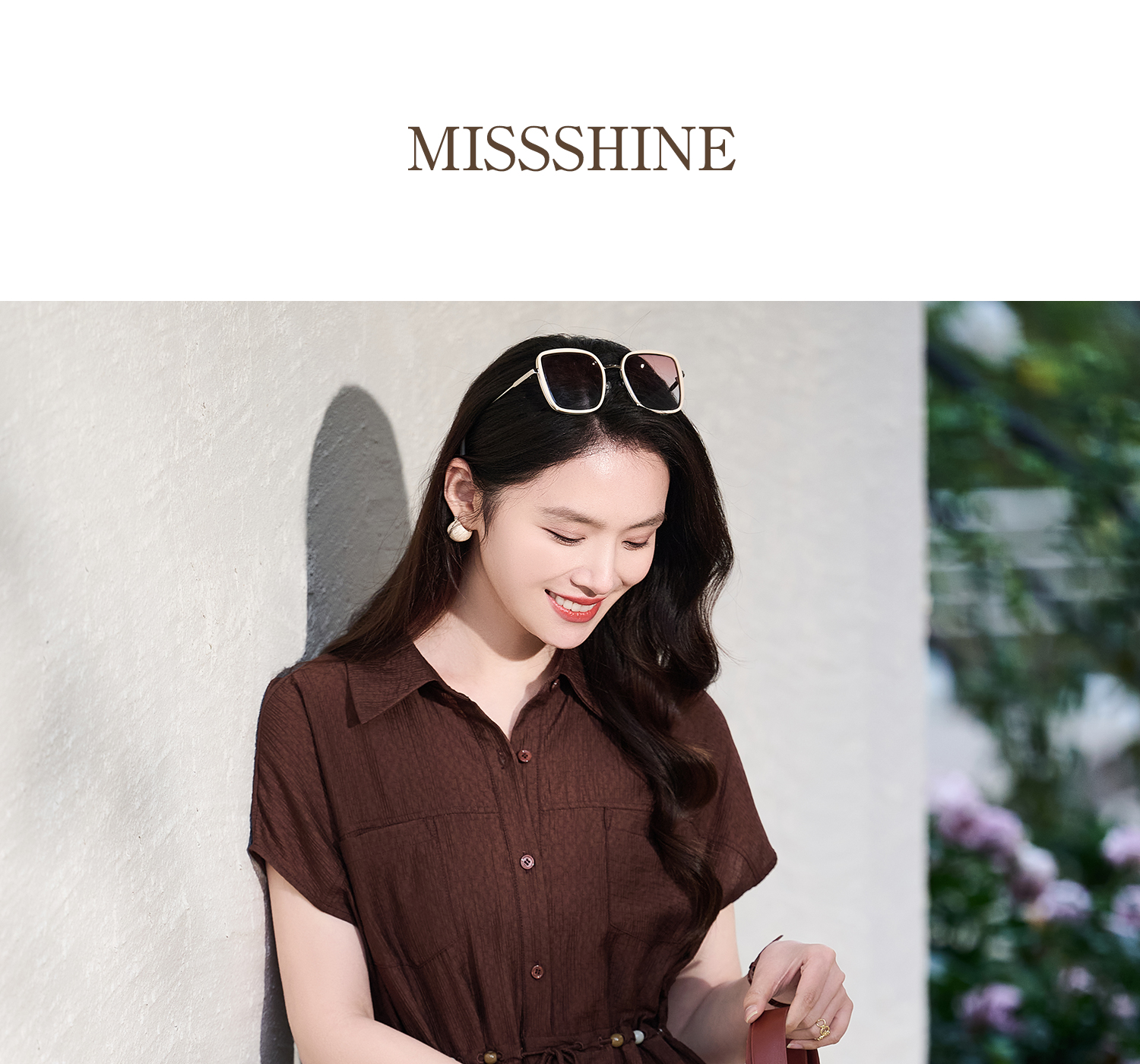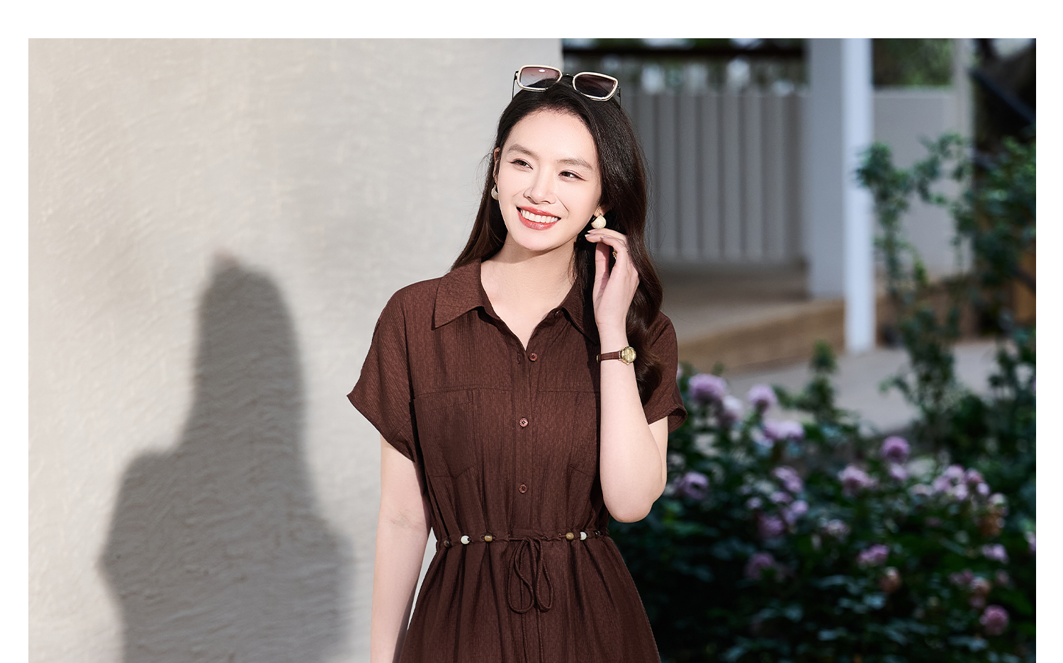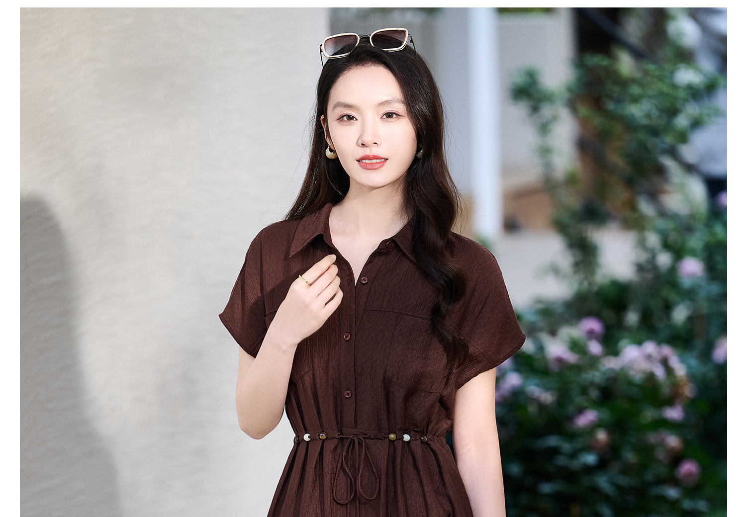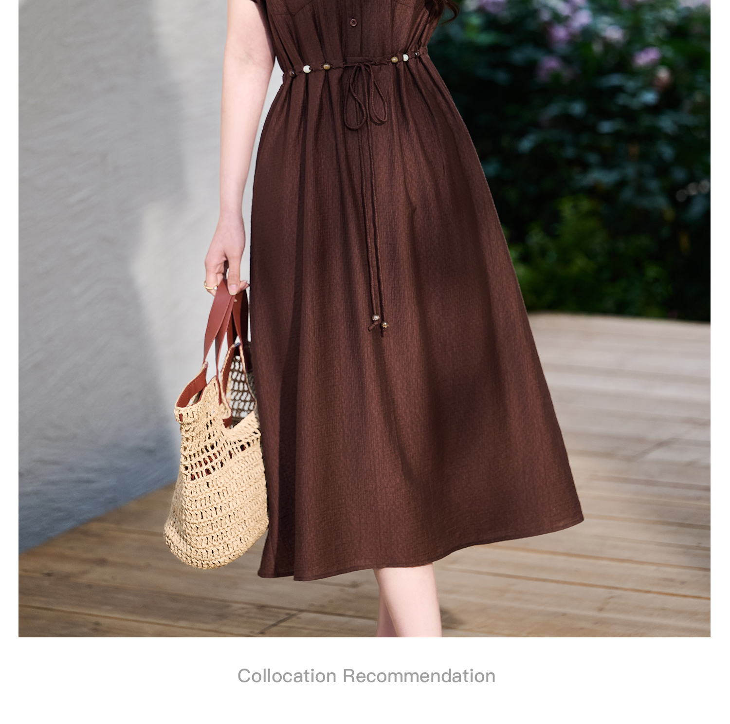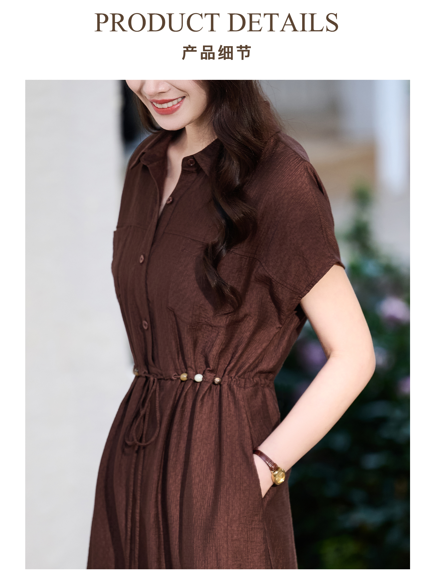 落日深棕调 复古氛围衬衫裙 肌理感天丝混纺 米思阳2026夏季新款优雅通勤衬衫连衣裙串珠腰带中长款A字裙女6152