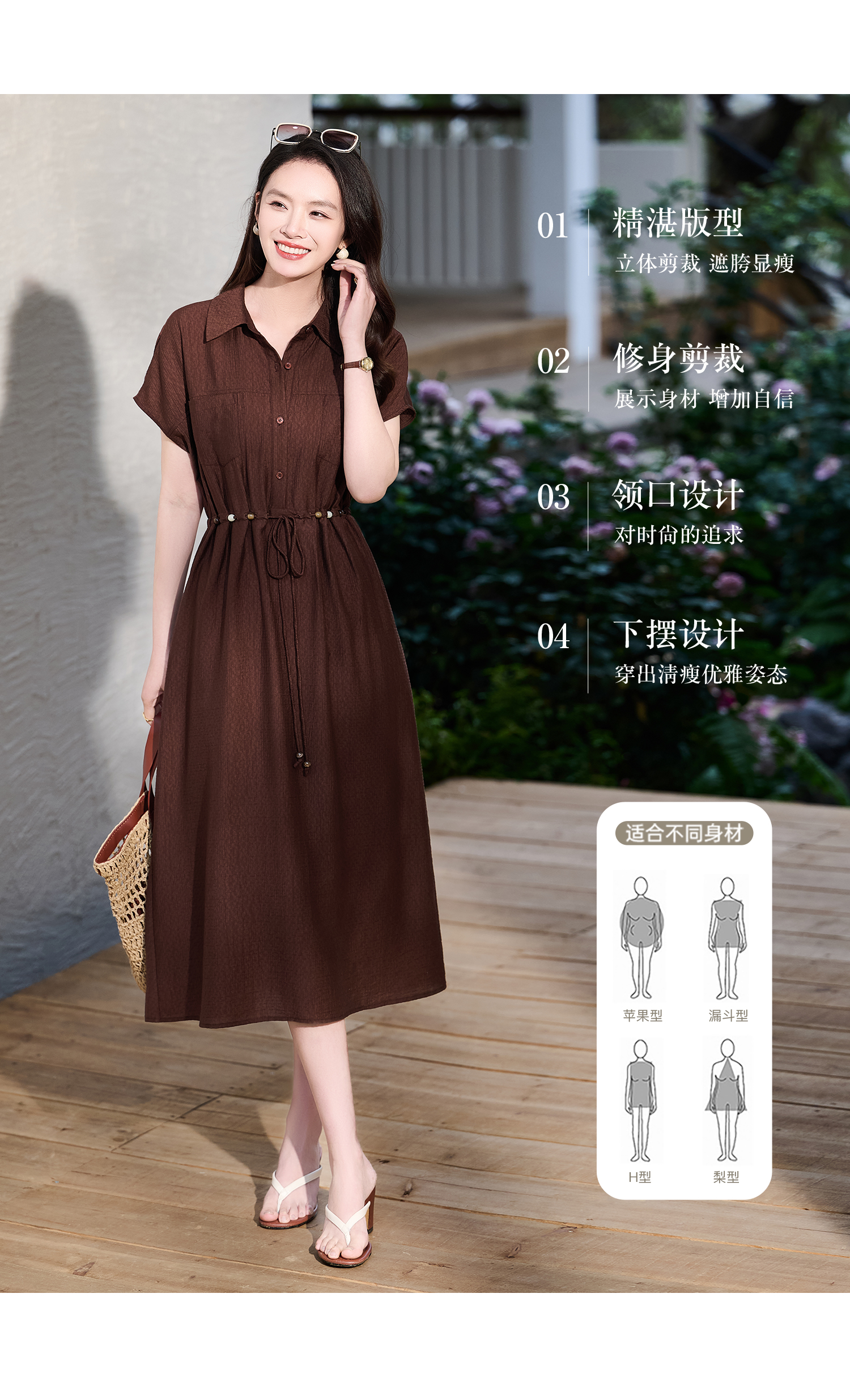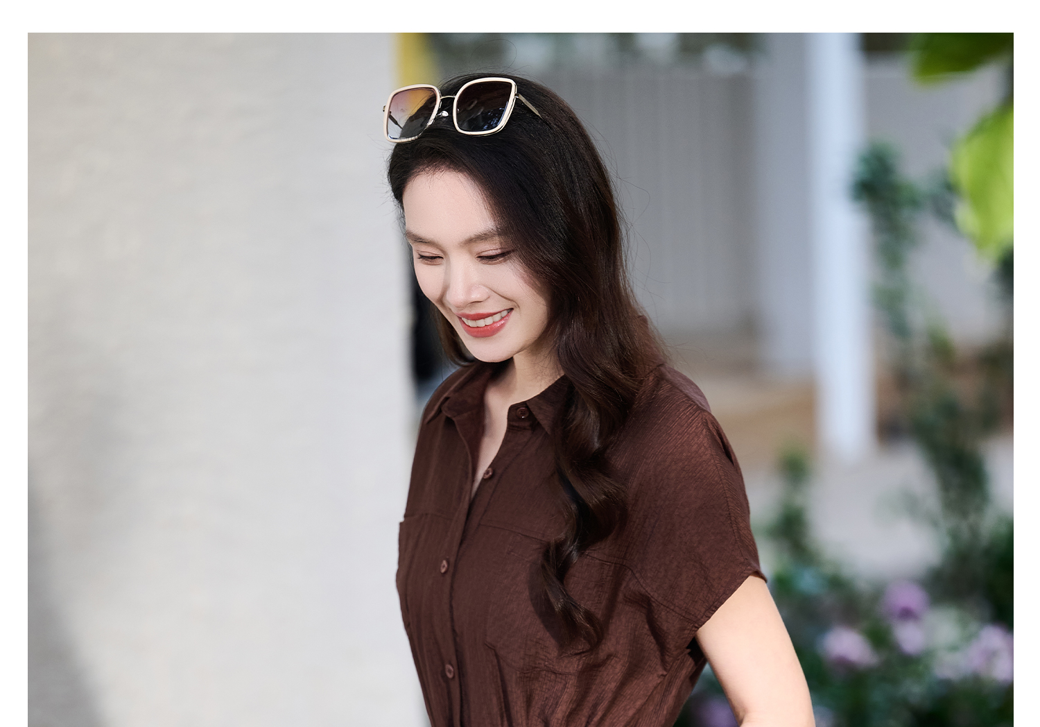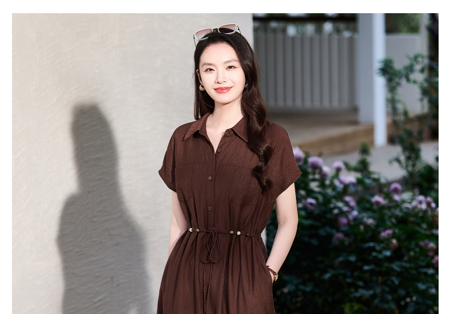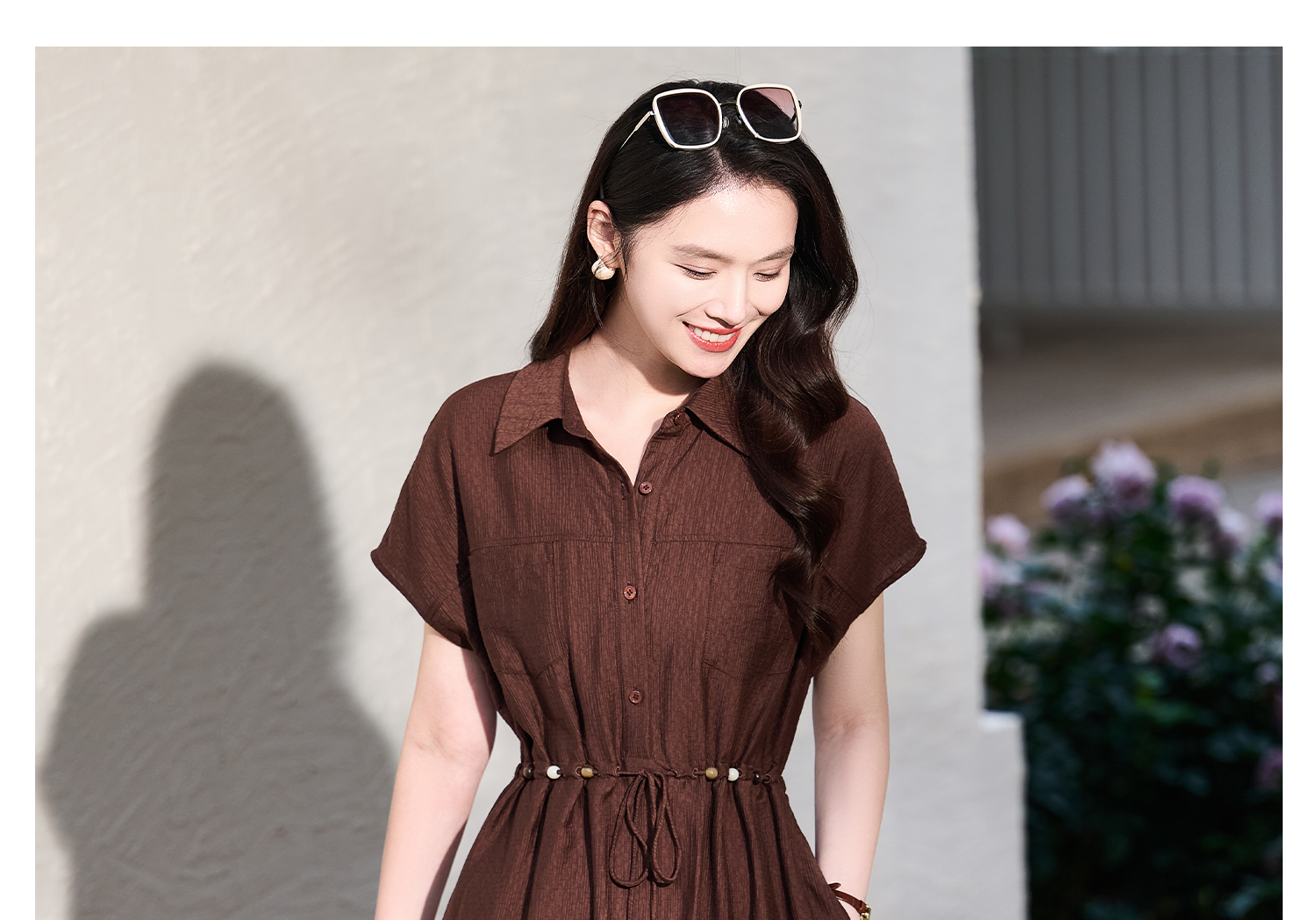 落日深棕调 复古氛围衬衫裙 肌理感天丝混纺 米思阳2026夏季新款优雅通勤衬衫连衣裙串珠腰带中长款A字裙女6152