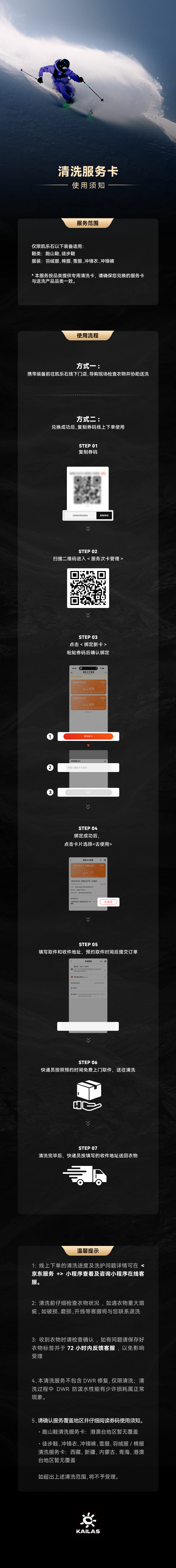 【方式一】兑换后90天内携带装备前往凯乐石线下门店,导购现场检査衣物并协助送洗;