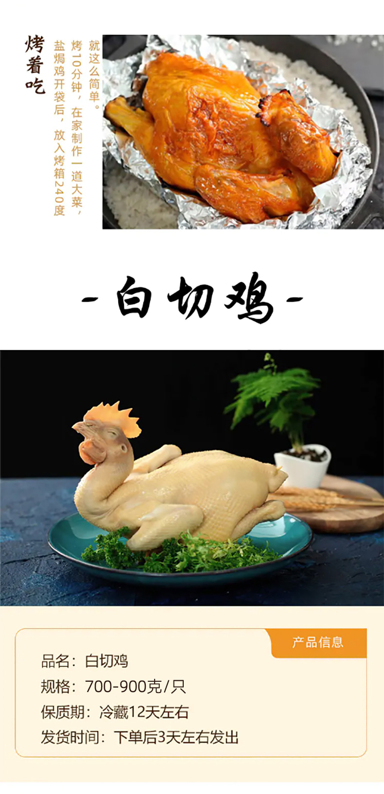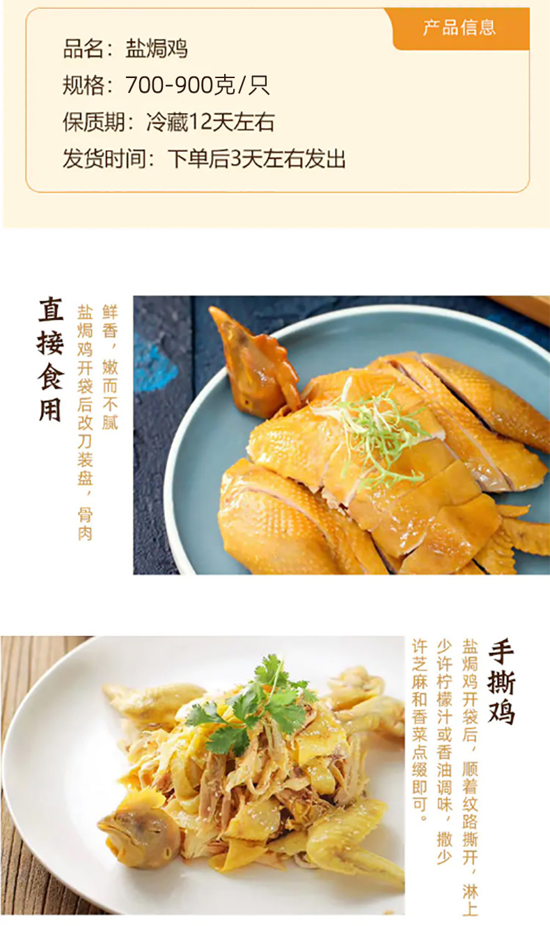 产品名称:鲜熟盐焗鸡/白切鸡产品规格:700-900g发货时间:下单后72小时内发货配送范围:上海全境及周边省市