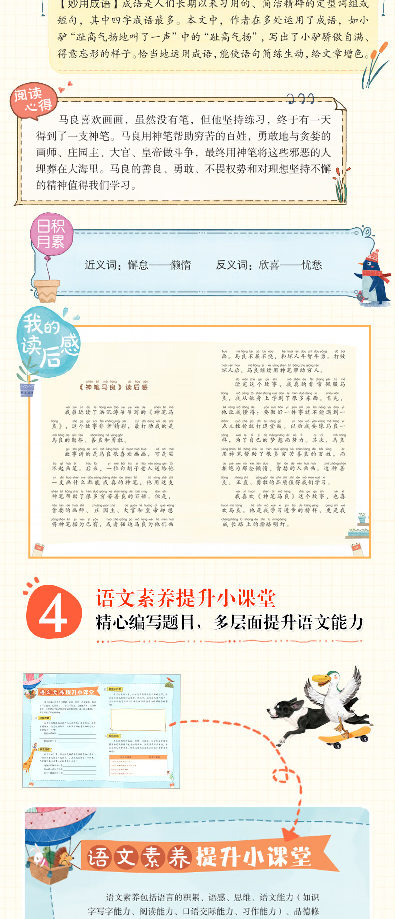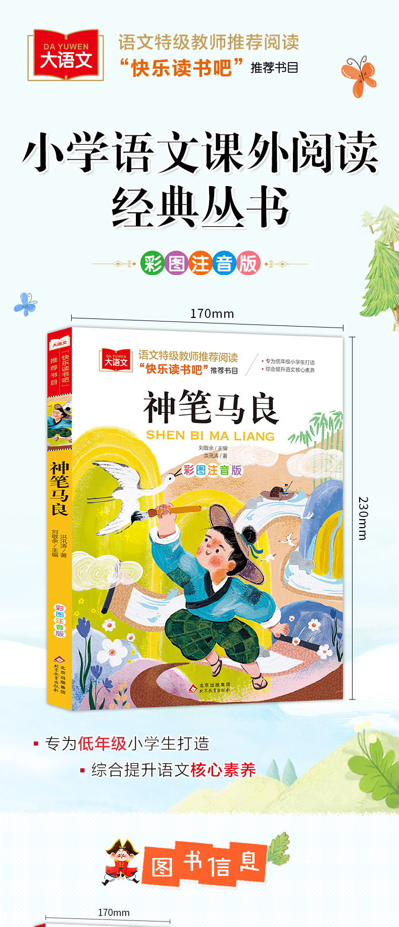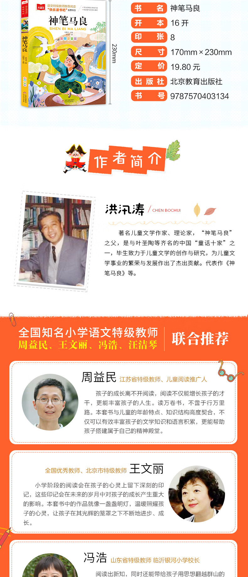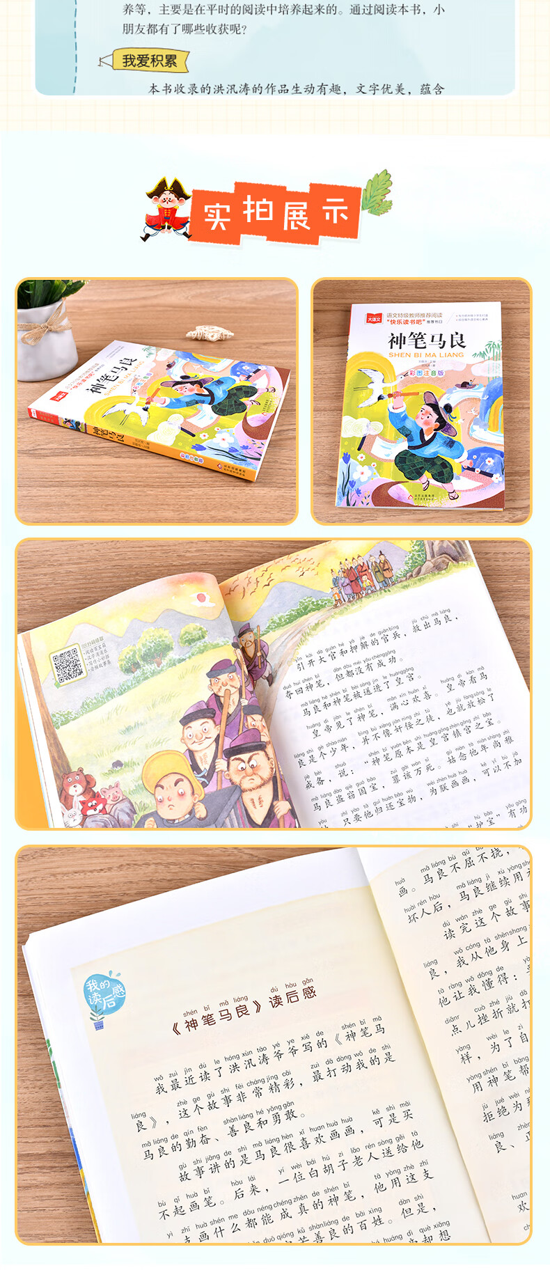 本书收录著名儿童文学作家洪汛涛的三个经典童话故事。其中,《神笔马良》讲述的是一个名叫马良的穷孩子,用神笔为穷苦善良的百姓画画帮助他们的生活,并用神笔惩罚恶霸贪官将他们葬身大海的故事;《三娃》讲述的是一个勇敢的放养娃不顾个人安危,最终打败邪恶的蛇妖,救出全村的羊的故事;而《大奖章》这篇童话,则讲述了不擅长赛跑的小熊和小猪坚持不懈练习赛跑,不服输不放弃,最终在赛跑比赛中赢了骄傲自满的小驴的故事。这些作品语言优美,寓意深刻,对孩子而言,是非常值得一读的经典。
