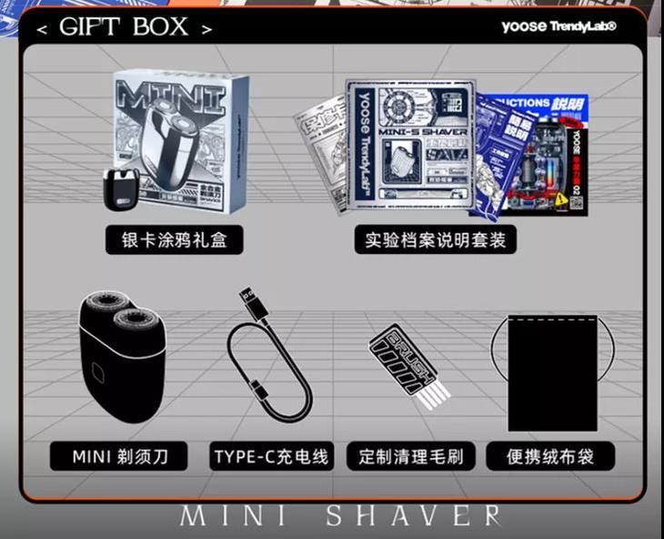 一套包含:银卡涂鸦礼盒+实验档案说明套装+mini剃须刀+type-c充电线+定制清理毛刷+便携绒布袋。