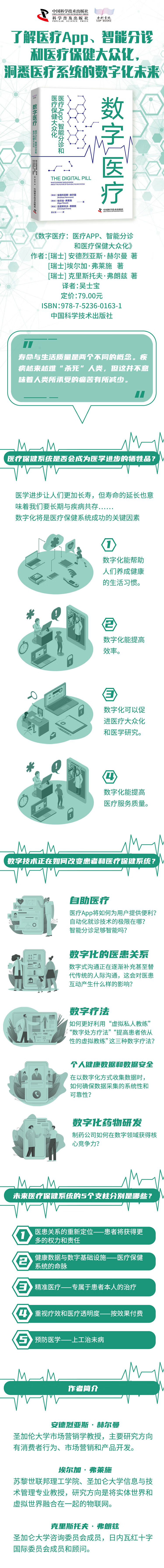 医疗系统的数字化转型还需要文化上的变革,要求人们从全局视角,从旁观者的角度看待这个问题。这也是这本书值得人们认真研读的地方。作者遵循黑格尔辩证法,运用通俗易懂的语言分析了全世界医疗保健系统的现状,并结合老龄化人口日渐增多、非传染性疾病日益流行的背景,探讨了医疗保健系统在应对疾病预防、治疗和费用激增问题上的现实能力。本书还总结了数字技术在健康维护和治疗领域的巨大潜力,并以此为基础,描绘了医疗系统乐观而又现实可行的图景,预言它将克服现有的困难,像浴火的不死鸟一样,在灰烬中重生。书中提到的世界各地的生动案例,为本书增添了许多色彩。作者通过案例,总结出了25种解决问题的方法,本书将其称之为“应对模式”。综合运用这些模式,我们可以提高医疗保健系统的复原力、适应性和灵活性,为患者带来更多福祉。值得一提的是,全世界医学和健康数字化领域已经呈现出一派推崇创新、锐意进取的景象。本书还探讨了与新技术相关的潜在风险问题。毕竟,任何一项新事物都有积极和消极两方面的影响。针对后者,人们必须采取适当的措施加以应对。另外,人们还必须对实施、拖延和放弃医疗系统数字化转型的风险进行综合考量。