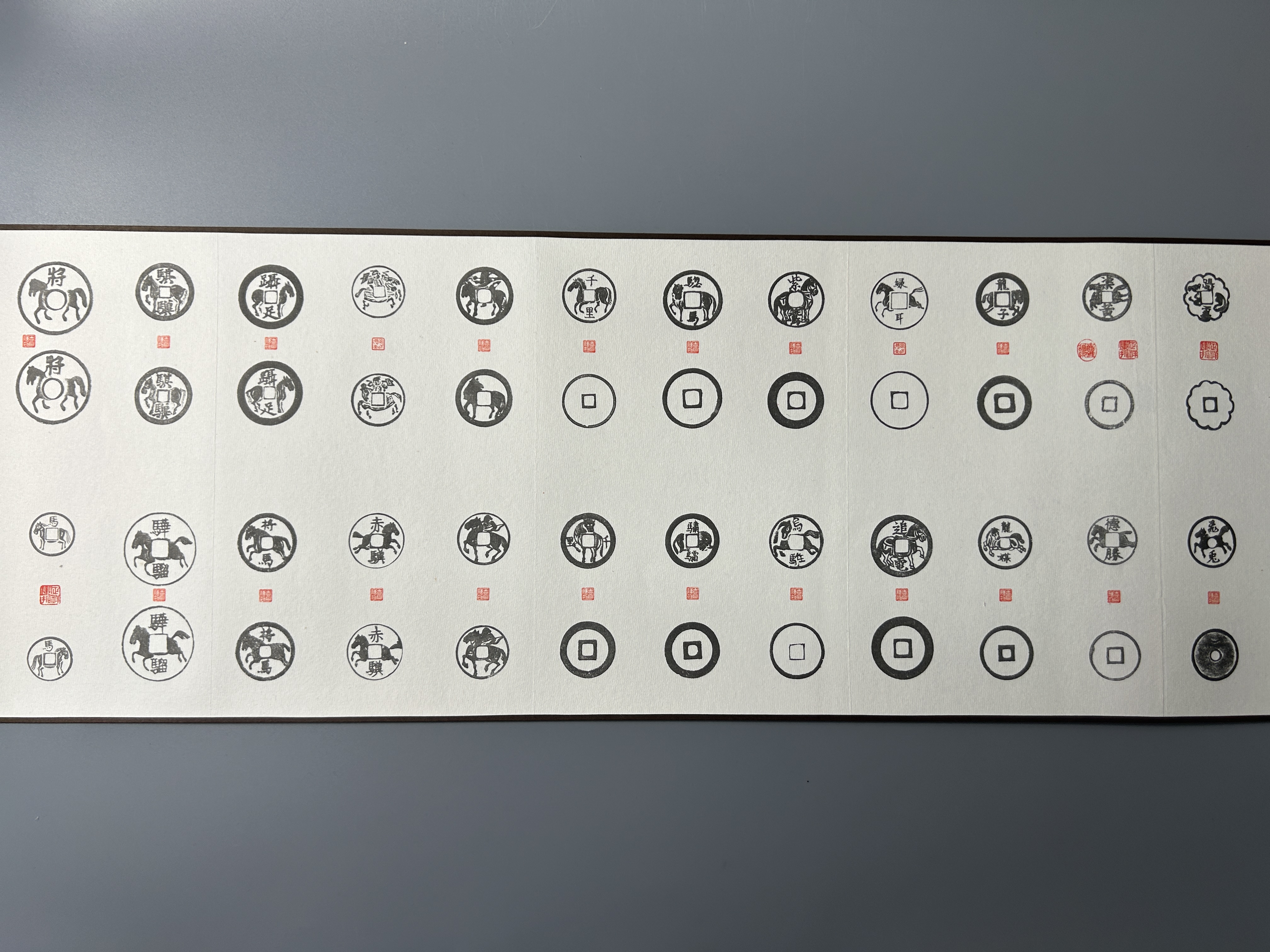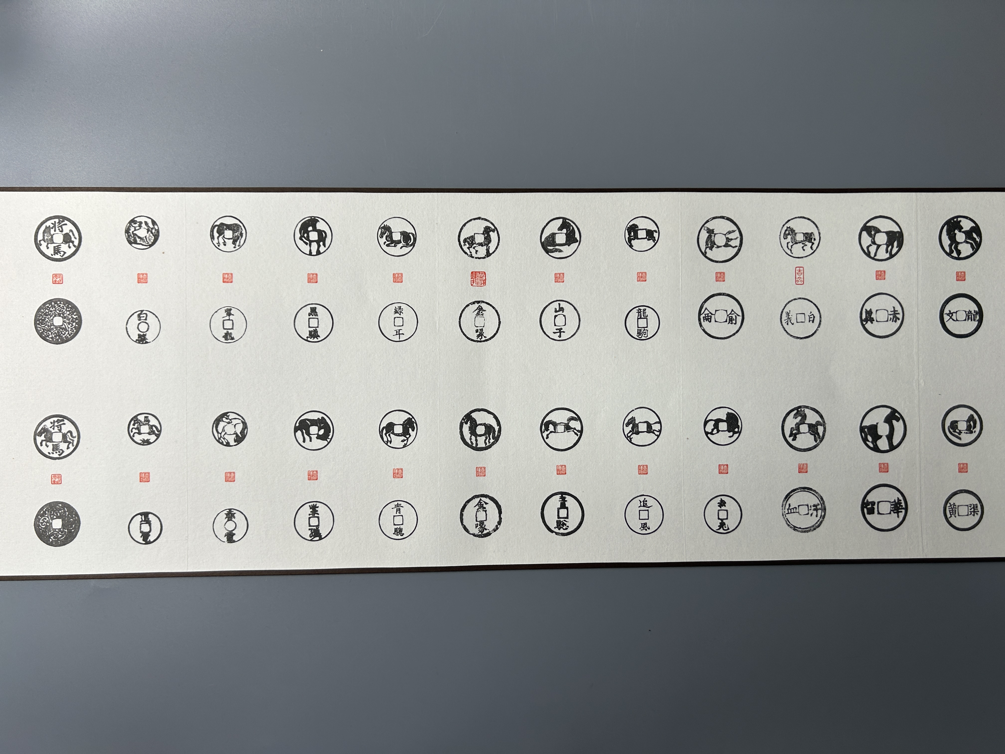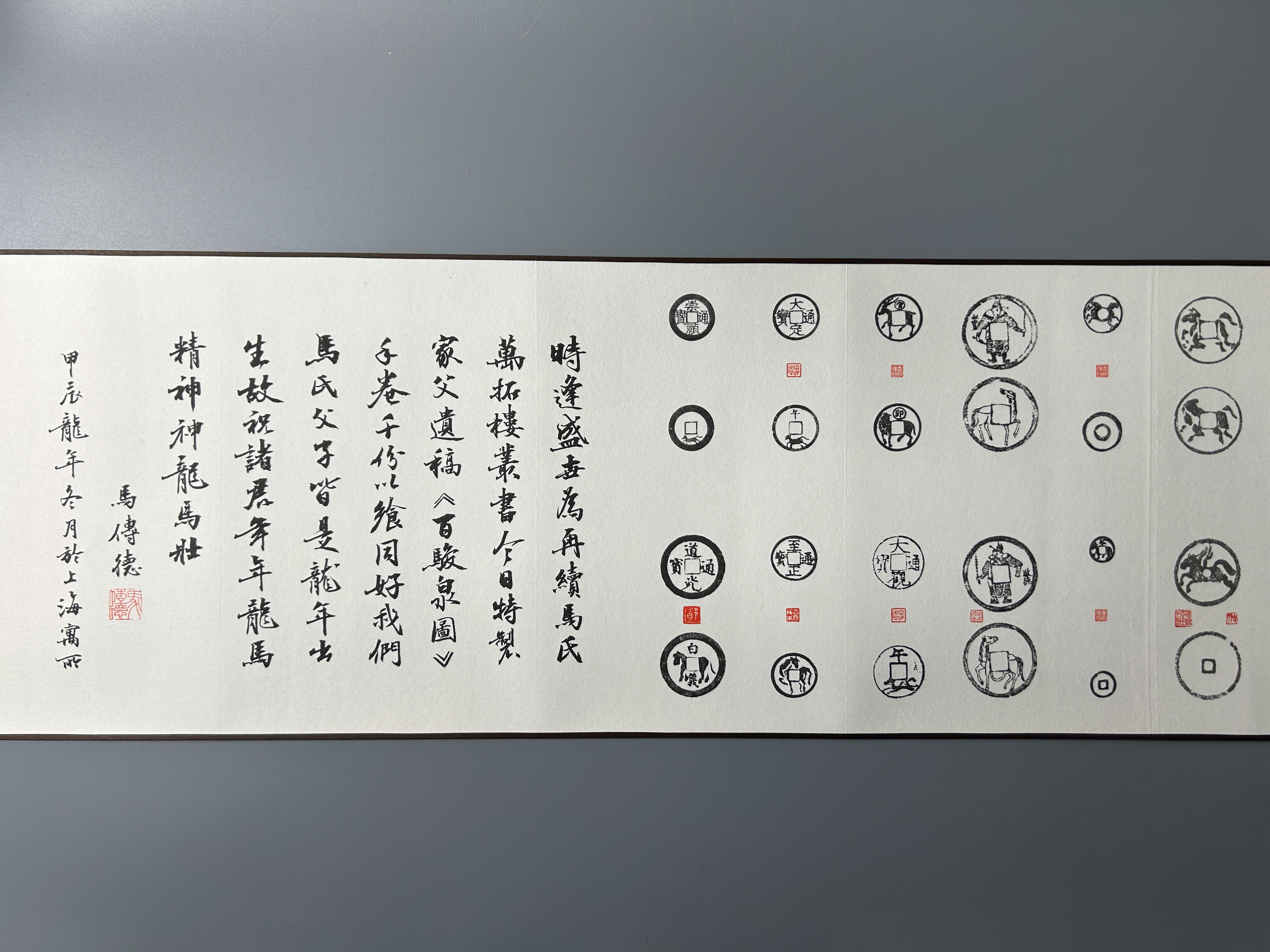 马钱,亦称“打马格钱”是中国古代压胜钱的重要组成部分,其面文多以历史名将为文,背面则铸有形态各异的马形图案。据说这种“打马格钱”始于宋代,作为博弈戏玩之物。北宋著名女词人李清照《打马图经》书中曾详细地介绍了这种游戏的规则,并称之为“博弈之上流,闺中之雅戏”。上世纪90年代末钱币大师马定祥与其次子马传德共同编纂《百骏泉图》,甄选历代珍稀马钱百品。虽已成手稿,但未正式发行。三十年后,重编马氏万拓楼丛书,《打马泉图》付梓之际,特制宣纸“百骏泉图”拓片超长手卷,并配以朱印。卷名采用马师的题字,卷末有马传德先生撰写的后记。“時逢盛世,為再續馬氏萬拓樓叢書,今日特製家父遺稿《百駿泉圖》手卷千份,以飨同好。我們馬氏父子皆是龍年出生,故祝諸君年年龍馬精神,神龍馬壯!” 手卷长3.2米,蔚为壮观。这幅马老亲选马钱拓图,是中国历代马钱的集大成者,通过高清宣纸影印复现了马老原作的笔墨精神,限量1000张,编号发行。适宜家居、办公场所装饰使用,也是馈赠亲朋、礼尚往来之佳品!2026年丙午马年是钱币大师马定祥先生诞辰110周年,也是迎接新年的馈赠或点缀家具之上品。适宜悬挂家居室、办公场所、古玩店铺,也是馈赠亲朋、往来之美的好礼