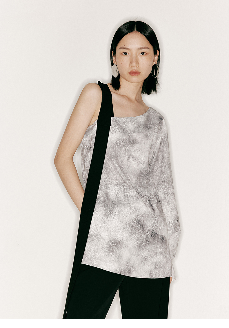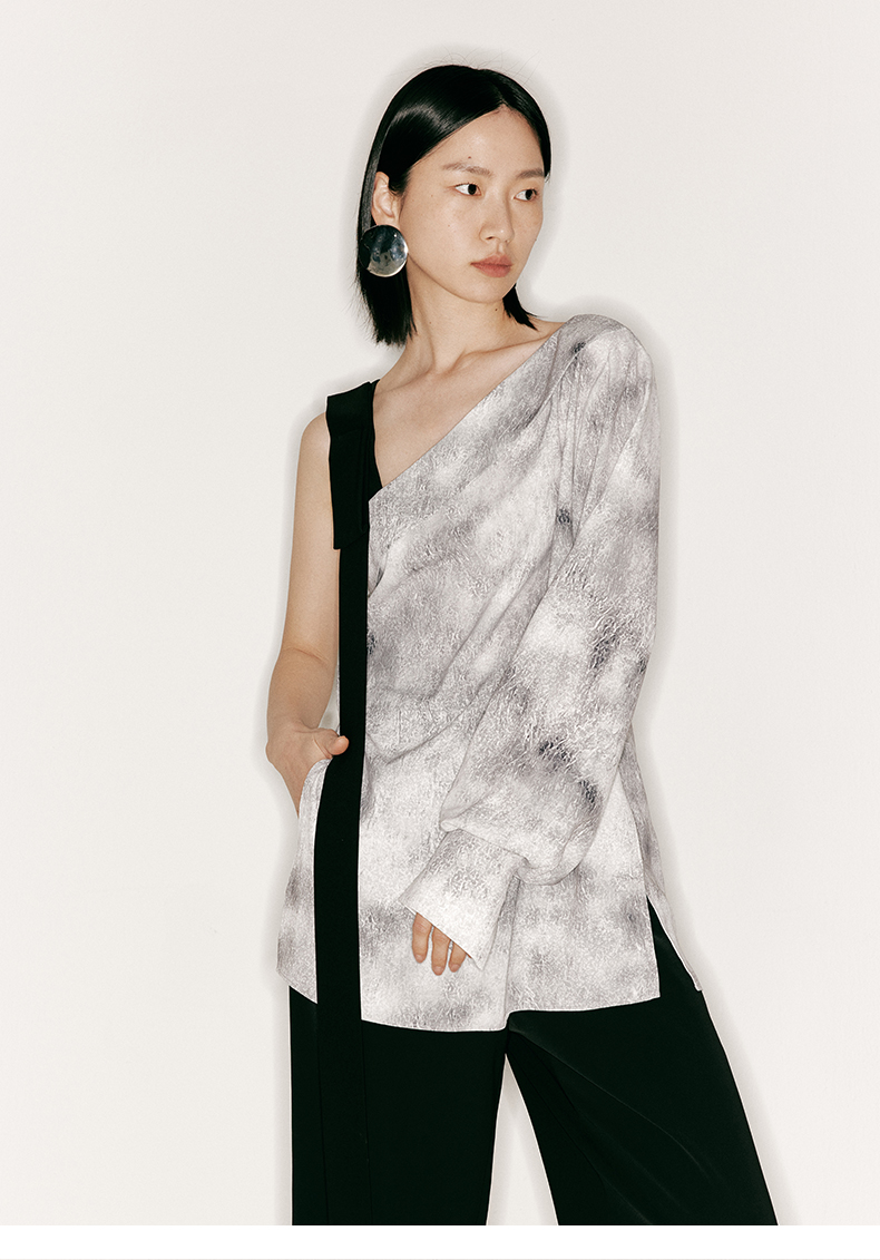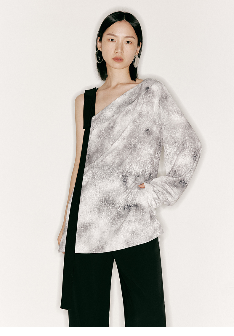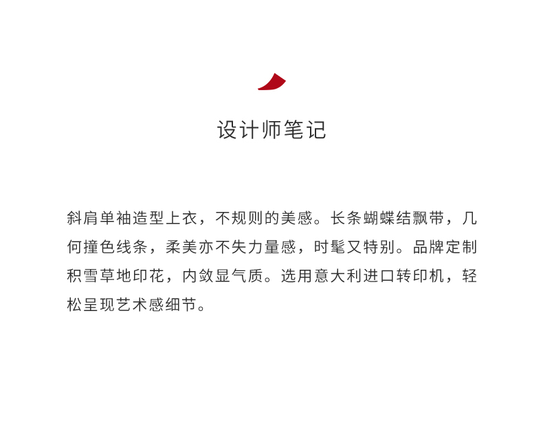 【理想后花园】品牌定制印花方条蝴蝶结飘带斜肩单袖上衣/230023B