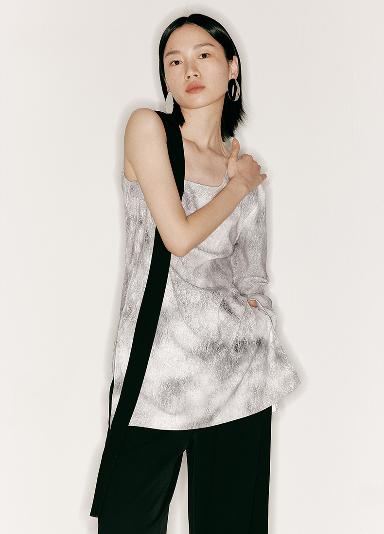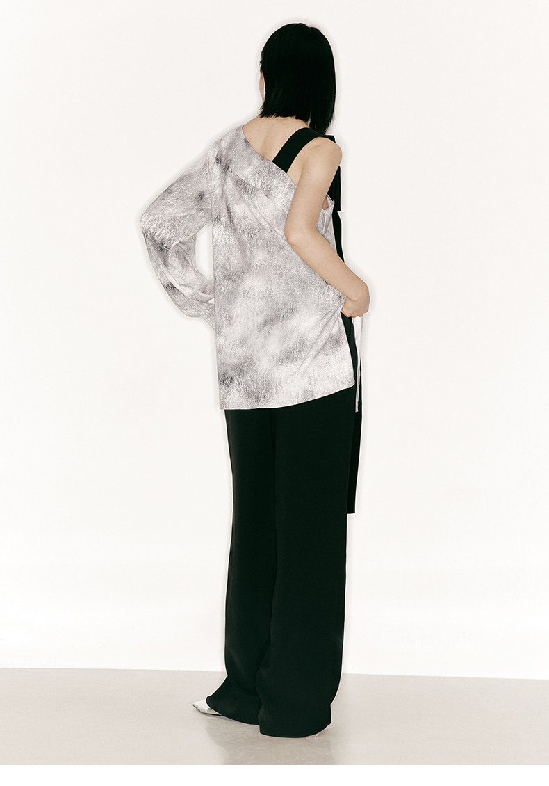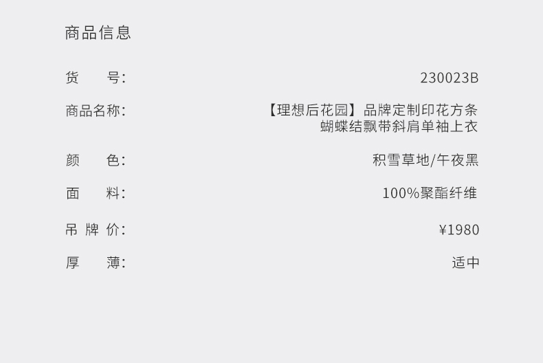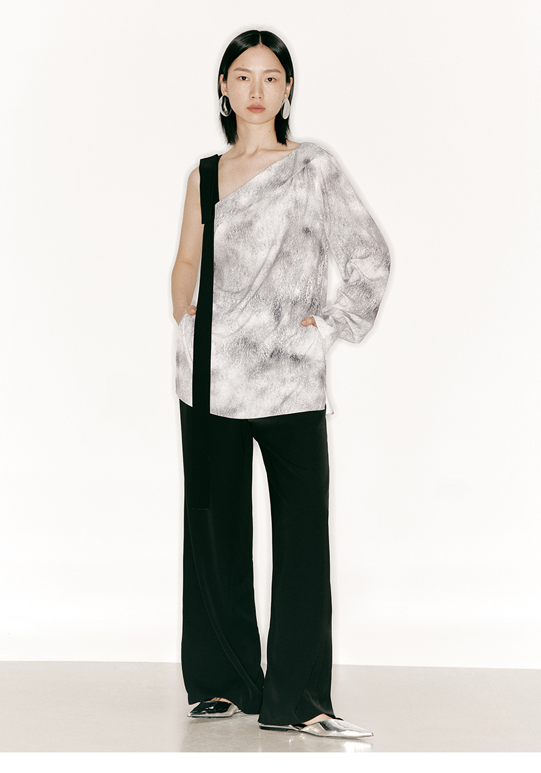 【理想后花园】品牌定制印花方条蝴蝶结飘带斜肩单袖上衣/230023B