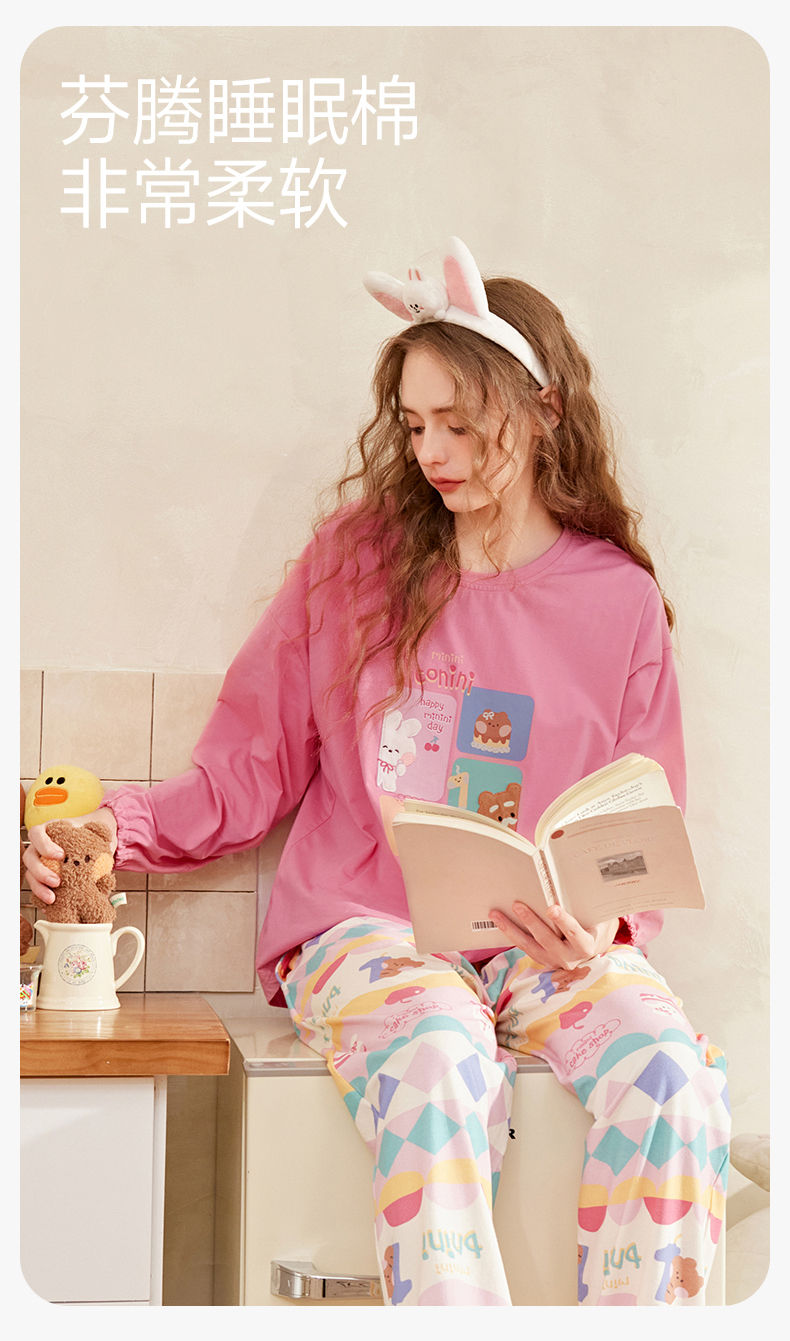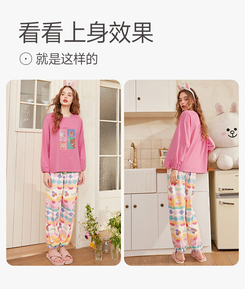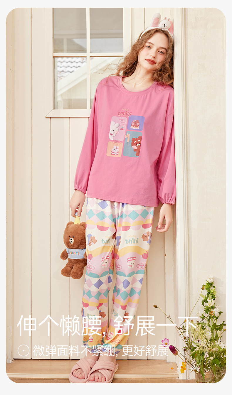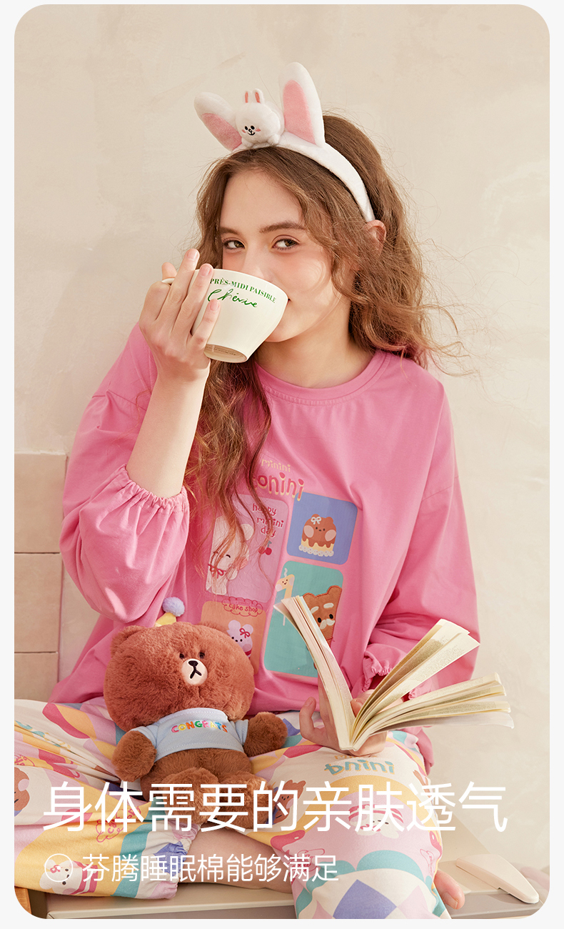 芬腾布朗熊睡衣女纯棉春秋季圆领套头长袖可爱卡通全棉家居服套装