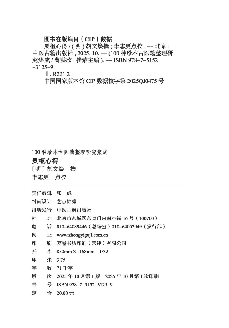 书名:灵枢心得 100种珍本古医籍整理研究集成