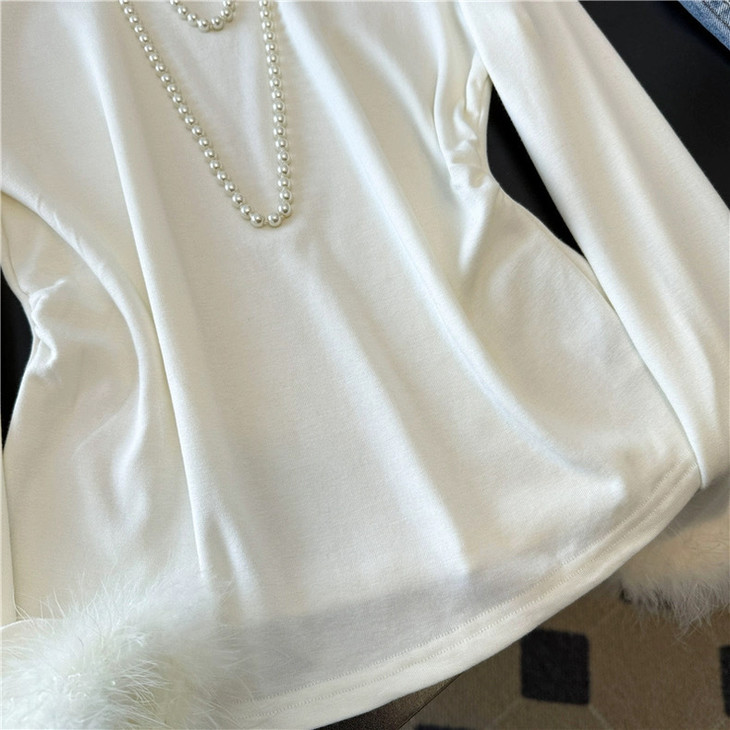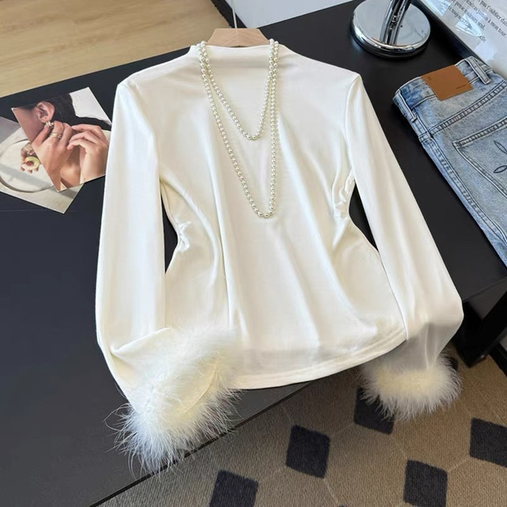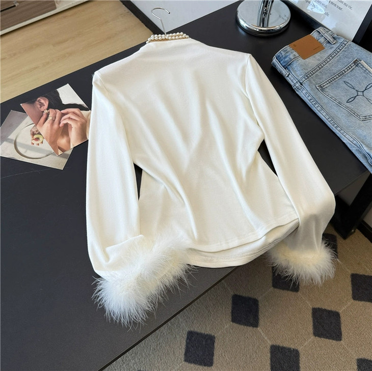 新中式国风高领毛毛袖打底衫ACU091303:白色,黑色