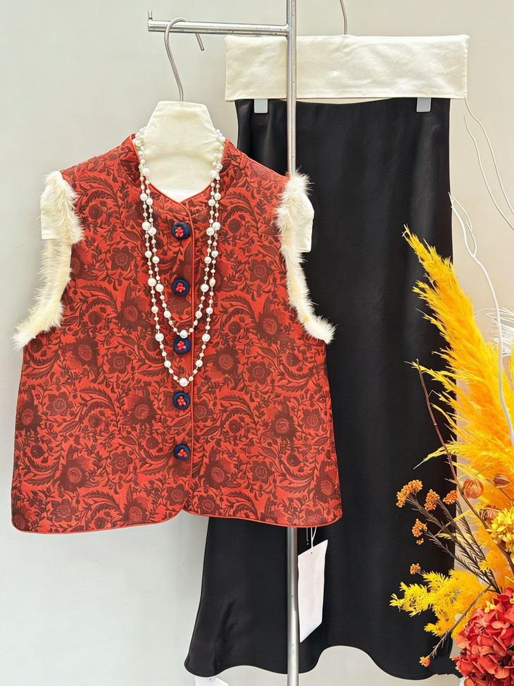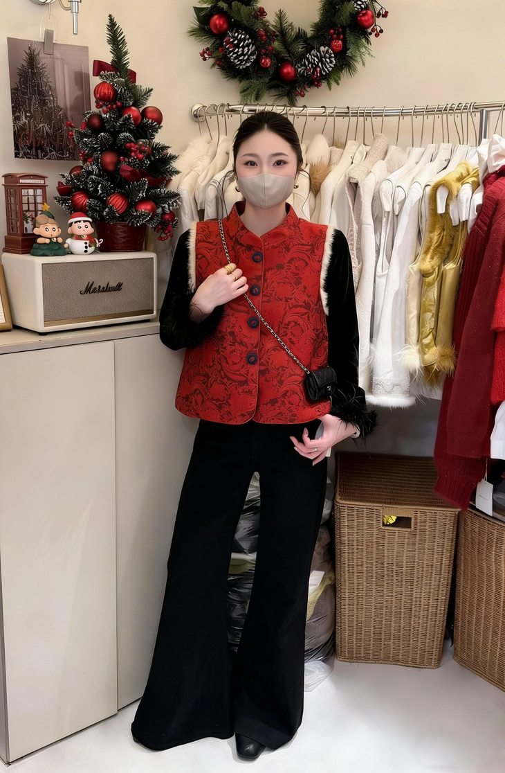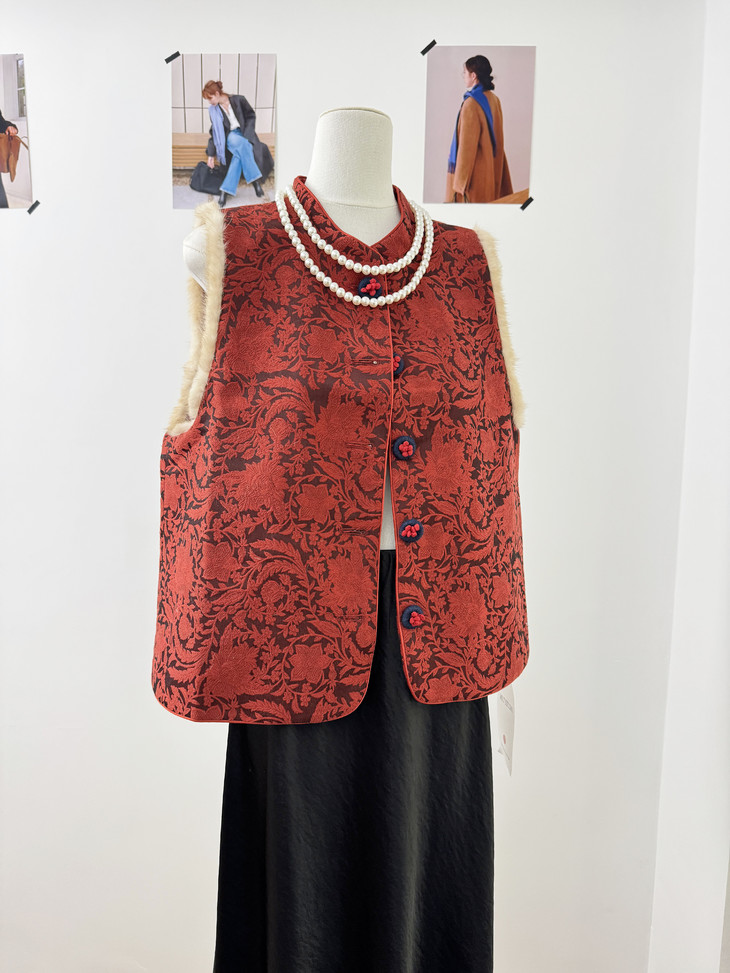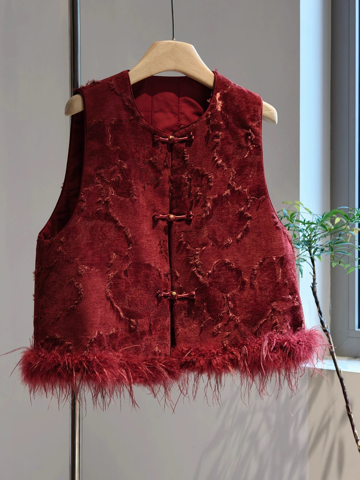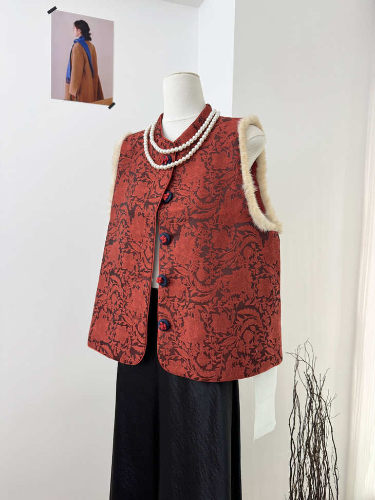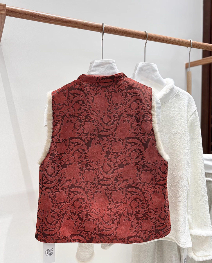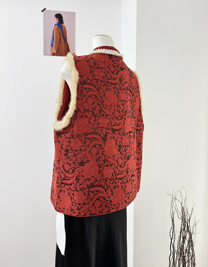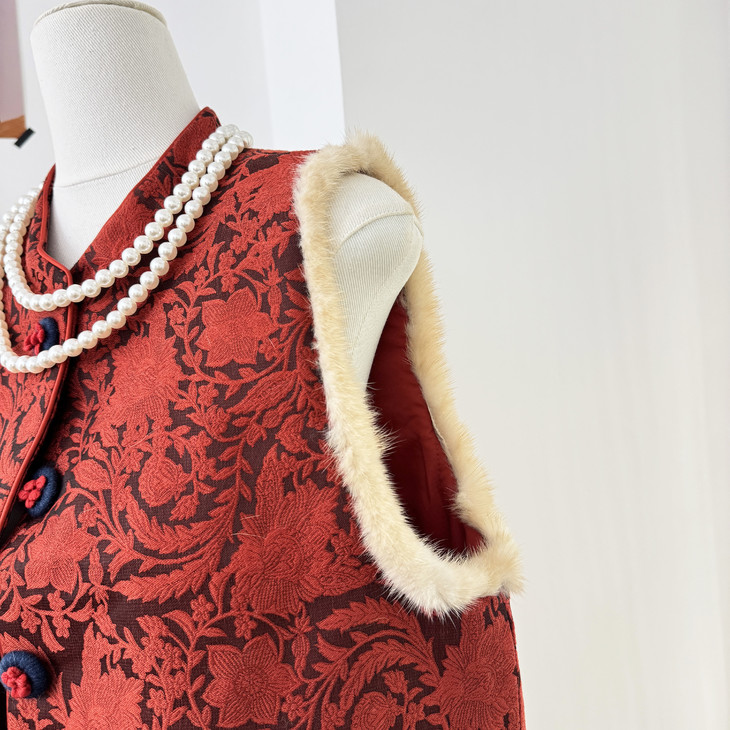 🔺款式3-【红色提花水貂毛毛马甲】 这款今年很爆的新年款式 圣诞红,新年红 ✅定制浮雕红色卷草提花,内里夹棉则选用黑色来呼应花色 ✅手工绕线打籽绣花扣,超级惊艳,很少见的传统工艺的传承运用,很有创意 ✅袖圈的水貂毛装饰,增加美观和温暖感, ✅唐装立领设计,直身剪裁,不挑身型,得体优雅