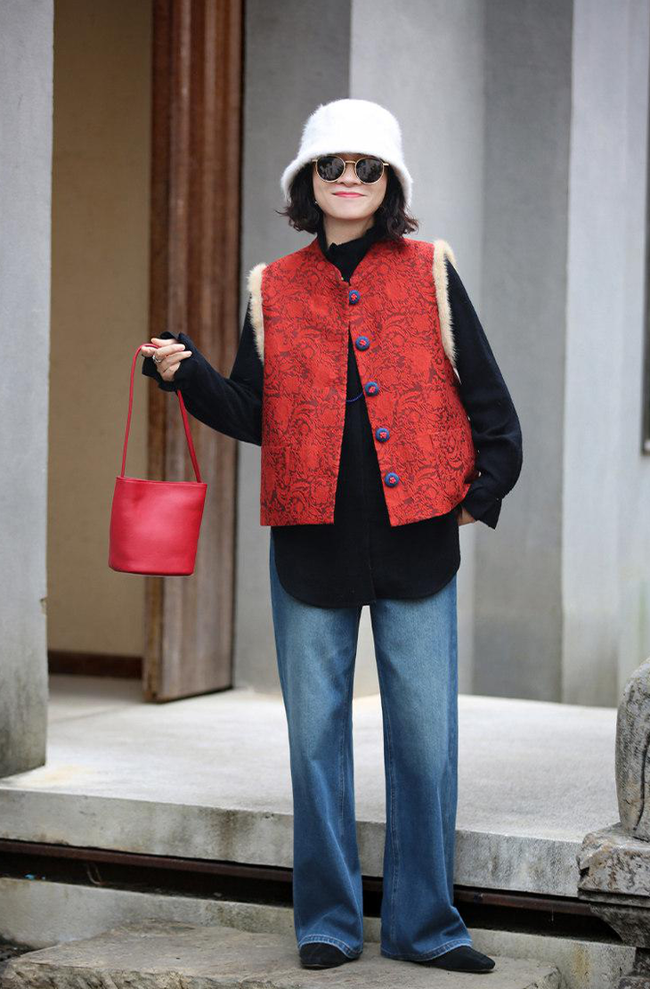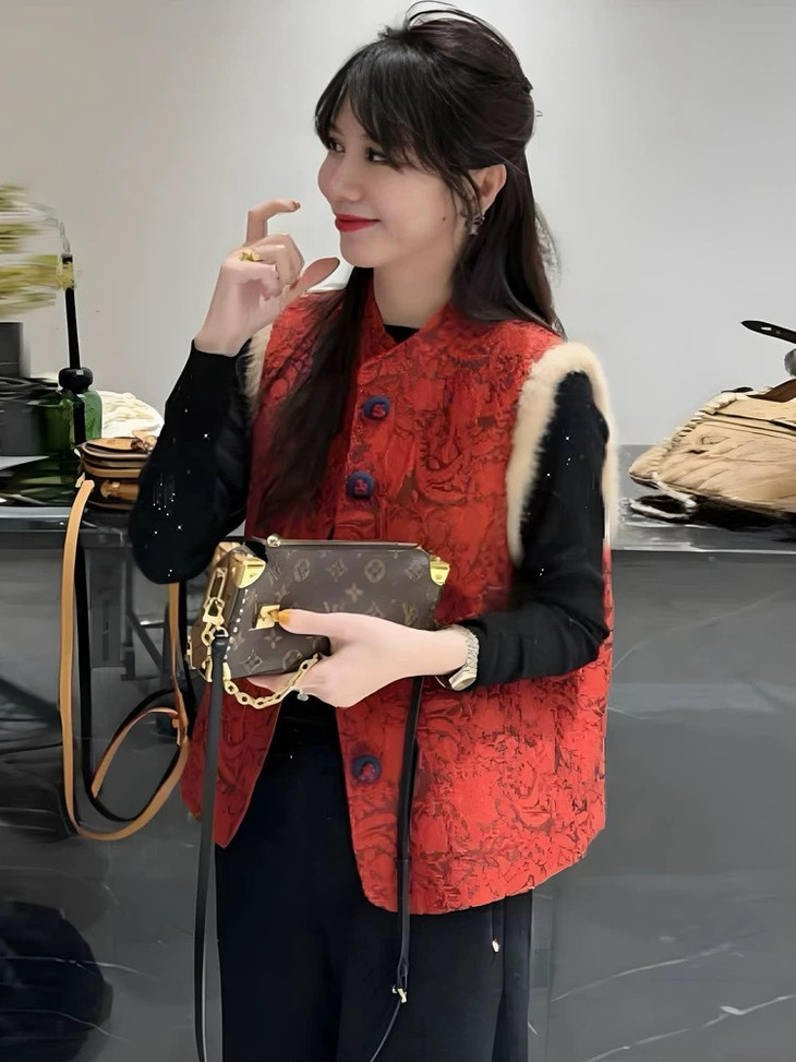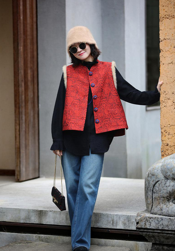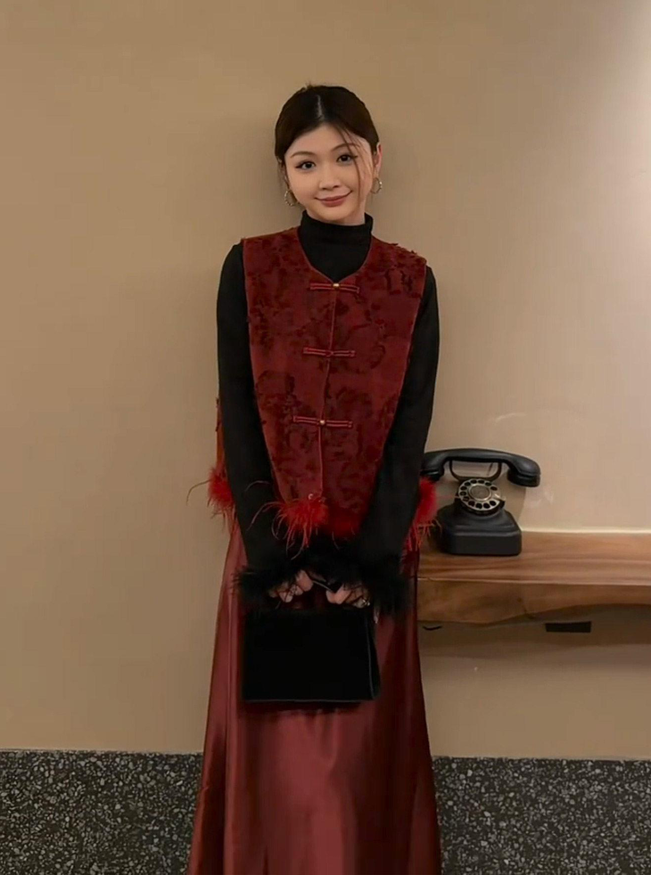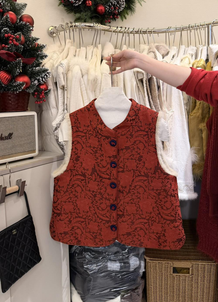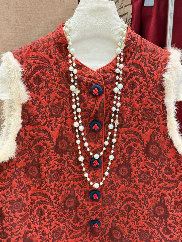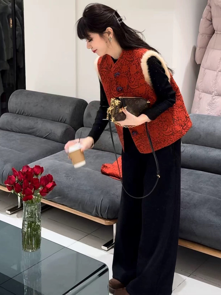 🔺款式3-【红色提花水貂毛毛马甲】 这款今年很爆的新年款式 圣诞红,新年红 ✅定制浮雕红色卷草提花,内里夹棉则选用黑色来呼应花色 ✅手工绕线打籽绣花扣,超级惊艳,很少见的传统工艺的传承运用,很有创意 ✅袖圈的水貂毛装饰,增加美观和温暖感, ✅唐装立领设计,直身剪裁,不挑身型,得体优雅