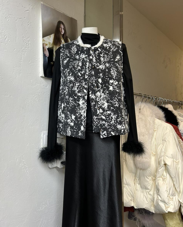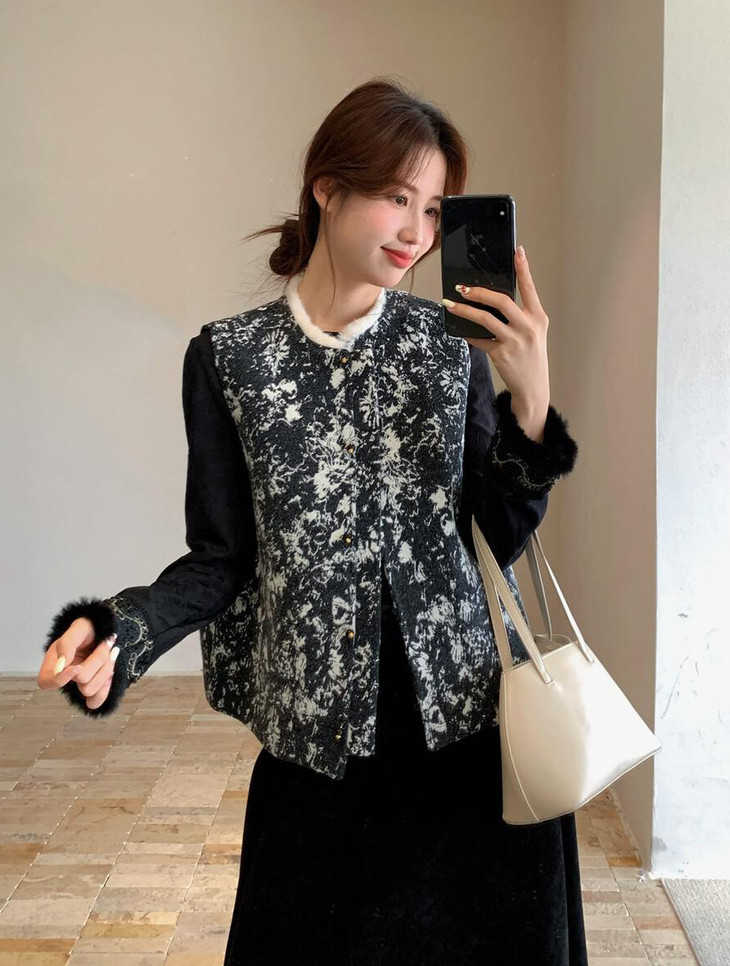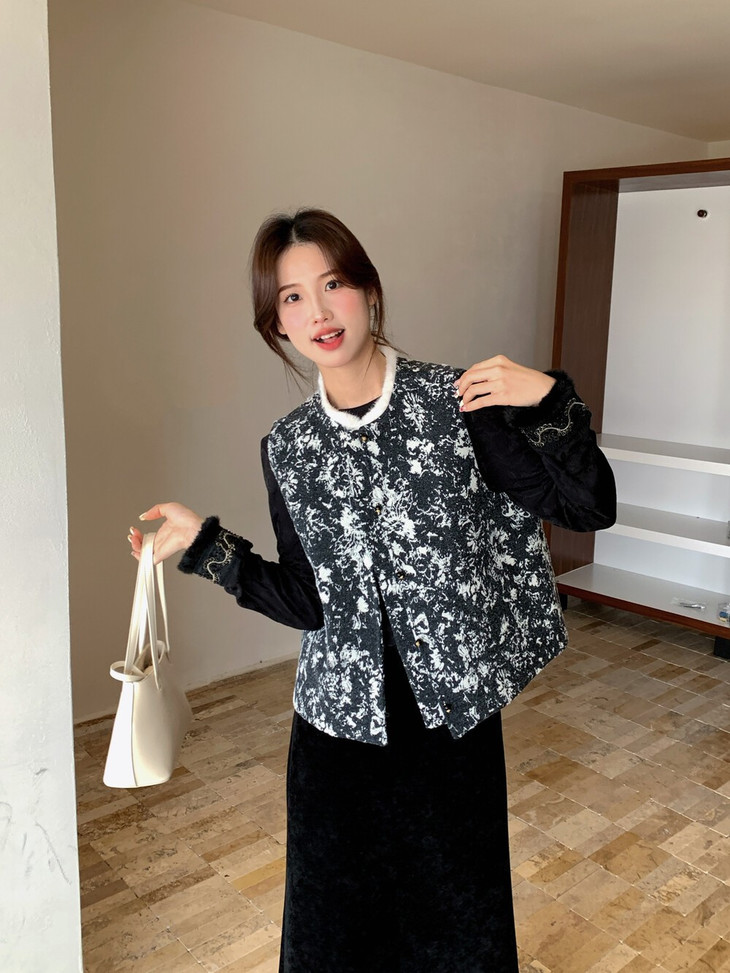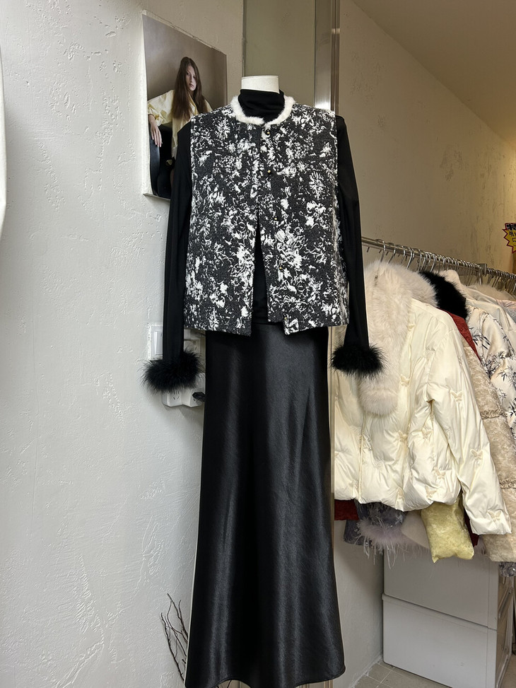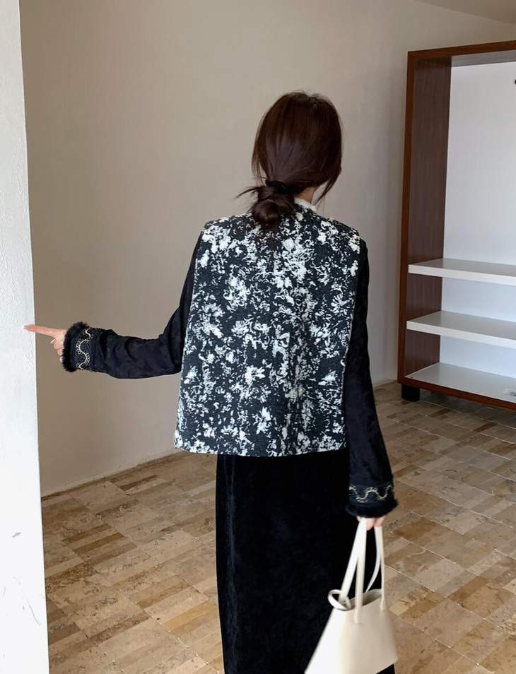 🔺款式4-【水墨画提花毛毛马甲】 这款非常有艺术气息 ✅图案是定制的水墨画提花,非常的有写意的美感 大部分的留白很有东方意境 ✅整个袖圈门襟下摆,足足2米多,制作非常的耗时 ✅手工盘扣用金色跟盘扣装饰,黑金组合,高奢配色,点睛之笔 ✅领口毛毛也是定染的白色,整体搭配的非常和谐有力度