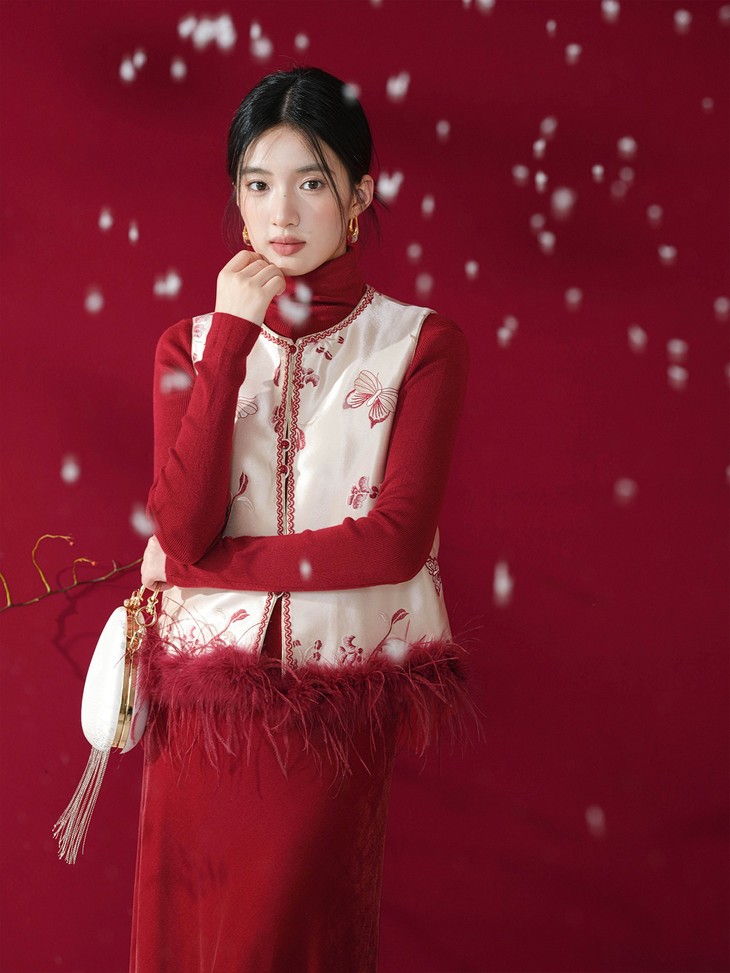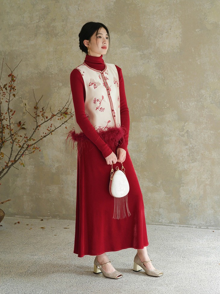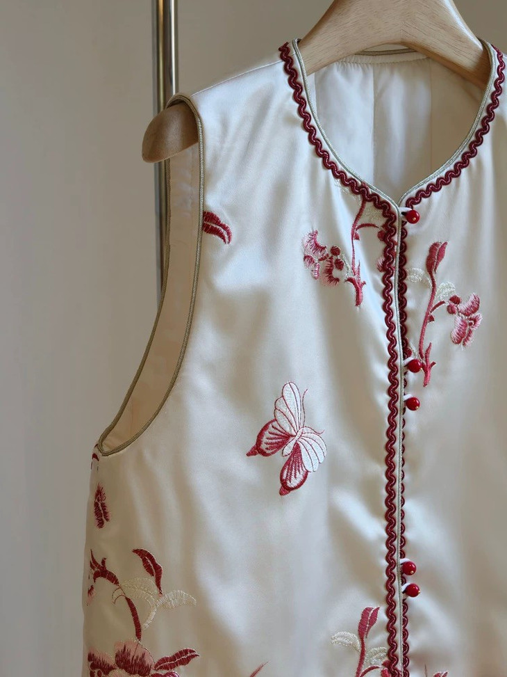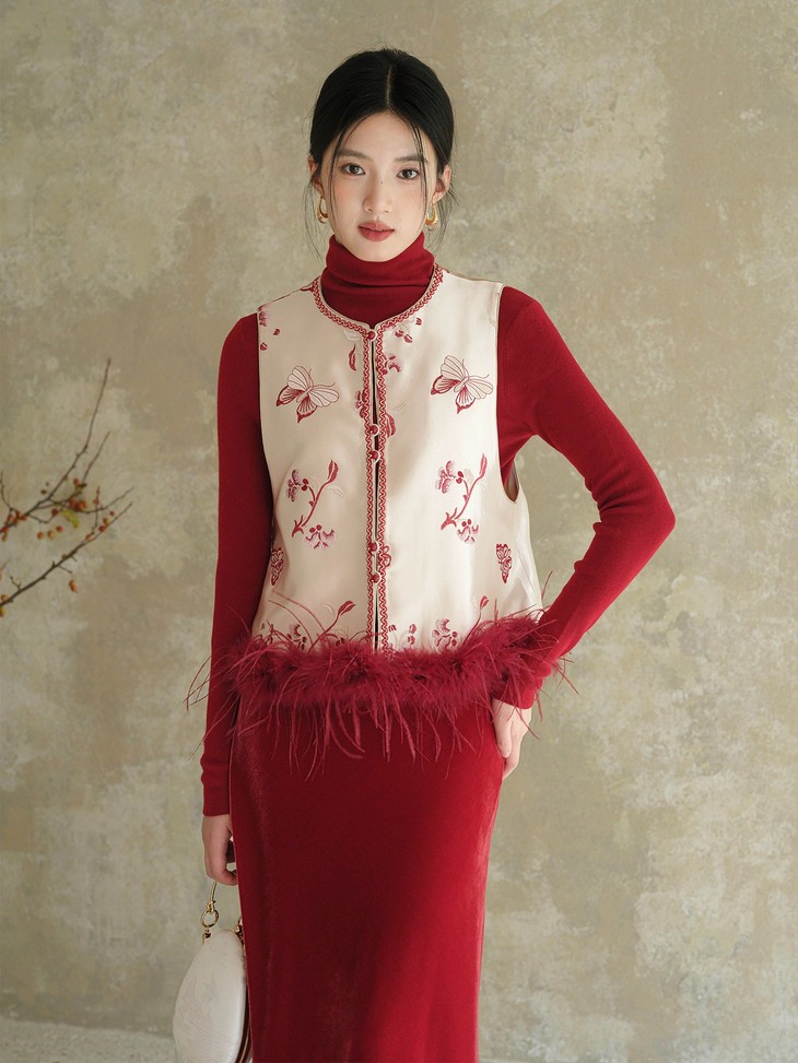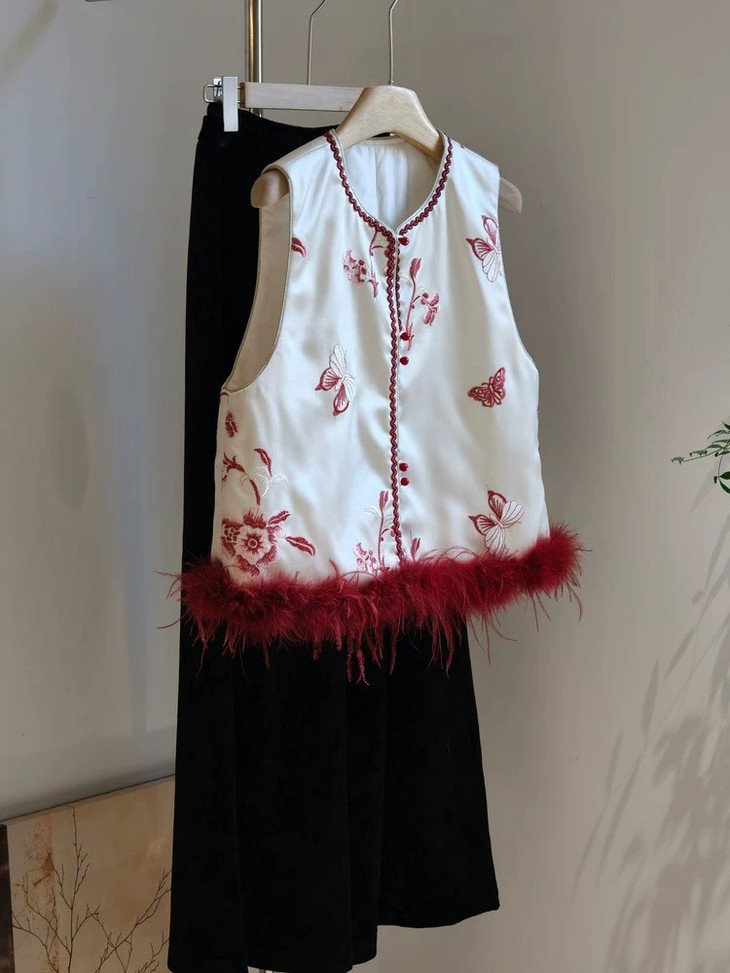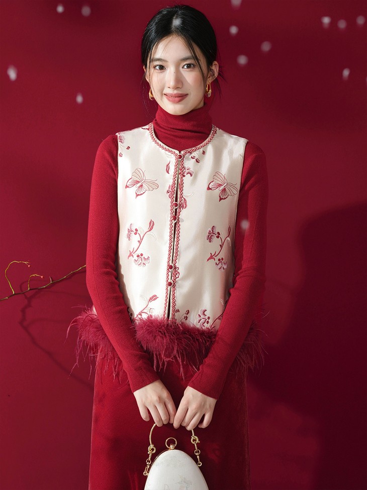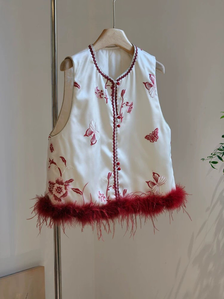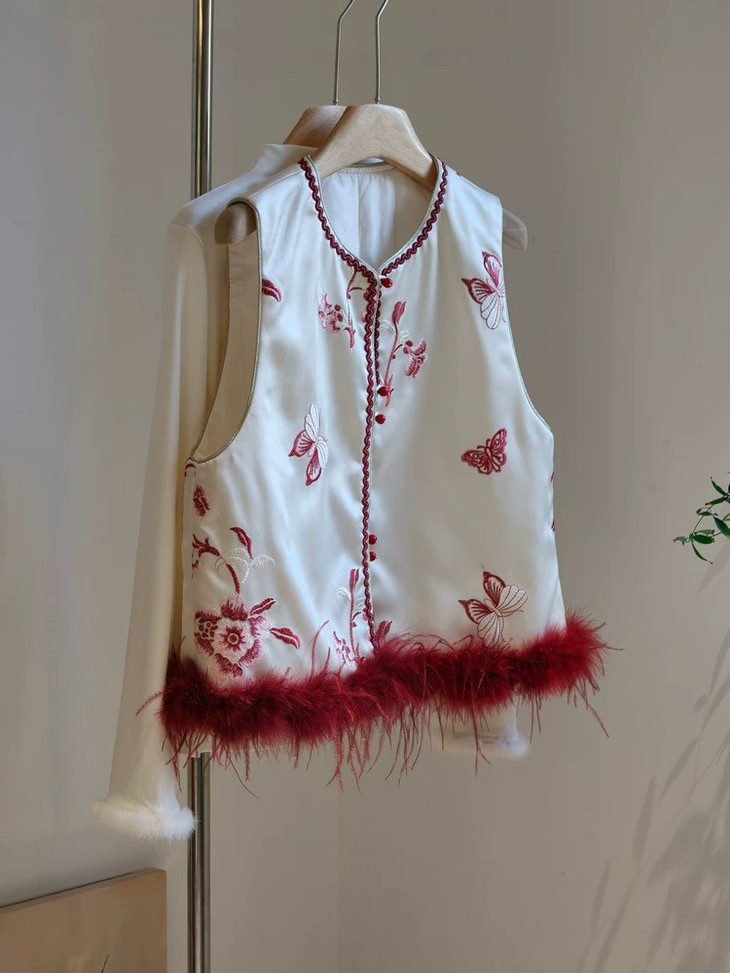 款式介绍 🔺款式1-【国风蝴蝶红色驼鸟毛马甲】 ✅米白色暗纹提花布底,珍珠般温润光泽 手工珠绣小蝴蝶点缀,很有灵动的诗意和精致感 ✅鸵鸟毛成品染色,和大身顺色, 颜色很温柔,淡雅气质 ✅缝边用传统镶边工艺,无比精美,耐得住近看 绝美的非遗工艺,一看就是很有价值感的大制作 懂得都懂!!