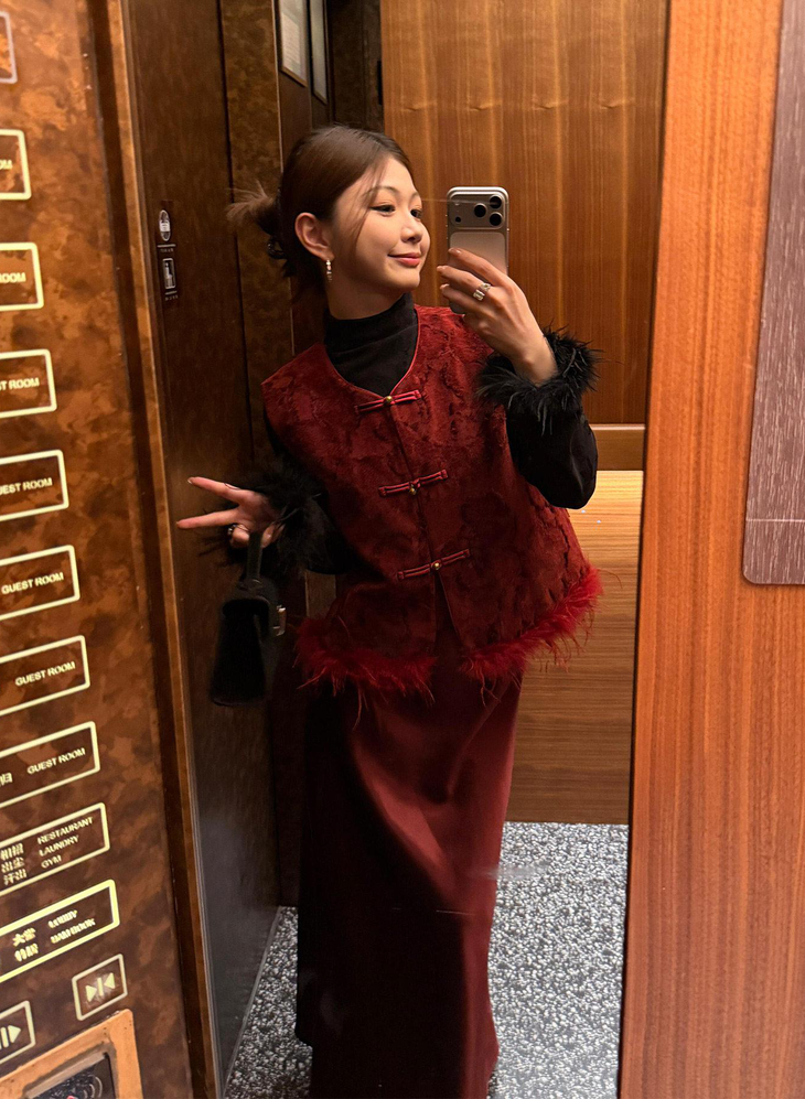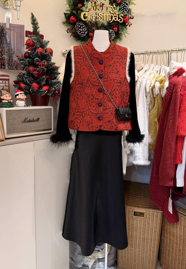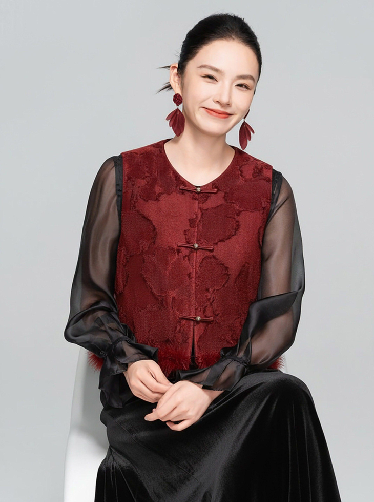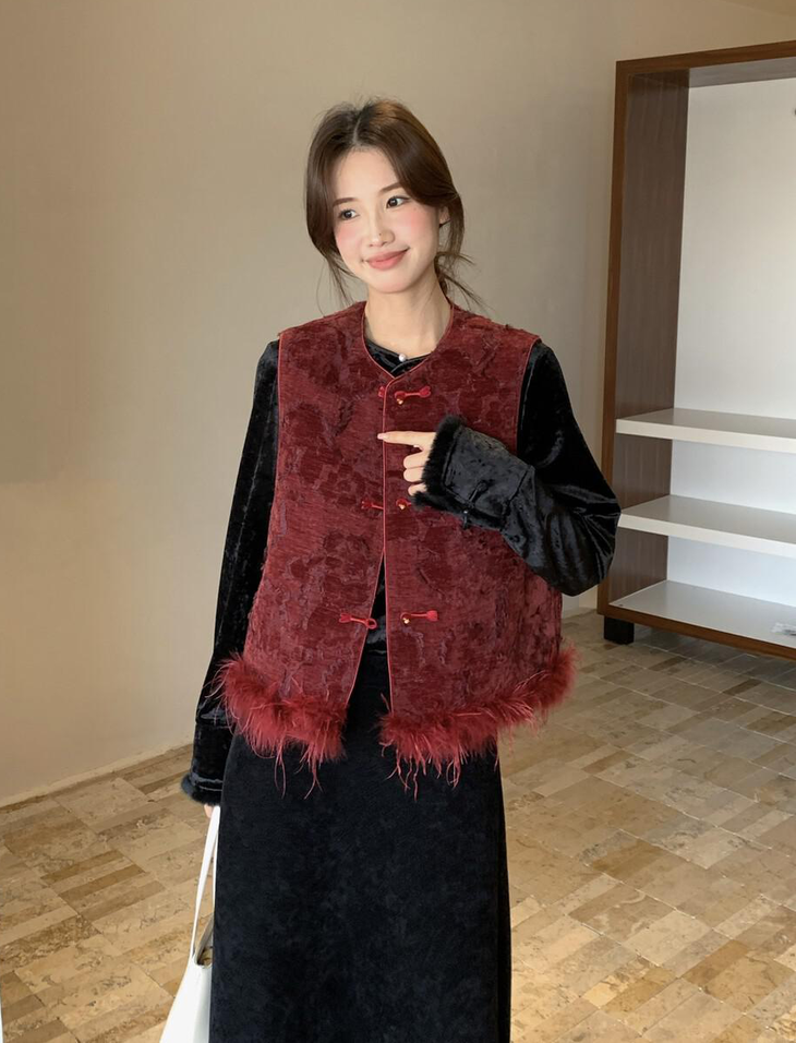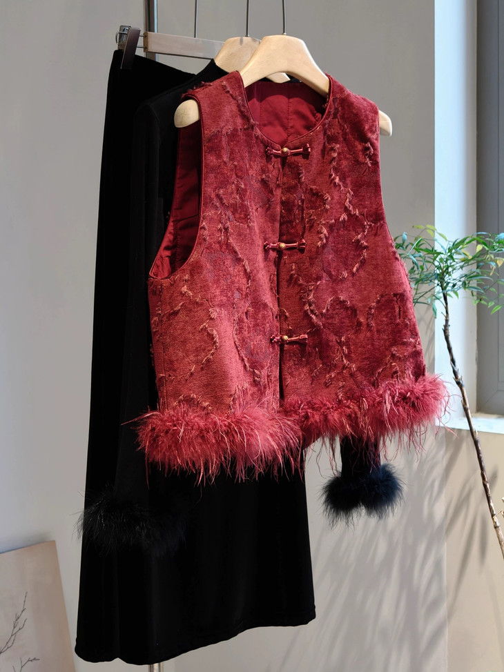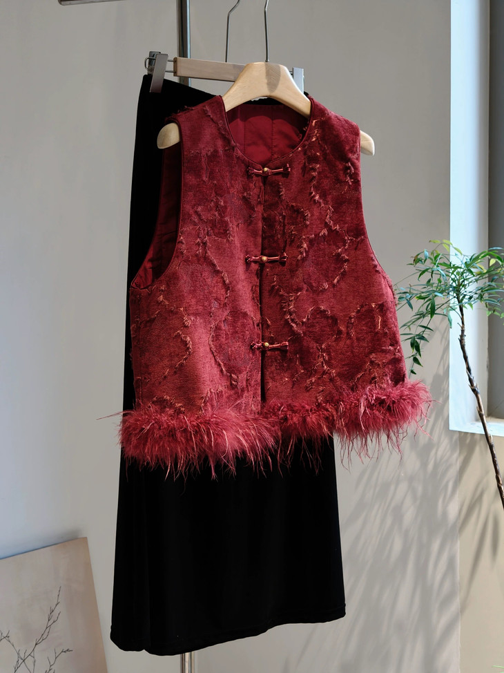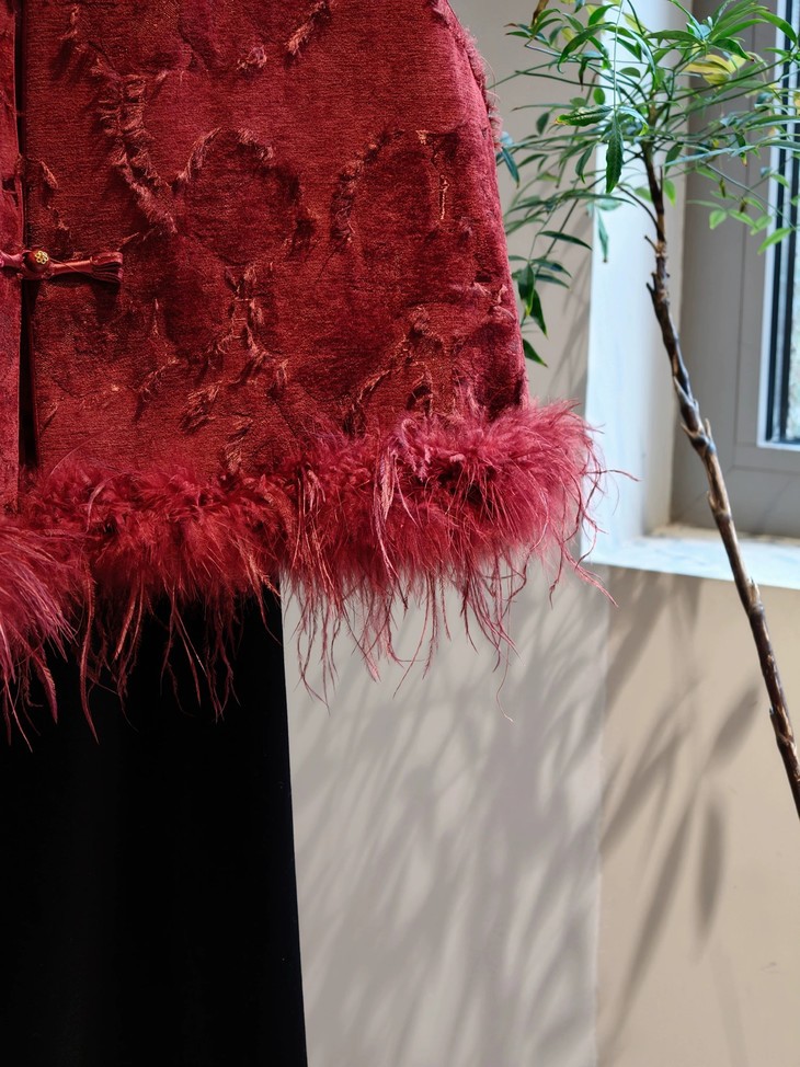 🔺款式2-【红色剪花毛毛马甲】 此款非常的喜庆,适合圣诞节/元旦/新年/婚礼撑场面 ✅剪花效果很出彩,材质的碰撞对比,加上流苏的毛边,很有肌理层次 ✅下摆的鸵鸟毛条定染红色,和大身剪花流苏相呼应,毛毛轻盈飘逸,很有仙气,红色烈焰般具有风情和节庆的氛围 ✅内里夹棉和盘扣,门襟,袖口的镶边全部制定的红色顺色 整体手工价值感超绝贵气,精美绝伦的工匠感 红红火火,很有氛围 ✅红黑搭配就很有气场,搭配上黑色毛毛打底衫和黑色毛毛半裙或钻石绒半裙,一整套碾压全场 在更有仪式的场合下搭配一件黑色亮片裙更绝 简直大杀四方,妈妈级别的黑红配