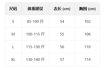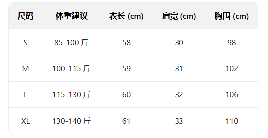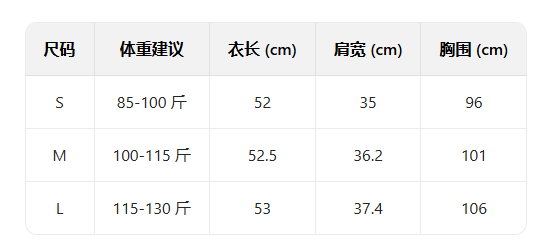 打底衫尺码表: