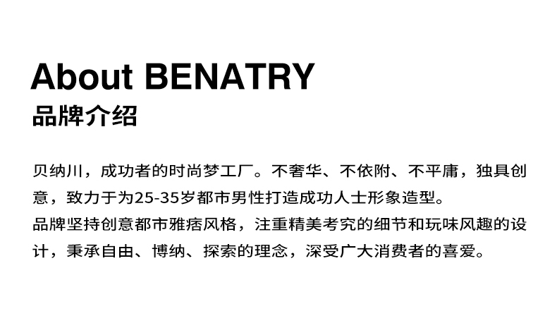 - 贝纳川男装致力于为不盲目追随潮流,坚持自己风格,注重细节与配饰搭配的而立之年轻熟男打造时髦、简约、轻松、真实的着衣风格。