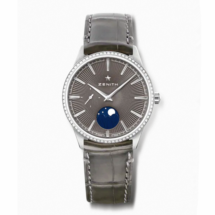 镜面 材质 | 弧形双面防眩处理蓝宝石水晶 | 表盘 | 精钢表壳,镶钻表圈 青灰色太阳纹表壳 镀銠刻面 月相显示 小秒针 |