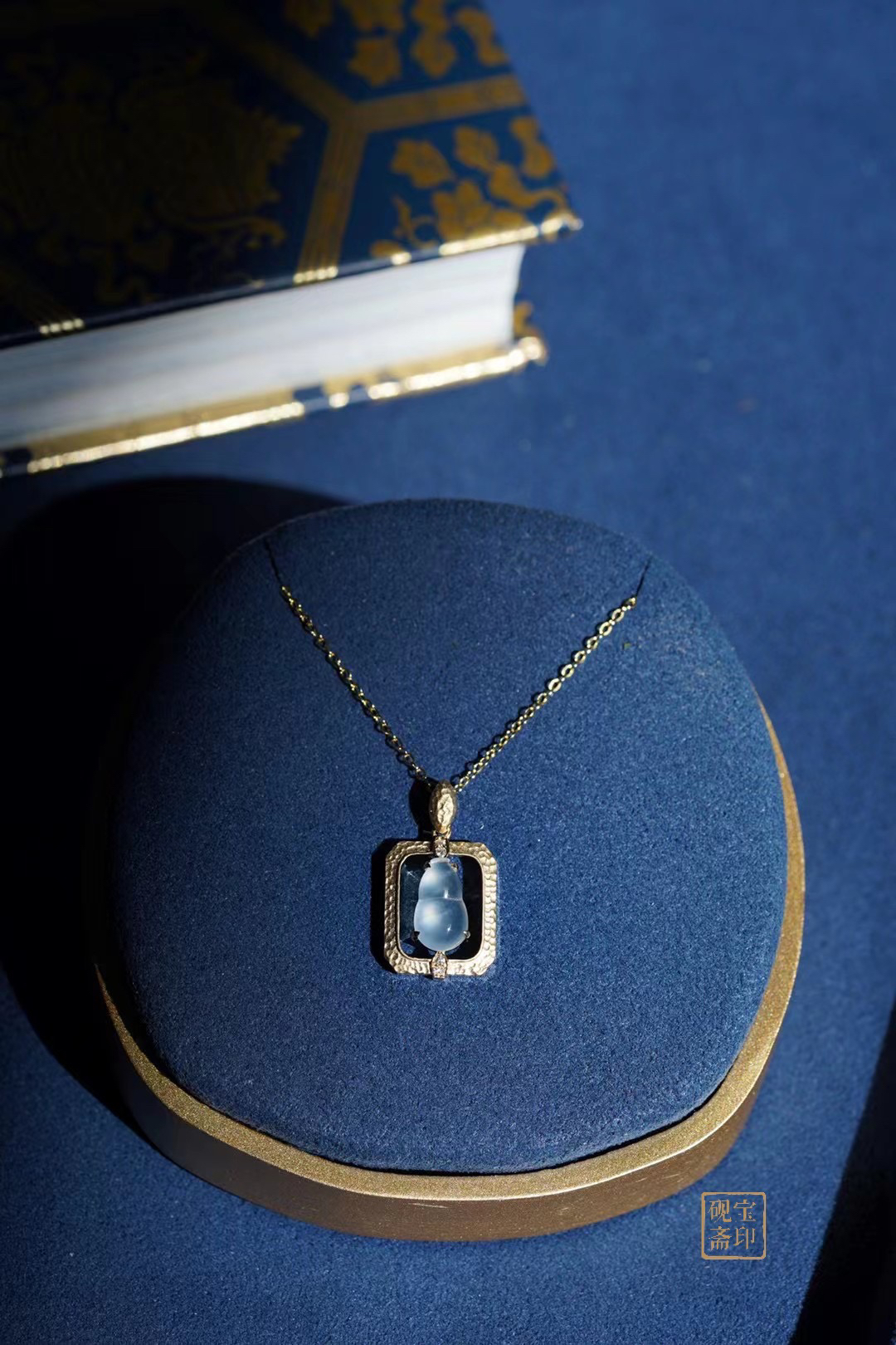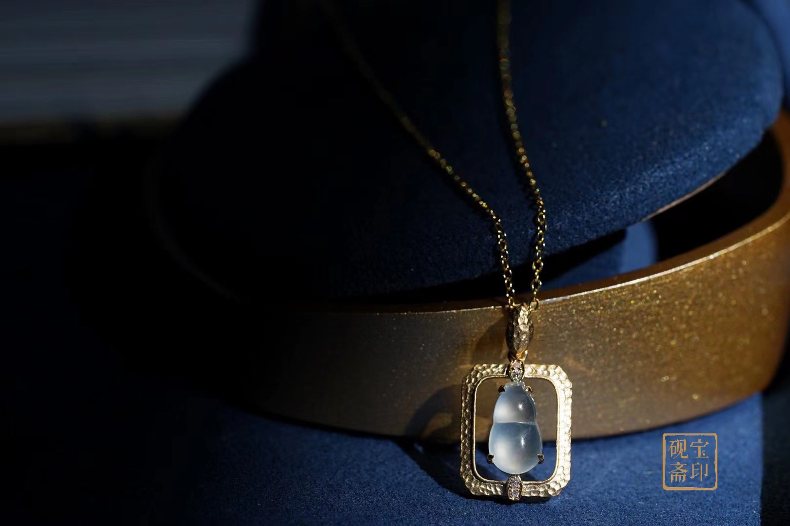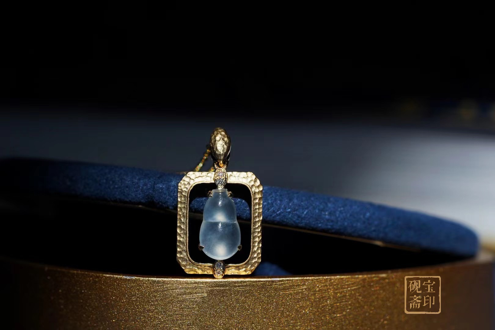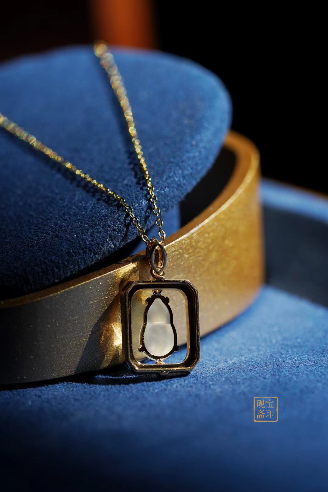 我们在这枚翡翠葫芦上做了金工艺上的尝试。葫芦不大,边框小一些,垂纹工艺实现起来很难。我们师傅真的是辛苦了,一点一点收红锻打敲注铸。