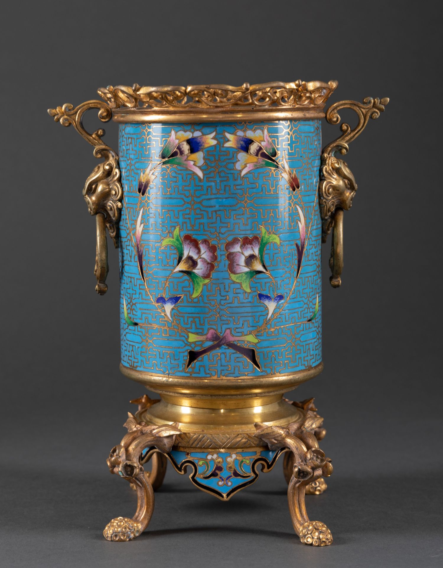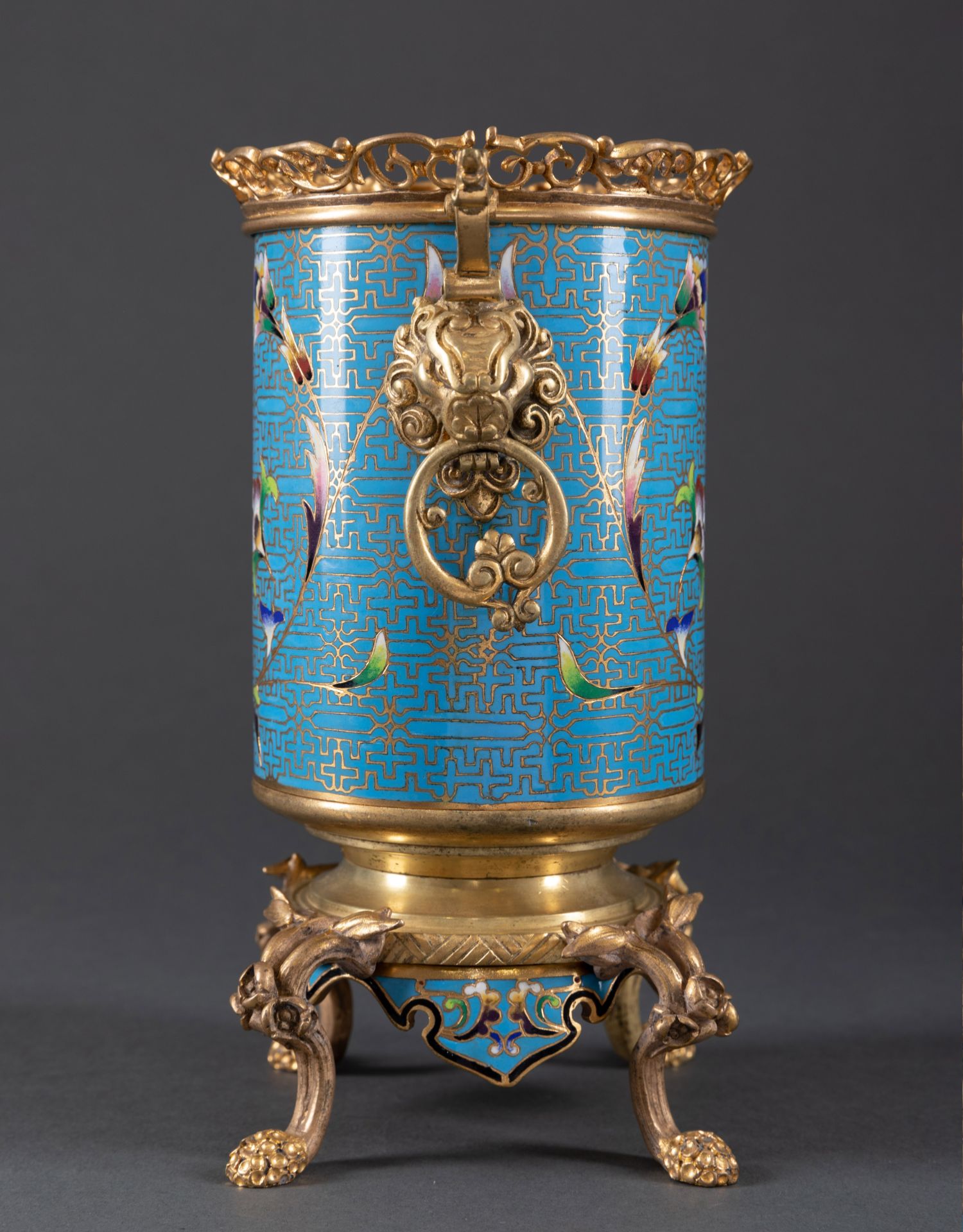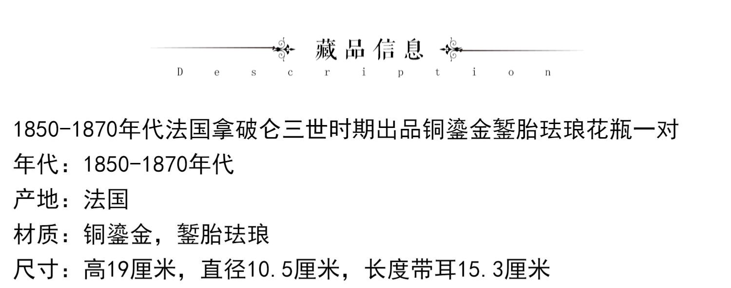 独角鹿西洋古董法国拿破仑三世时期出品铜鎏金錾胎珐琅花瓶一对