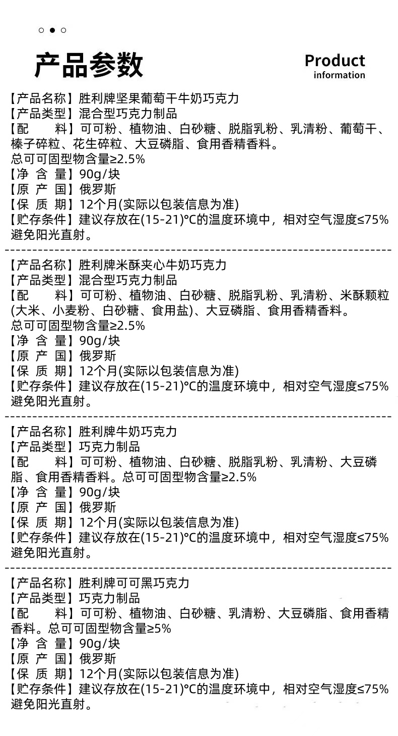 俄罗斯进口胜利牌多口味巧克力90g/块