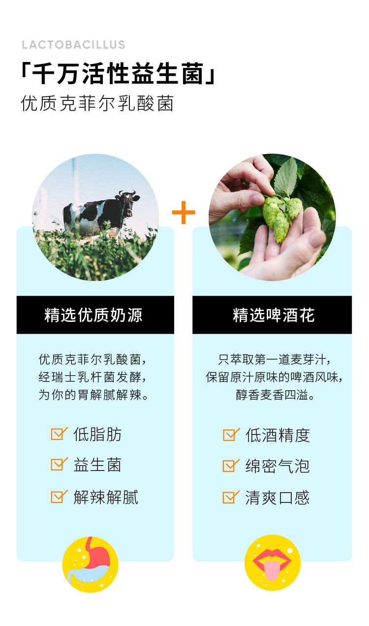 柠檬味:纯净水,白砂糖,啤酒,乳粉,柠檬浓缩汁,乳酸菌饮料发酵原液(克菲尔型),食品添加剂,食用香精。