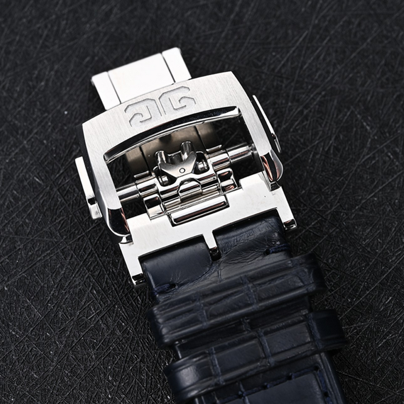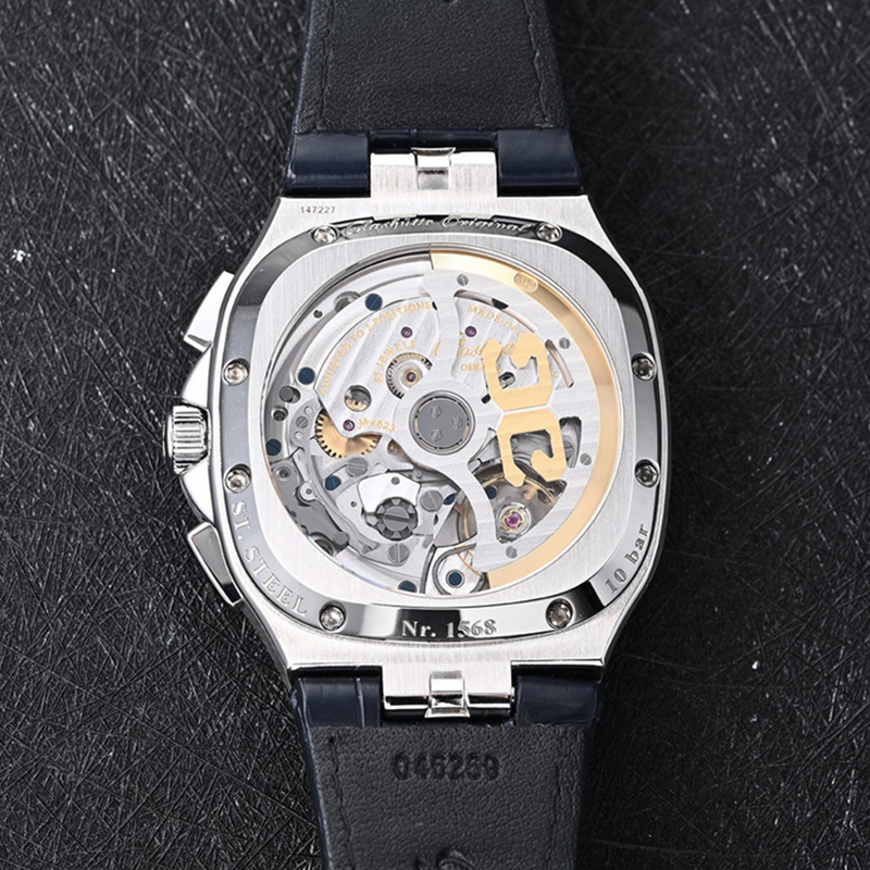 镜面 材质 | 蓝宝石水晶玻璃 | 表盘 | 精钢表壳 电镀蓝色表盘,压嵌时标带Super-LumiNova®夜光涂层 ;指针:Super-LumiNova®夜光太妃针 日期大日历显示 夜光大三针 计时 动力储备显示 飞返/逆跳 精钢表冠,带双G标示 透底 |