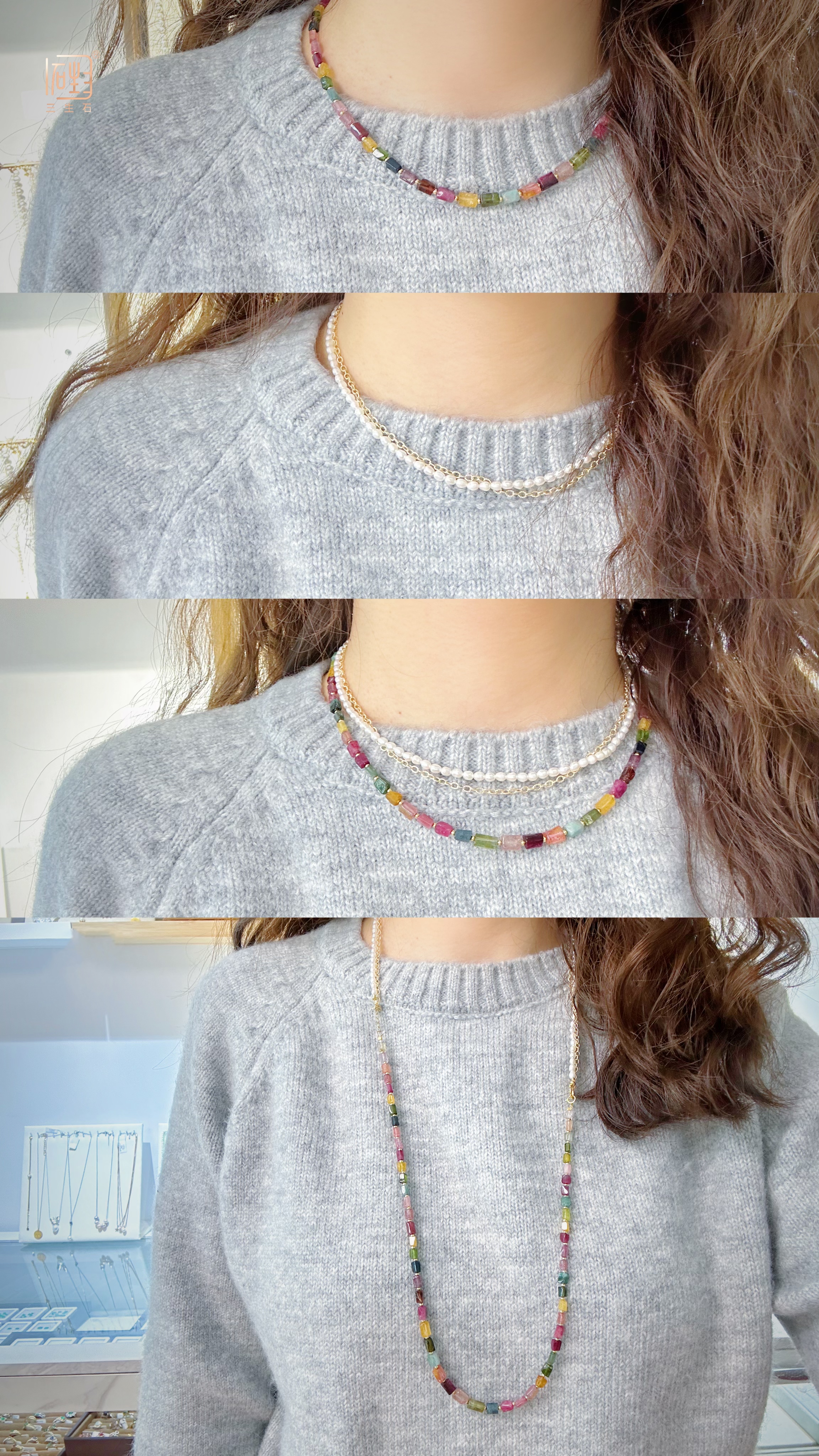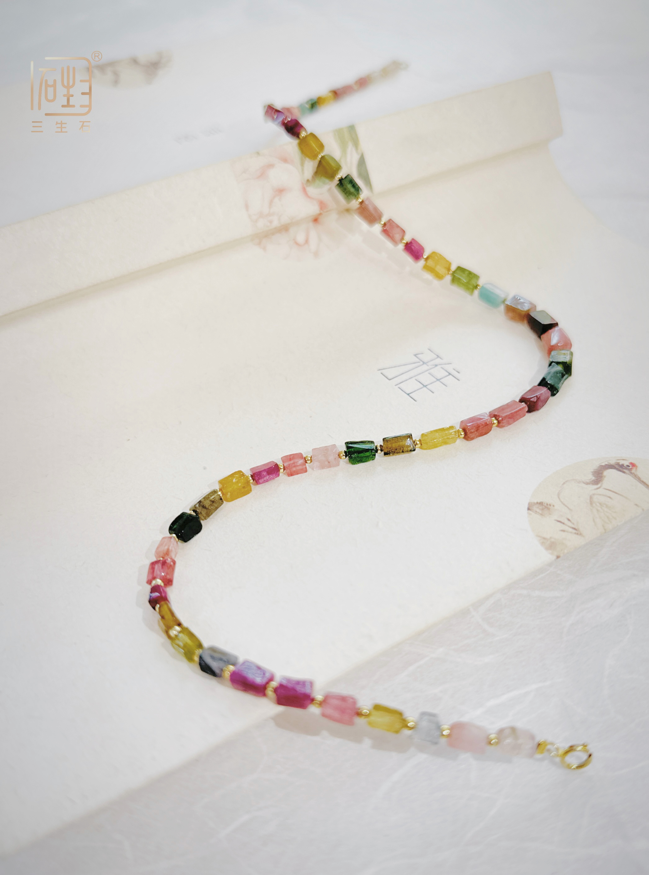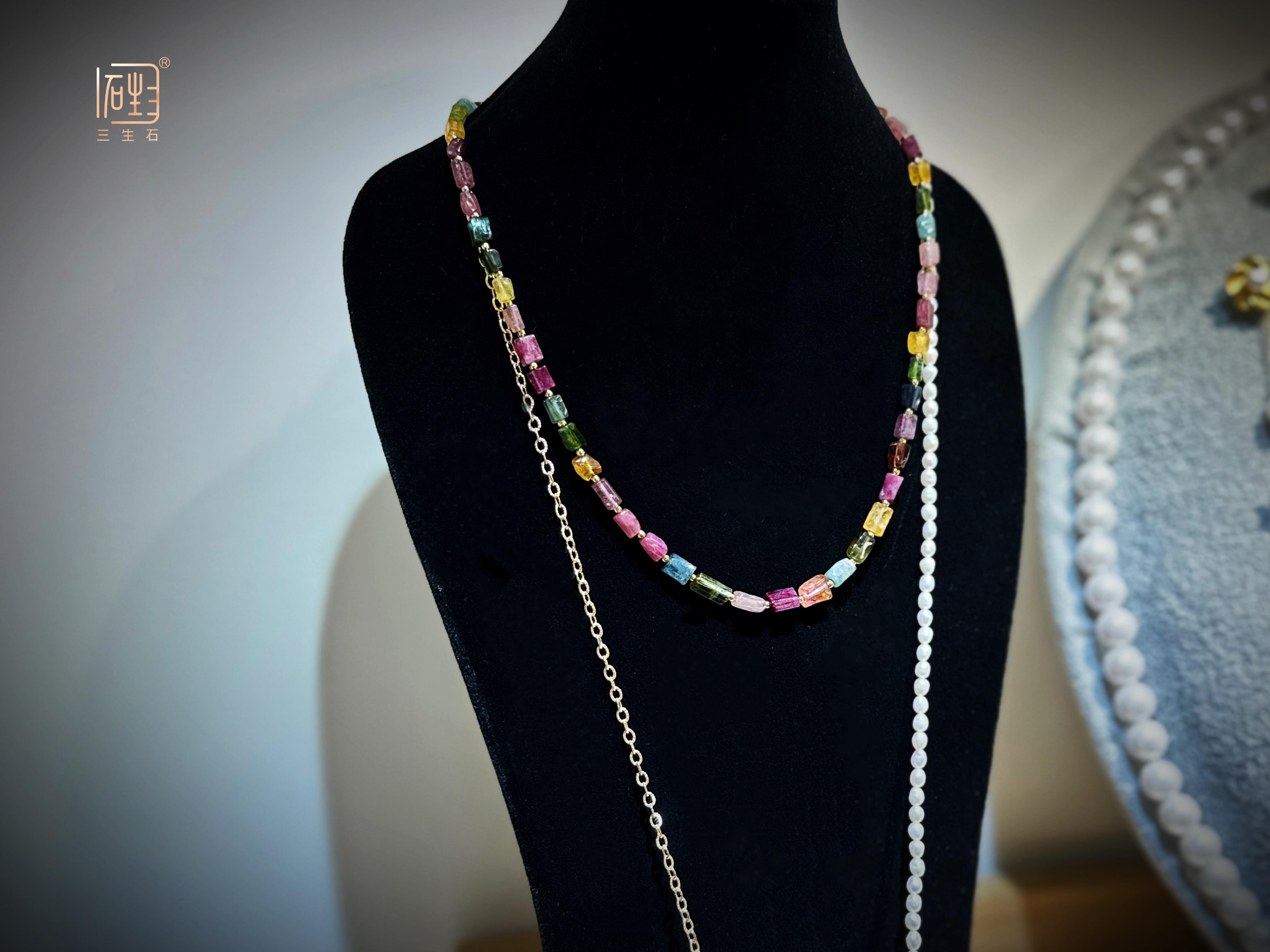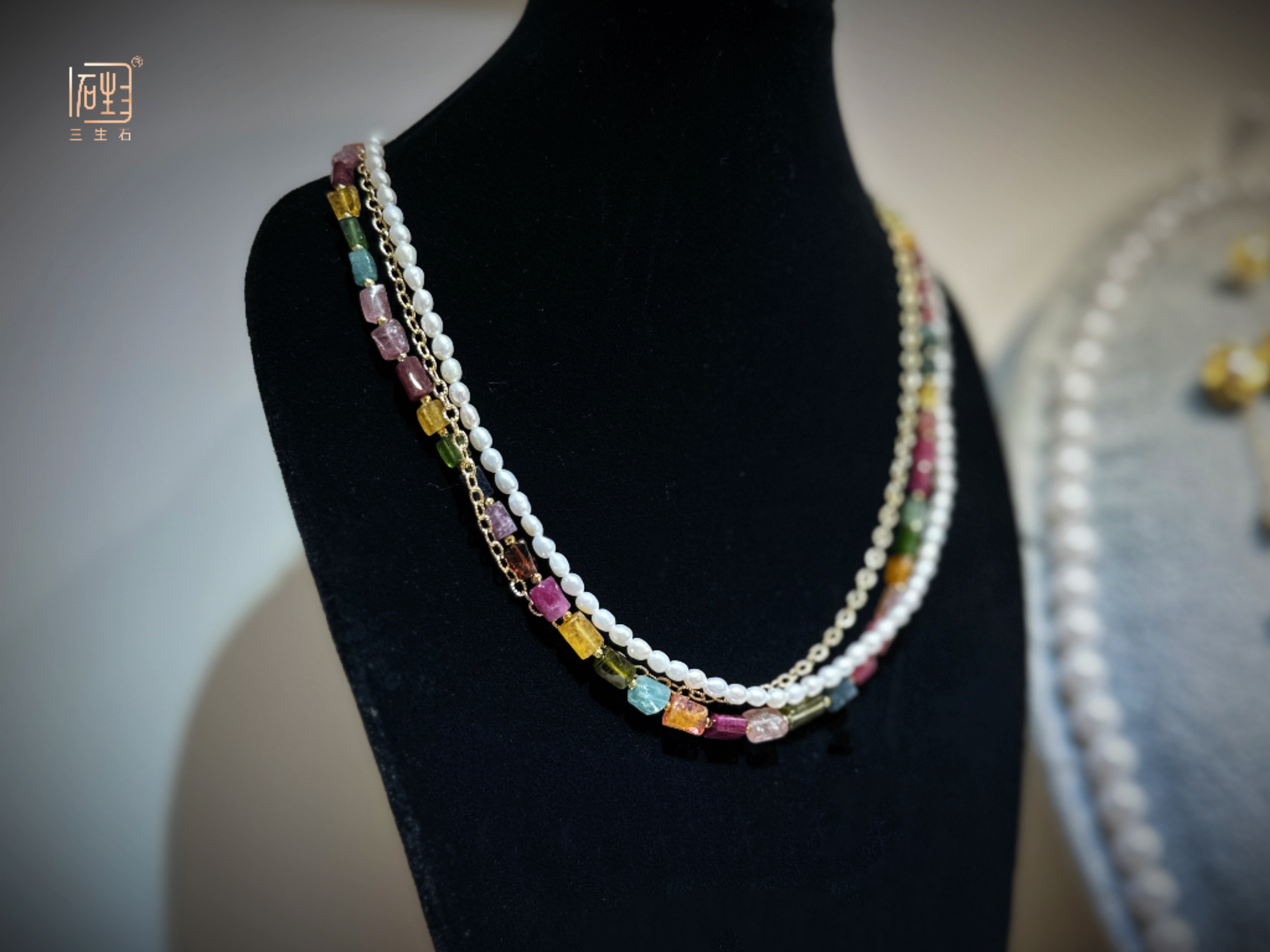 — 天然彩色碧玺巴洛克米珠金色设计项链