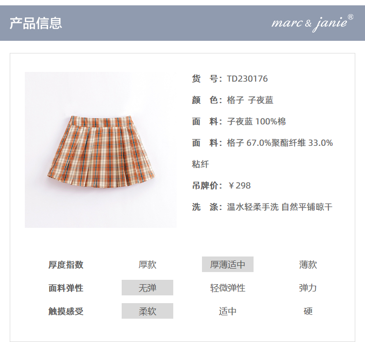 马克珍妮春夏新款 女童学院风A字百褶裙 儿童短裙230176