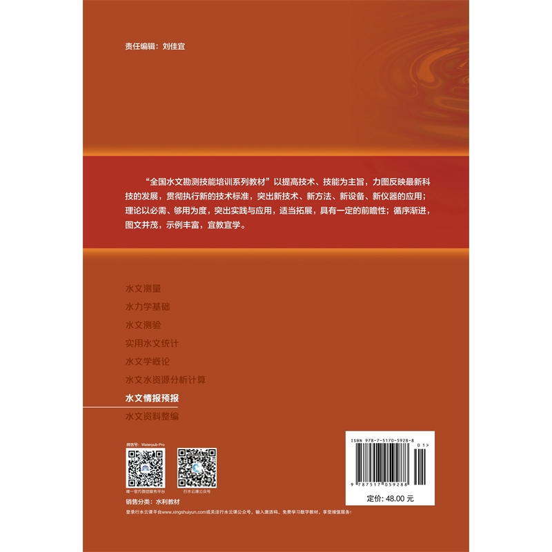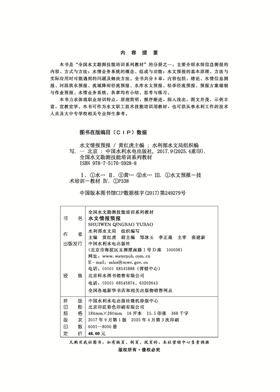 本书是《全国水文勘测技术培训教材》的其中一本,针对水文系统基层职工的现状及新形势下对水文技能人才的需求情况,总结了水文方面新技术、新设备及新方法的应用经验。本书主要介绍了水情工作的主要内容,工作流程和相关法规、制度、规定;现代水情监测新设备、新仪器和新技术;实用水文预报方法等几个方面分内容。本书可作为水文系统基层职工培训教材,也可供水文、水利、水电、航运及水环境等领域的教学、科研、设计与工程管理人员使用参考。