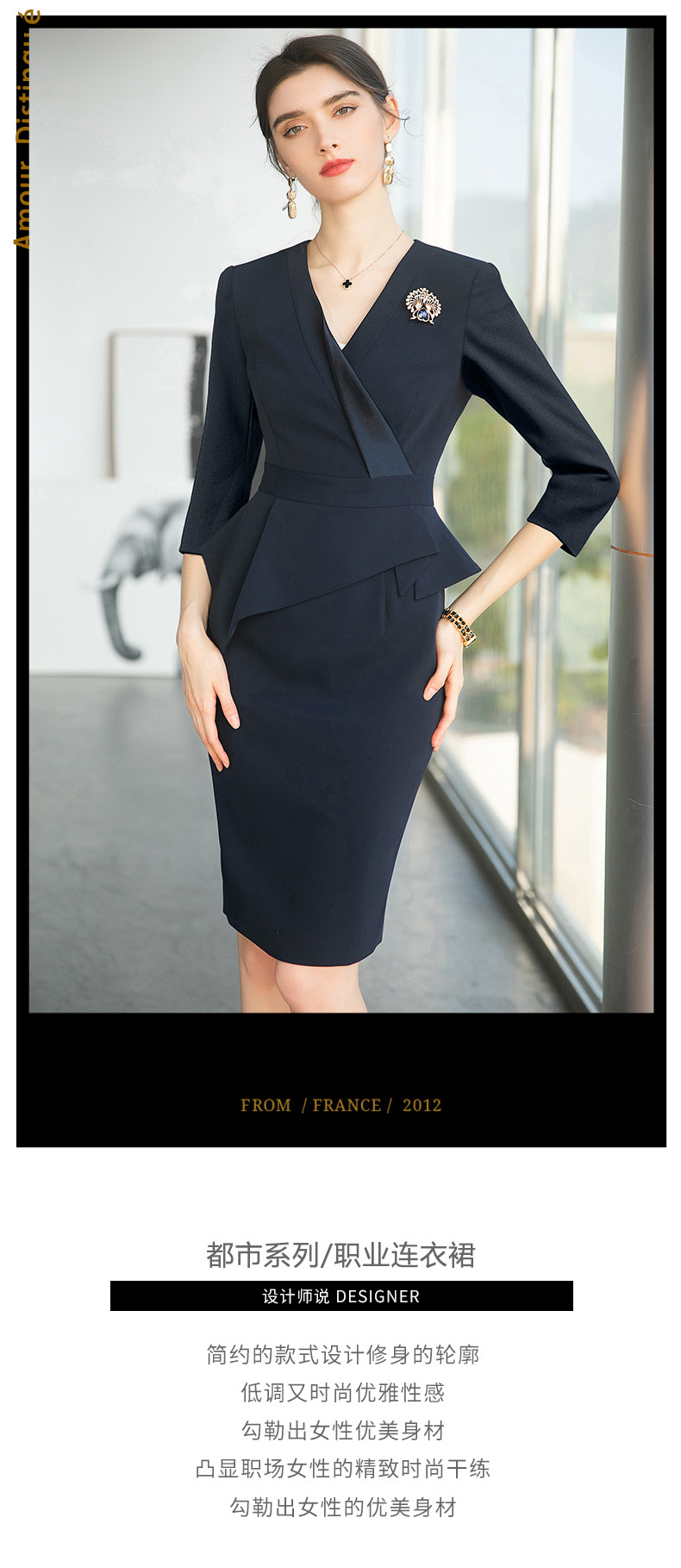 IWY/藏青色职业连衣裙女夏高级感薄款中袖珠宝店前台OL工作服裙子Q746
