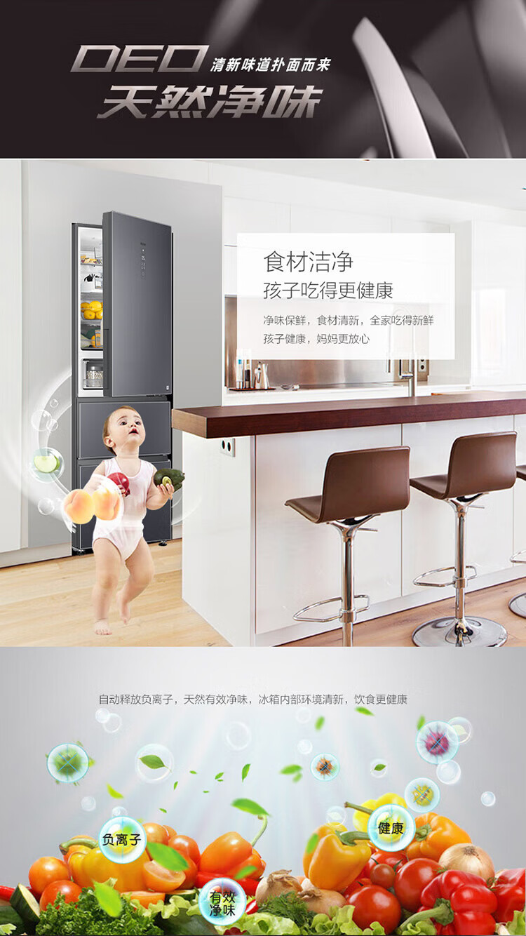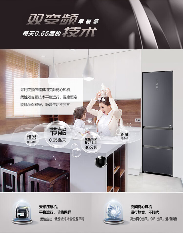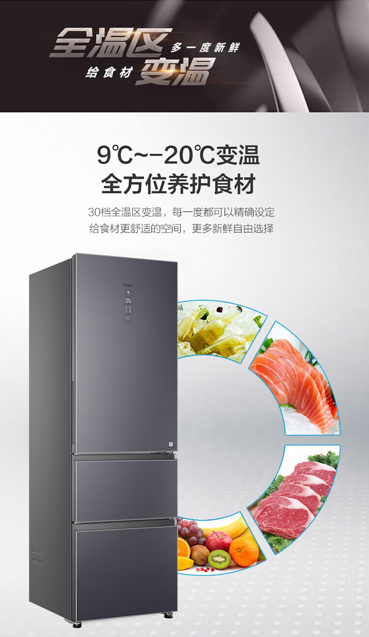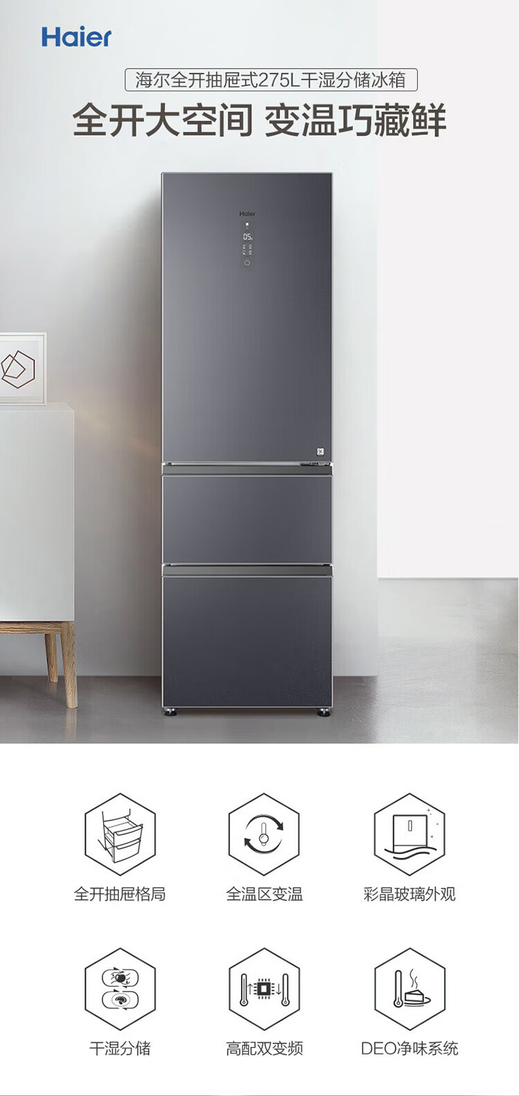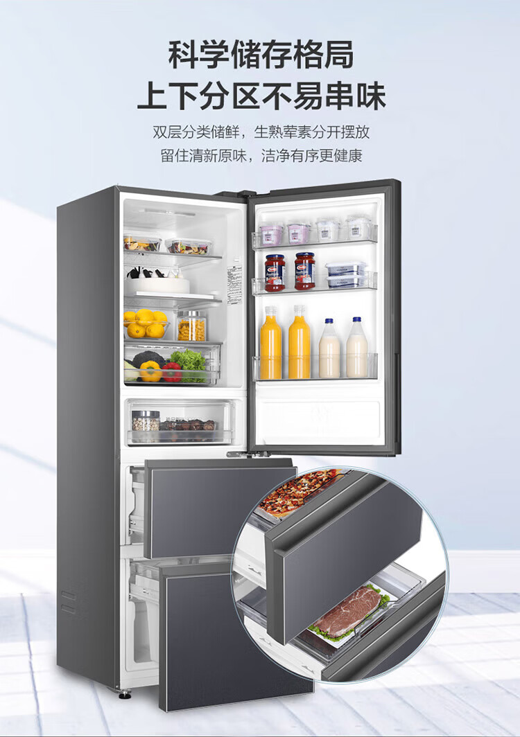海尔(Haier)【一级能效旗舰新品】275升三开门抽屉式家用小户型大容量双变频风冷无霜节能静音电冰箱 275wlhi375n1+星蕴银彩晶面板 高性价比
