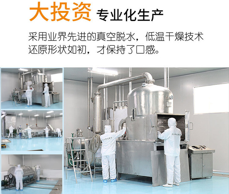 2、低温:真空脱水技术可以有效保持食品原有的色泽和形状,香酥可口,但是又不会有传统工艺的油腻。而且将油温控制在60℃以下,并且地保存了植物油的营养成分。