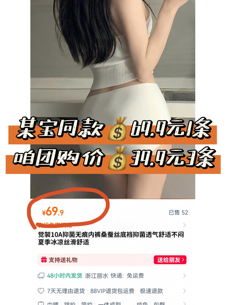 某宝同款一条要💰69.9元‼️‼️ 咱们开团直接做福利价 💰39.9元3条 +0.01多抢1条,直接4条带走‼️‼️ 赠品需要拍单!单拍不送!多拍不送!不拍不送! 这个性价比穿过之后才敢夸 10A级抑菌桑蚕丝内裤✔️ 值得我安利1000次对的人间好物单品🙏🙏