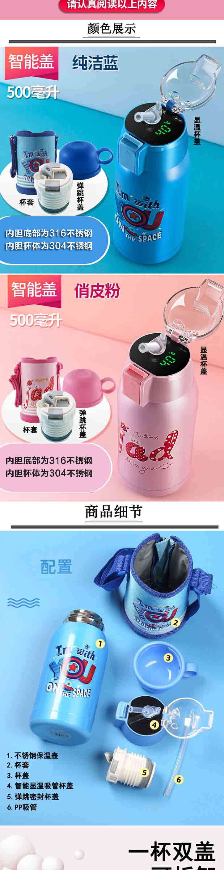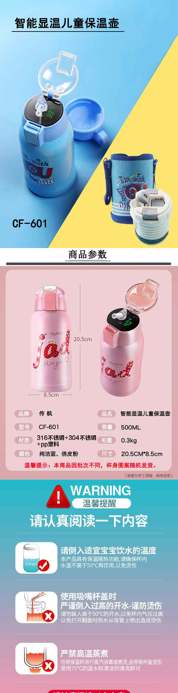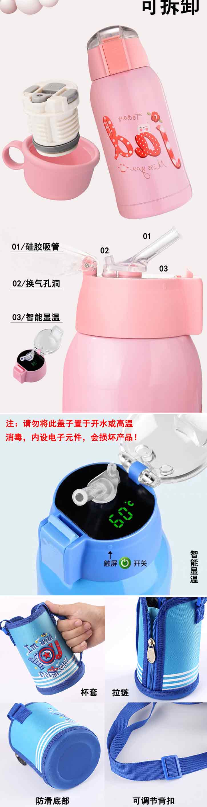 传枫 304不锈钢温显儿童保温杯卡通吸管杯便携幼儿园水壶儿童水杯 CF-601