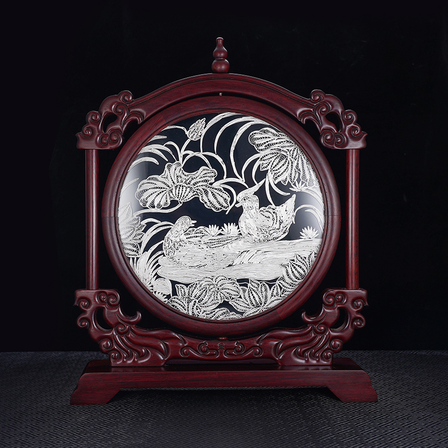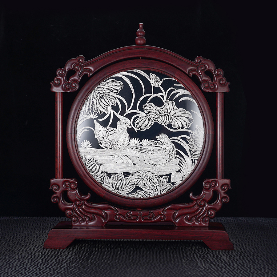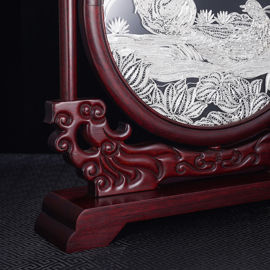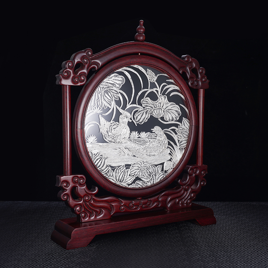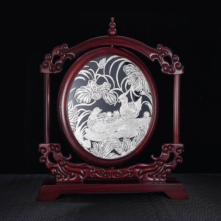 子佩集S999银手工银花丝【鸳鸯戏水】双面旋转花丝台屏【YYXSHATP】大师工坊原创设计2508