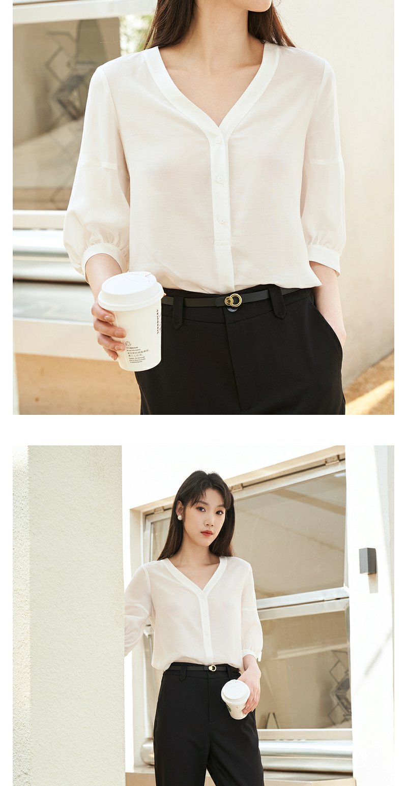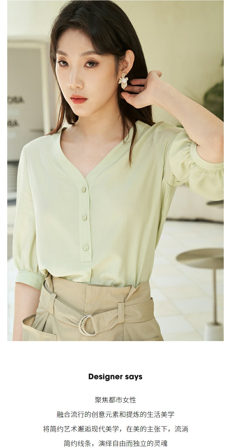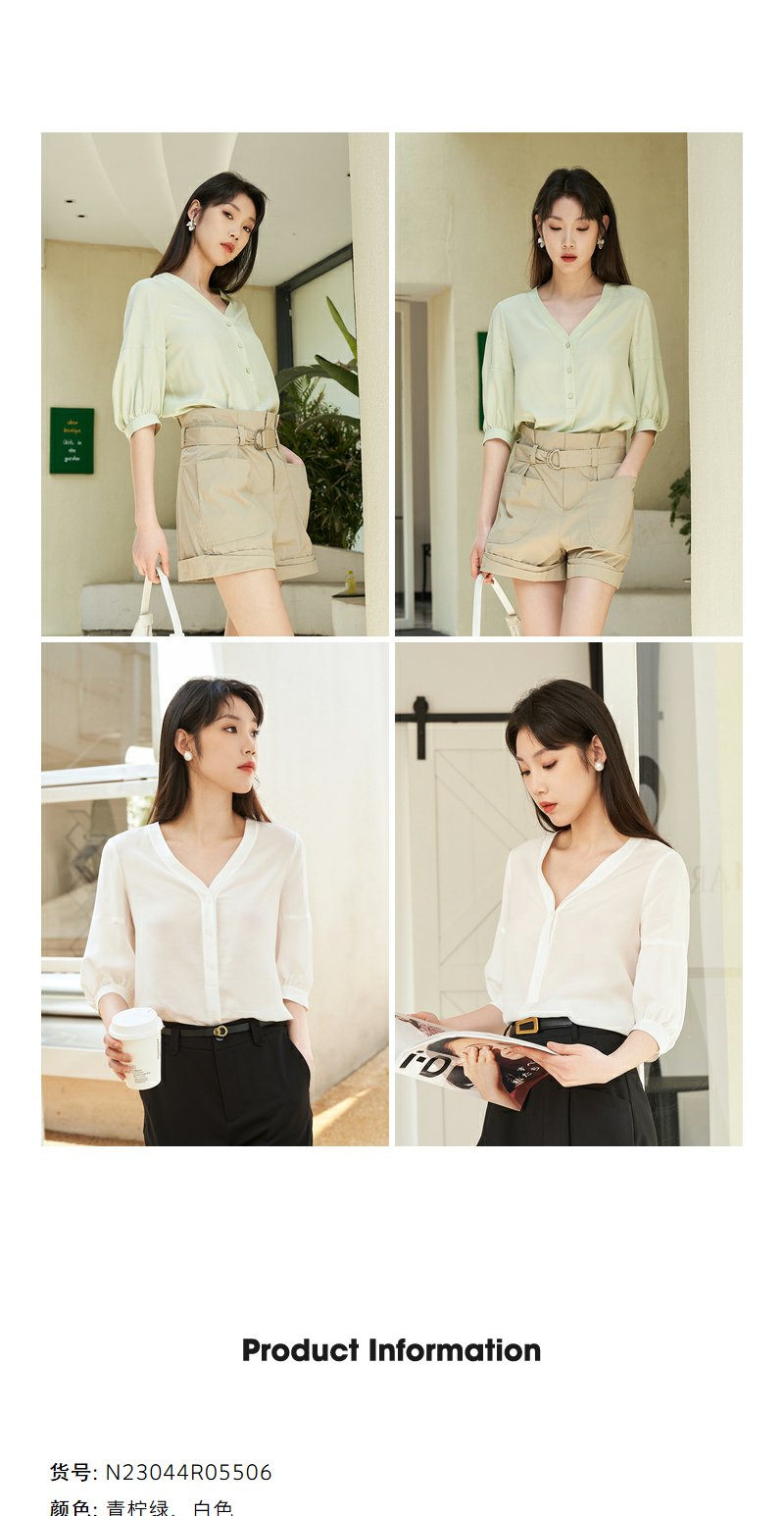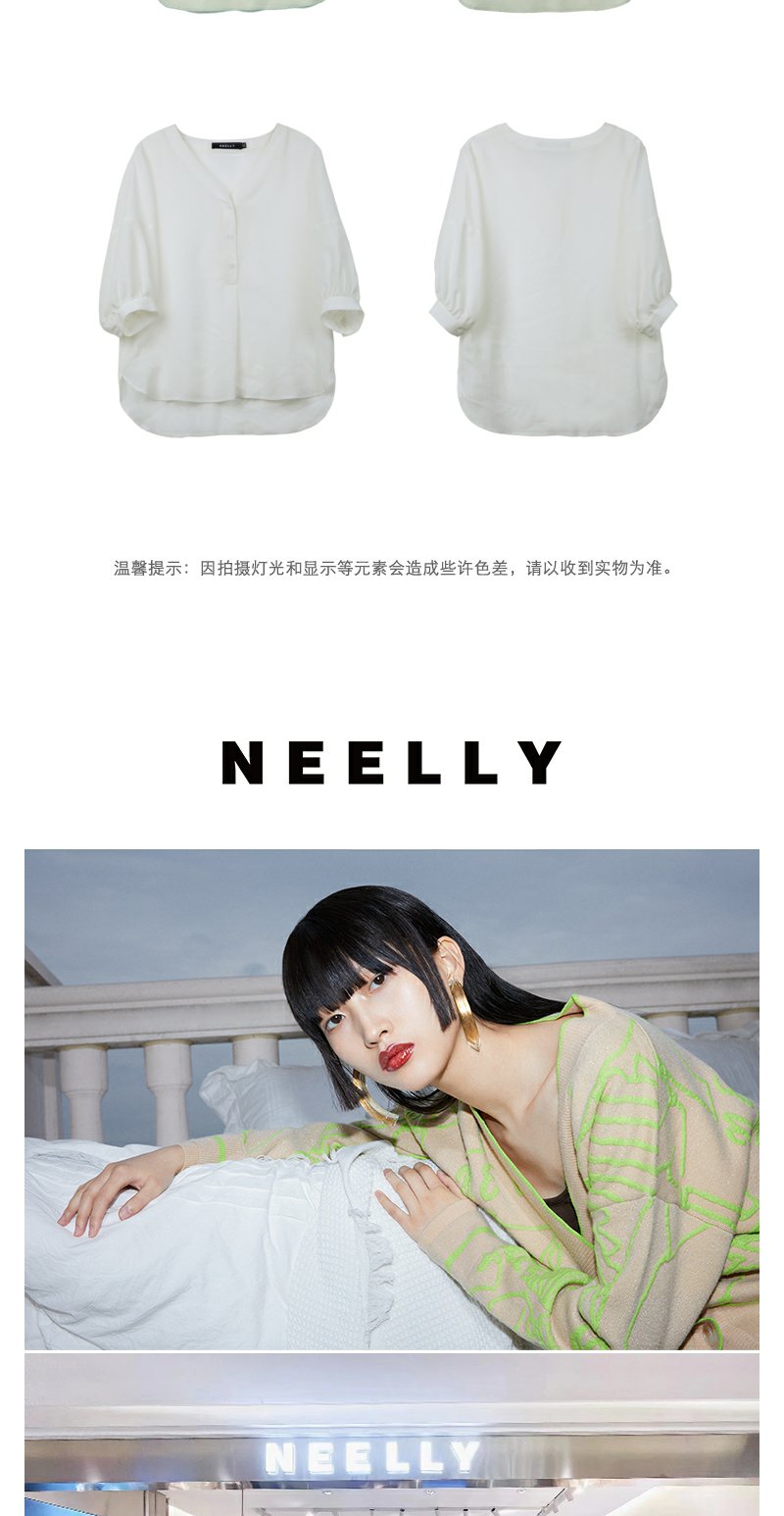 NEELLY纳俪夏季新款气质V领衬衫女简约通勤七分袖轻薄上衣百搭潮N23044R05506
