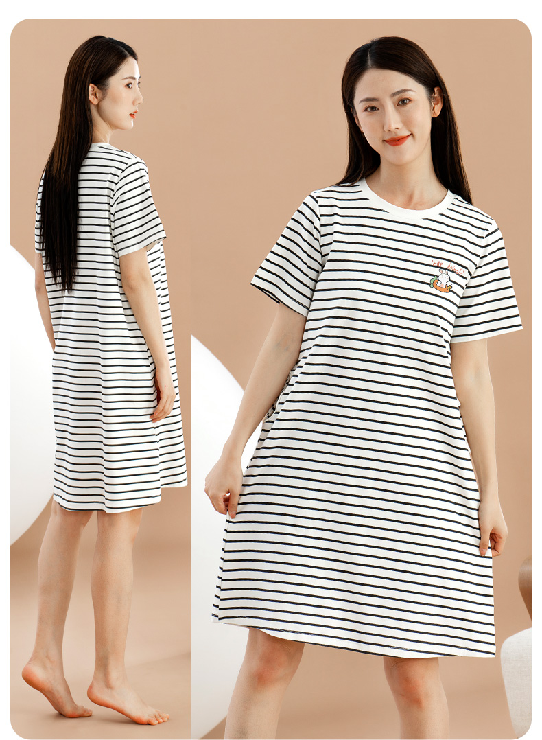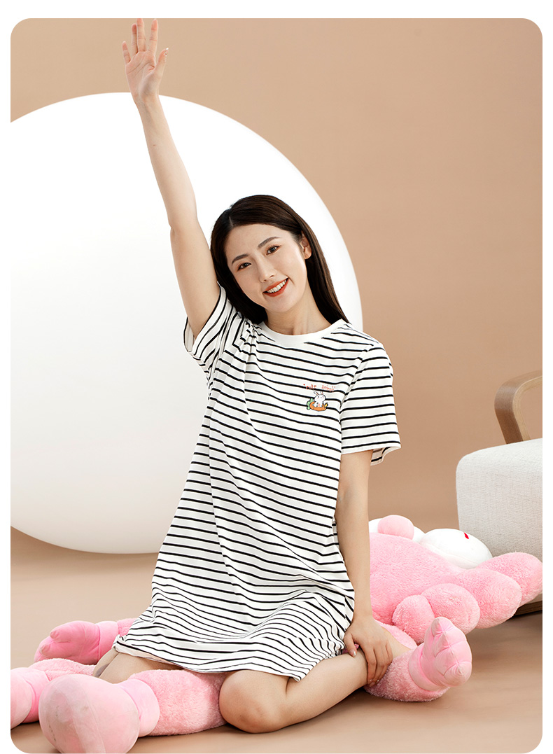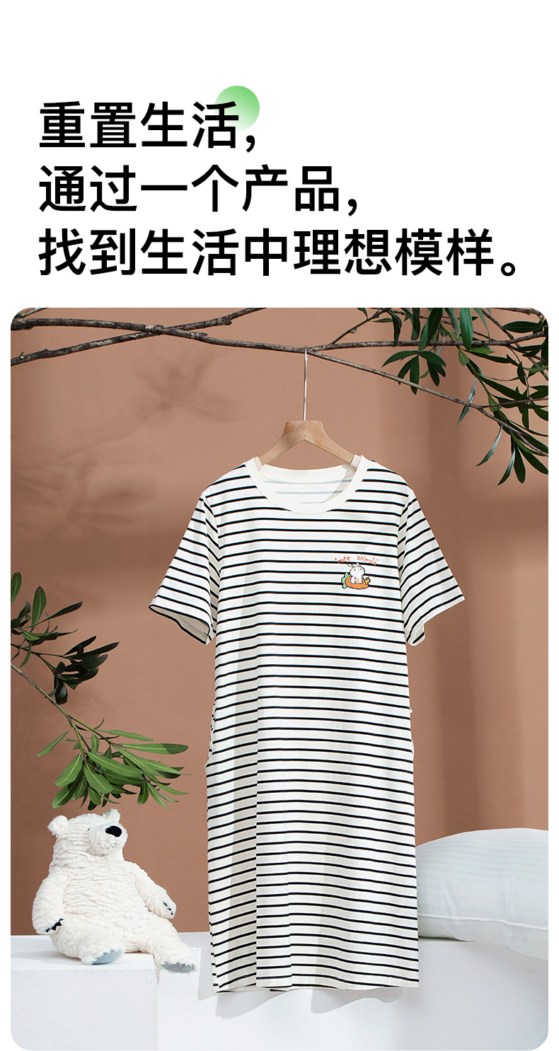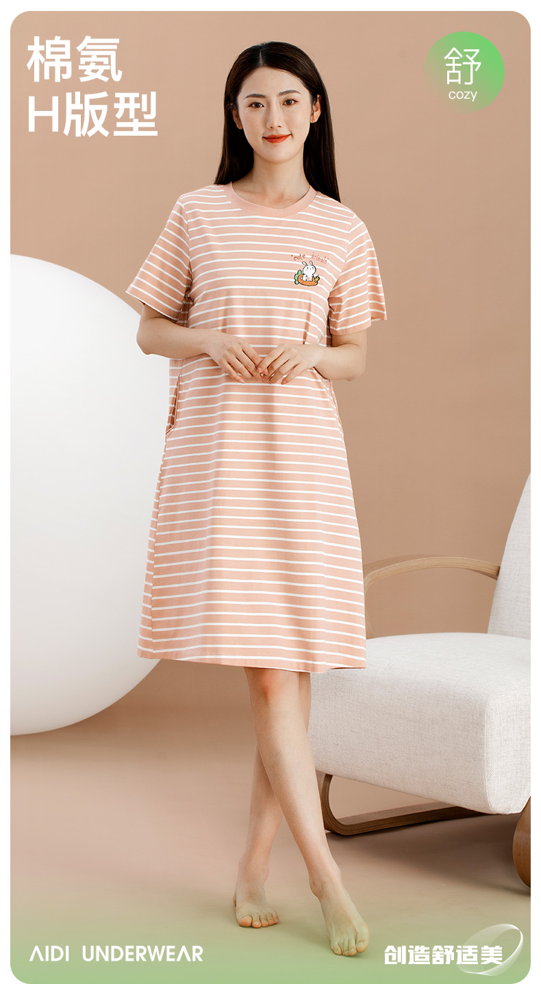 爱帝女士睡裙纯棉夏季薄款条纹家居裙