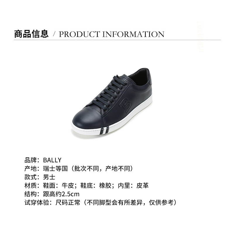 品牌:BALLY/巴利产地:意大利等国(批次不同,产地不同)款式:男士颜色:黑色2材质:鞋面:牛皮;鞋底:橡胶;内里:皮质结构:鞋长约26cm,鞋宽约10cm,跟高约3cm(此为5/39码测量)