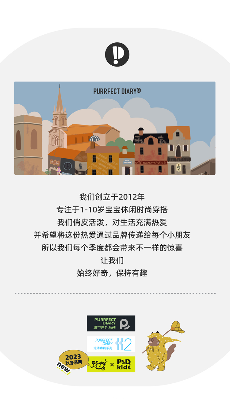 Purrfect-Diary专注于贴近自然随性的穿着概念,轻奢平价的童装文化传播,在产品设计上更加注重婴童穿着的舒适性、安全性、更出众的国际化品牌,将欧美的育婴文化在中国进行深入的传播与推广。