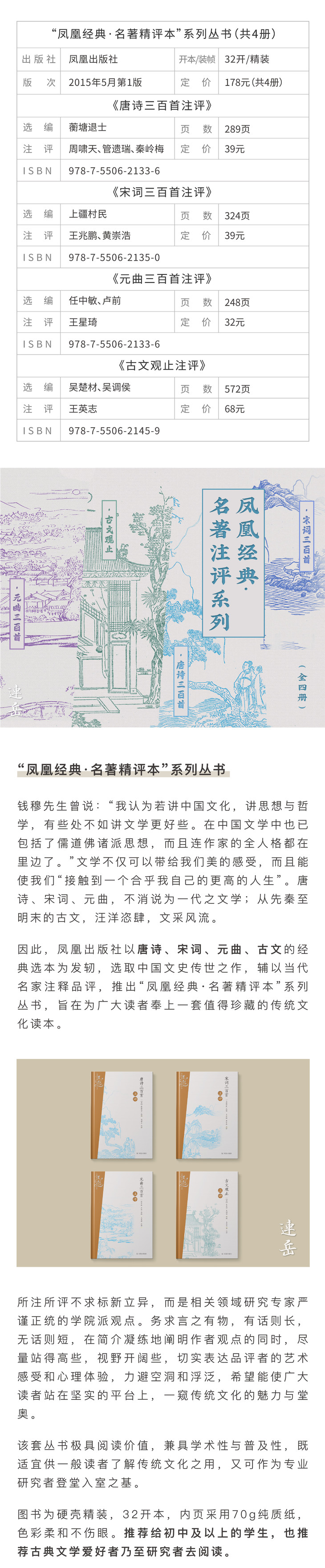 “凤凰经典·名著精评本”系列丛书(共4册):《唐诗三百首注评》《宋词三百首注评》《元曲三百首注评》《古文观止注评》