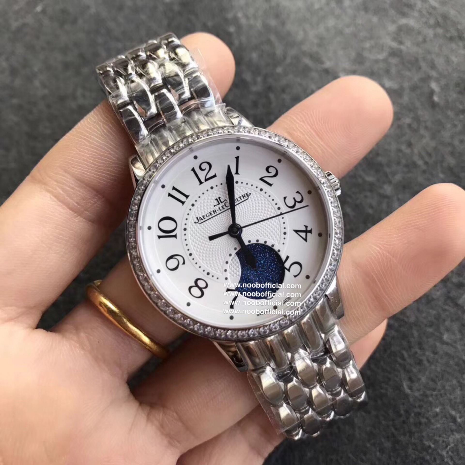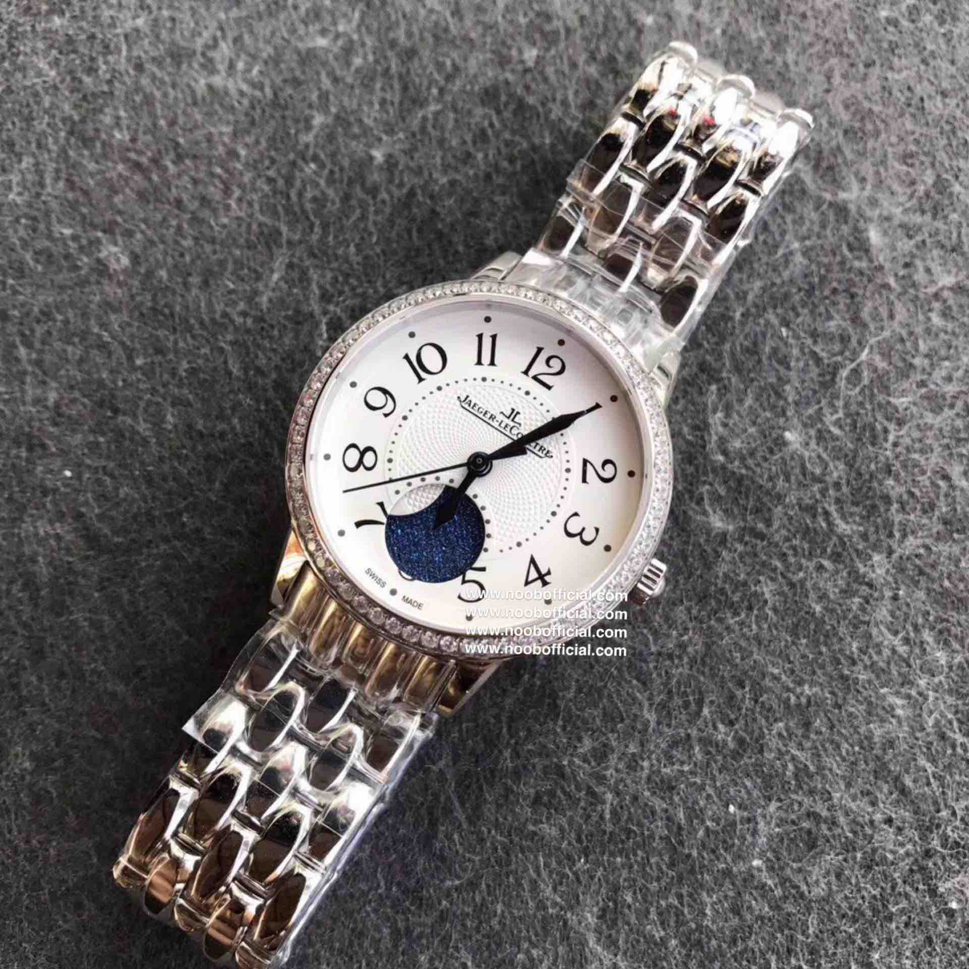 2017日内瓦表展新款积家约会系列大月相女士腕表,34x11mm,西铁城9015改cal.935A自动机械机芯,316精钢表壳,蓝宝石镜面,钢带或皮带可选,折叠扣,防水30米