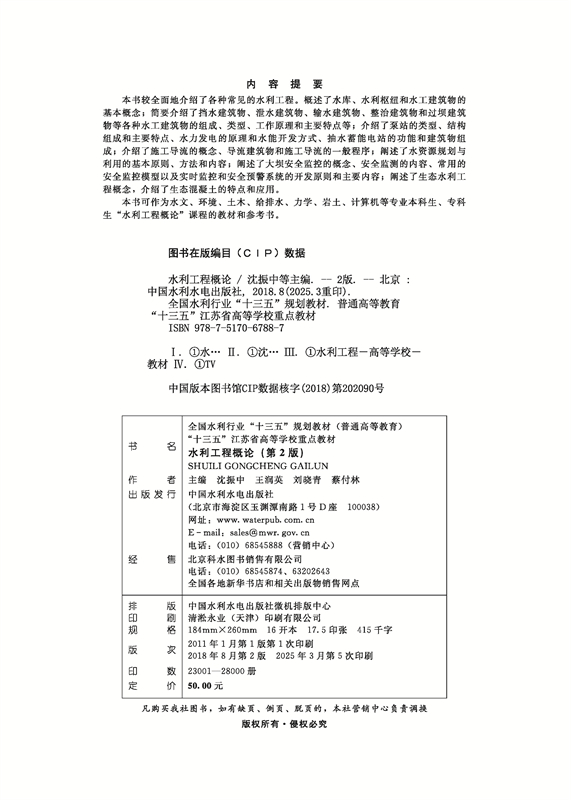 本书较全面地介绍了各种常见的水利工程,概述了水资源、水库、水利枢纽和水工建筑物的基本概念,挡水建筑物、泄水建筑物、输水建筑物、整治建筑物和过坝建筑物等各种水工建筑物的组成、类型、工作原理和主要特点等;泵站、水电站和抽水蓄能电站的功能、类型和建筑组成,施工导流的概念、导流建筑物和施工导流的一般程序,阐述了水资源规划的基本原则、方法和内容,大坝安全监控的概念、安全监测的内容、常用的安全监控模型以及实时监控和安全预警系统的开发原则和主要内容。本书可作为水文、环境、土木、给排水、力学、岩土、计算机等专业本、专科生“水利工程概论”课程的教材和参考书。
