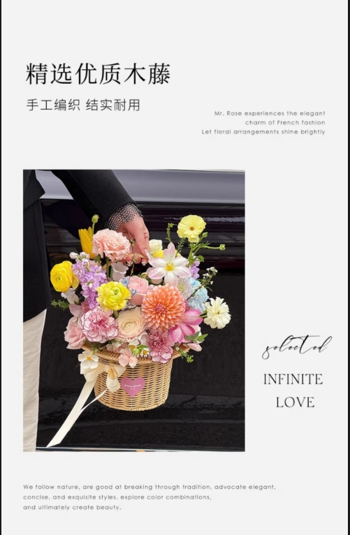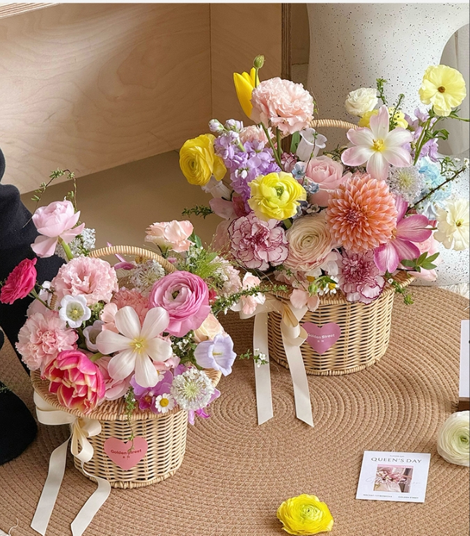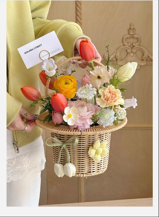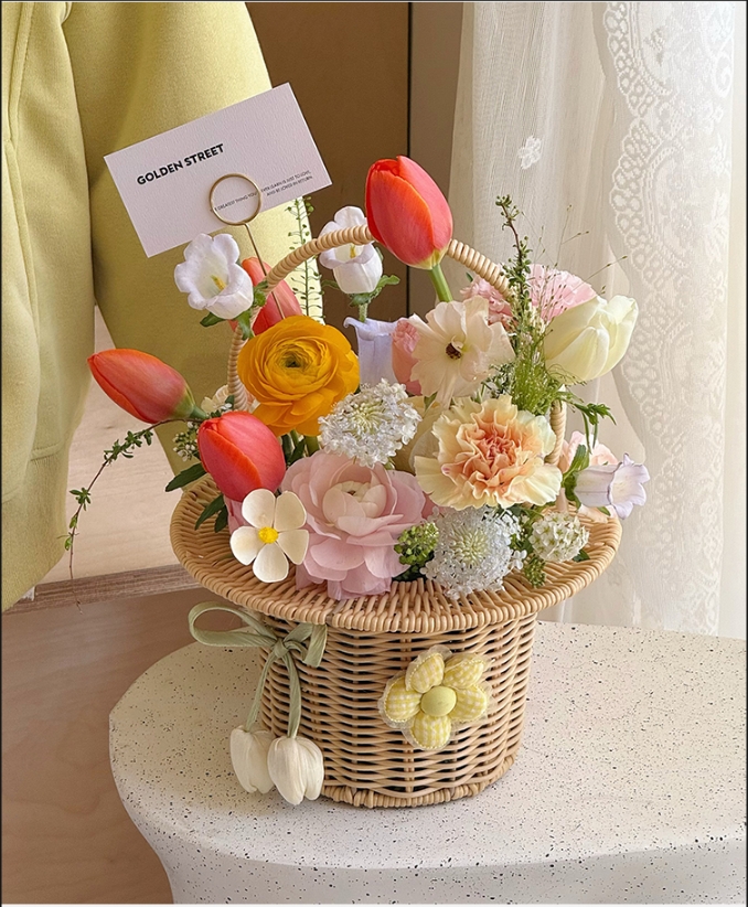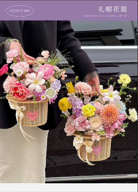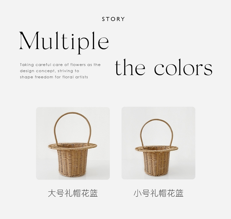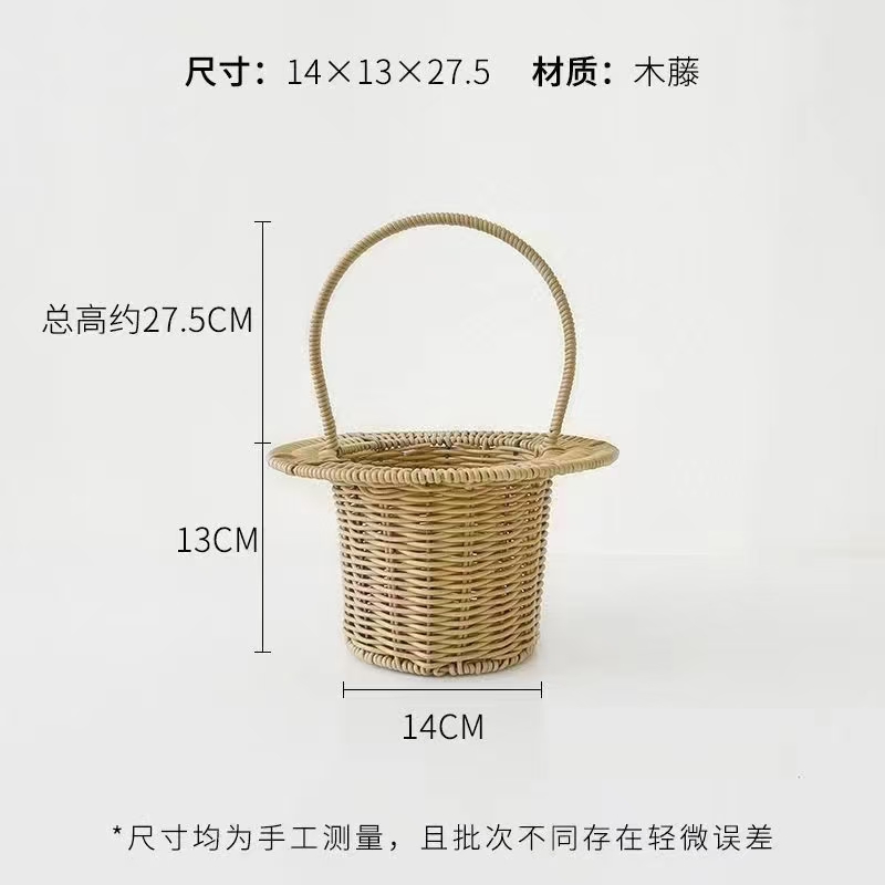 田园仿藤米白礼帽编织花篮--帽子花篮