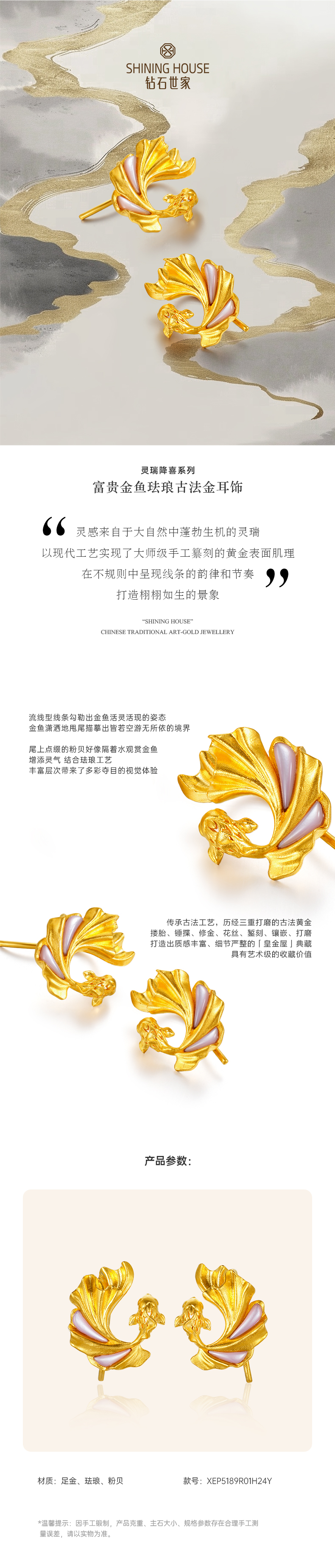 【灵瑞降喜系列】钻石世家 古法黄金富贵金鱼珐琅古法金耳饰 足金黄金耳饰 【黄金产品不支持无理由退换货】预计3-5天发货