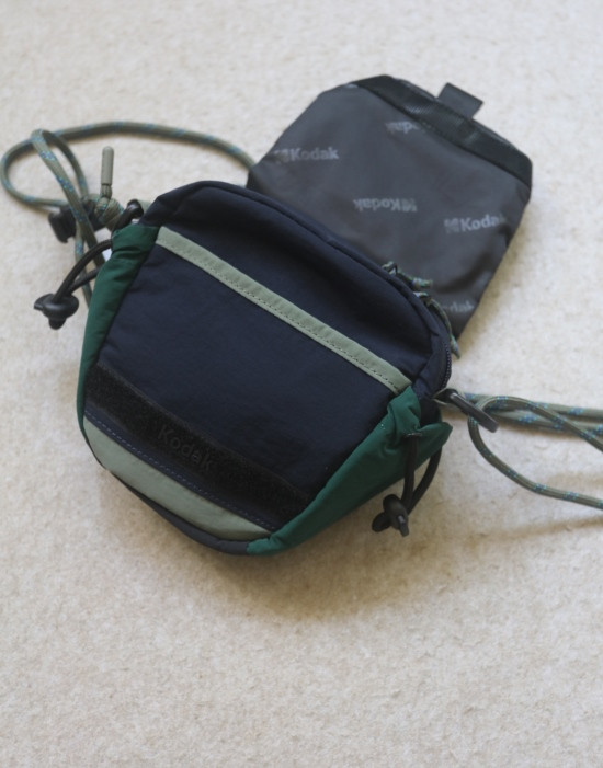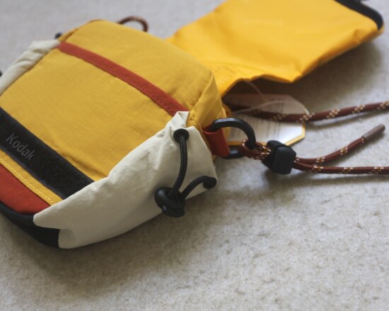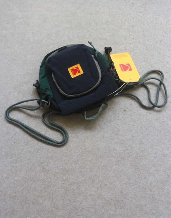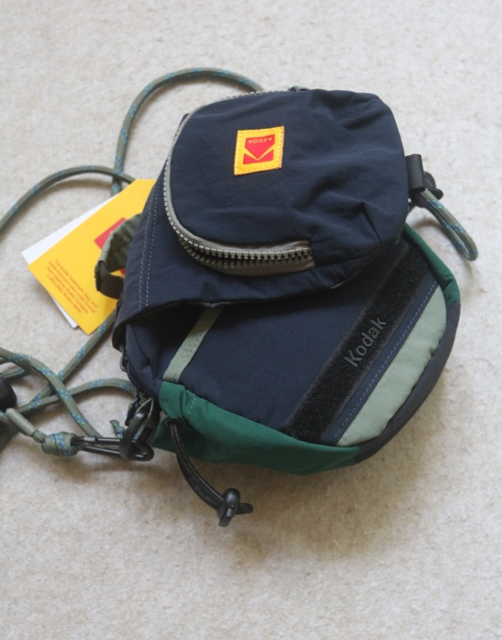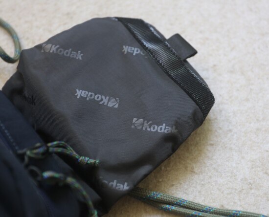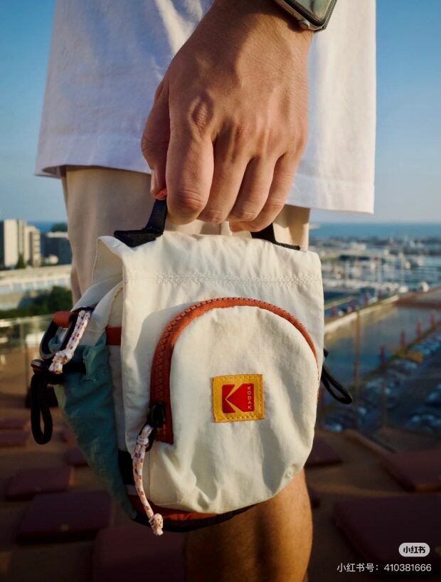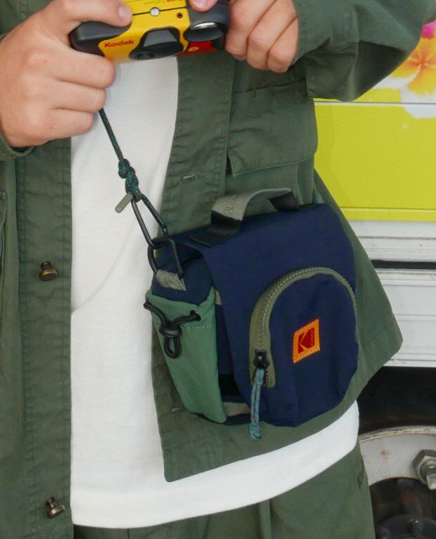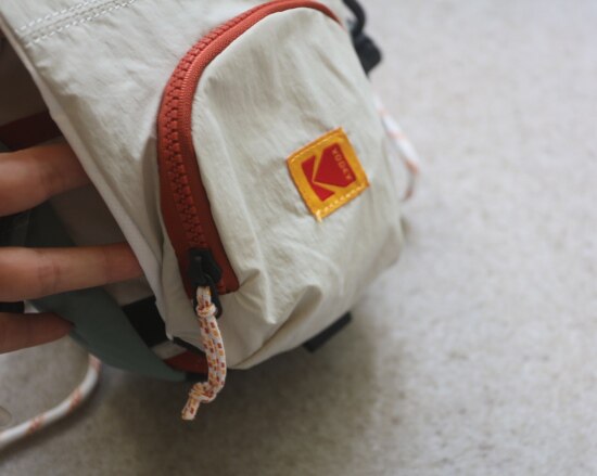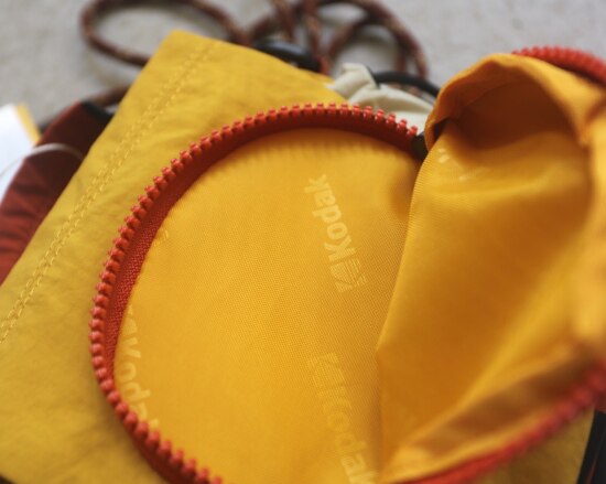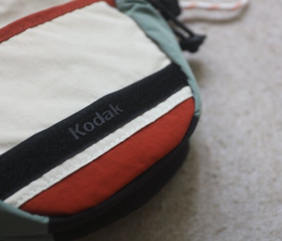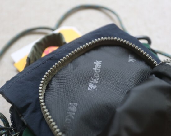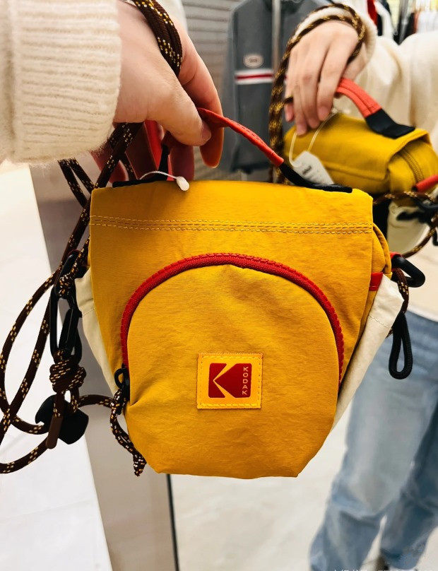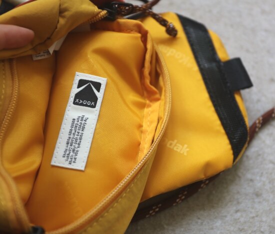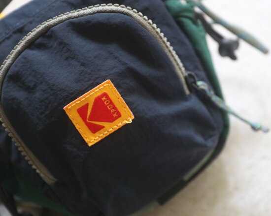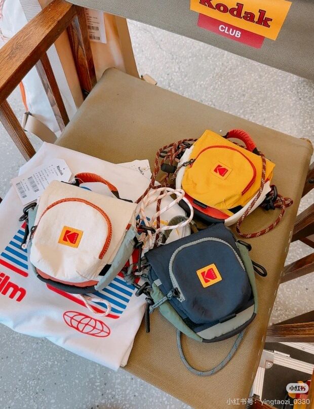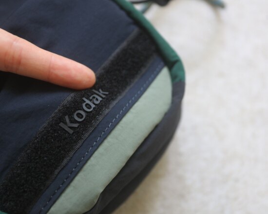 包前黄色小布标 粘扣上饰有软胶的Kodak字母 里衬不防水 同色的提织字母