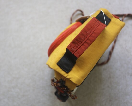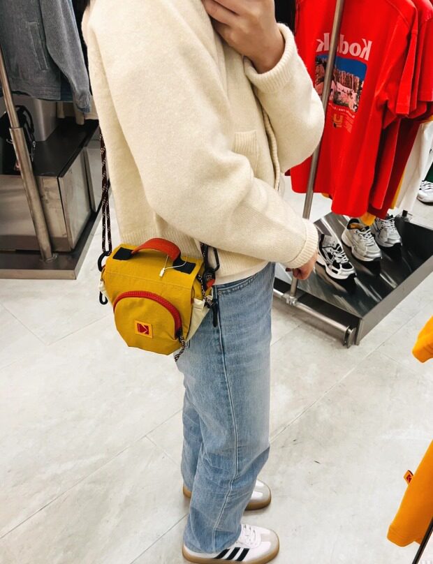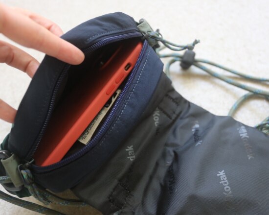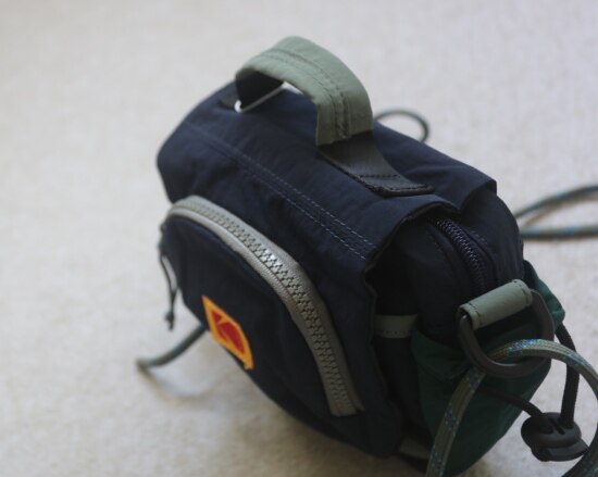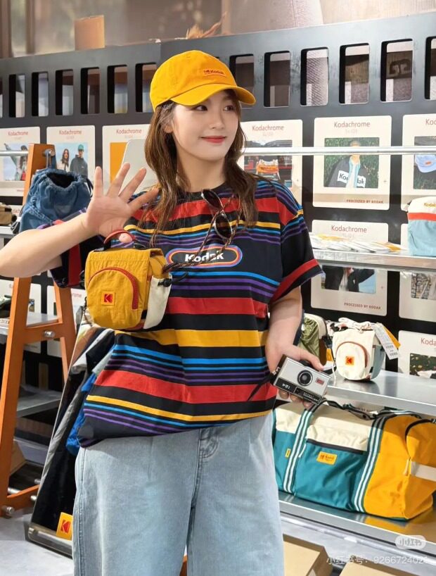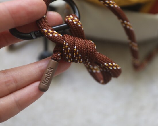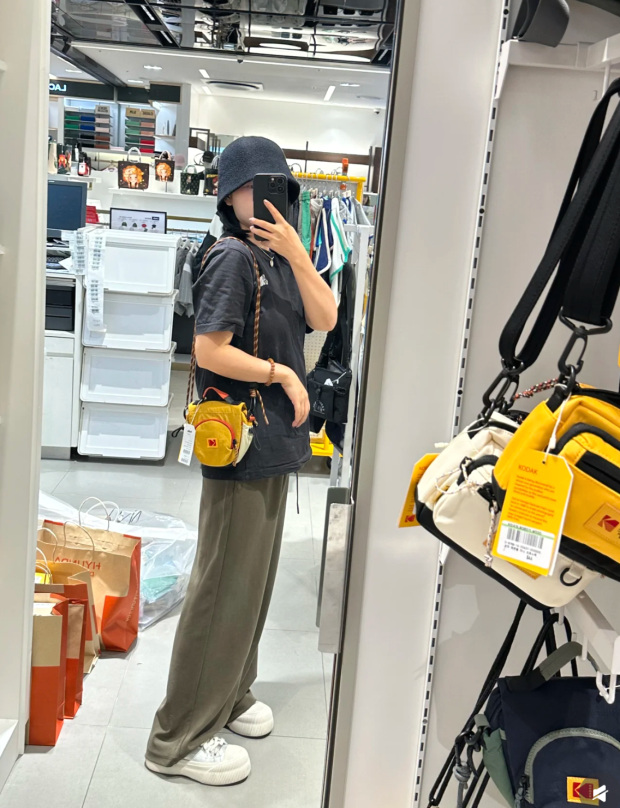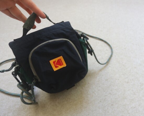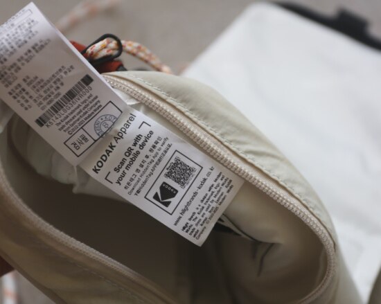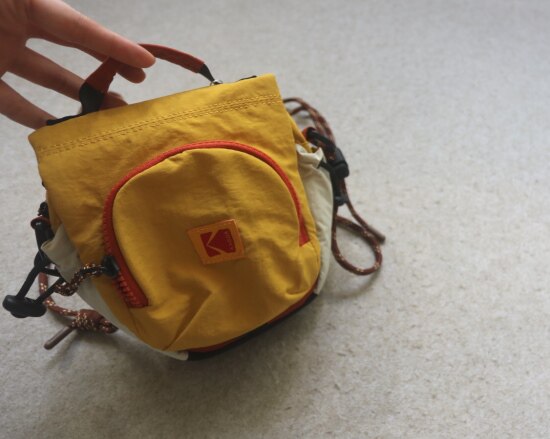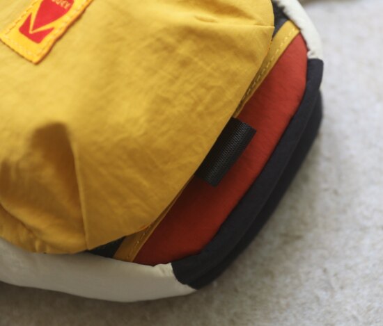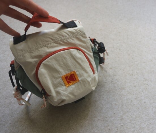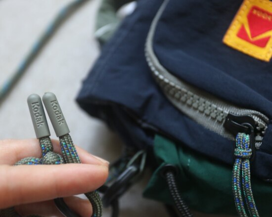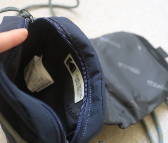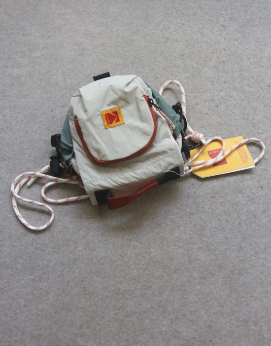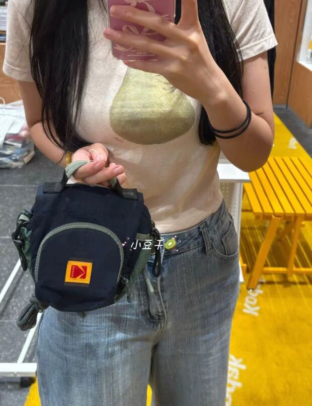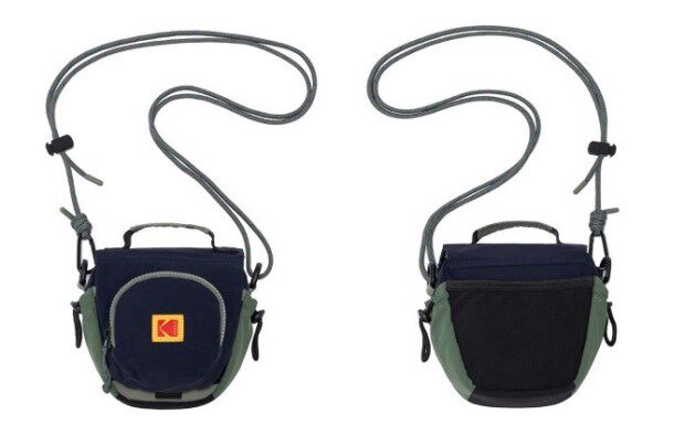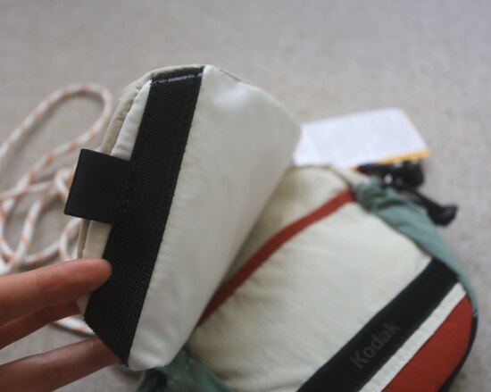 包前黄色小布标 粘扣上饰有软胶的Kodak字母 里衬不防水 同色的提织字母
