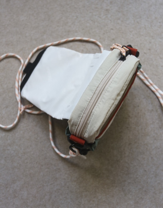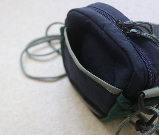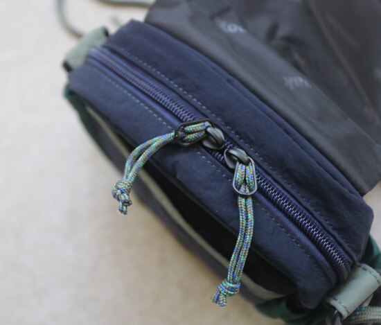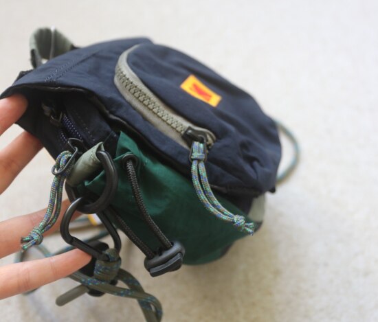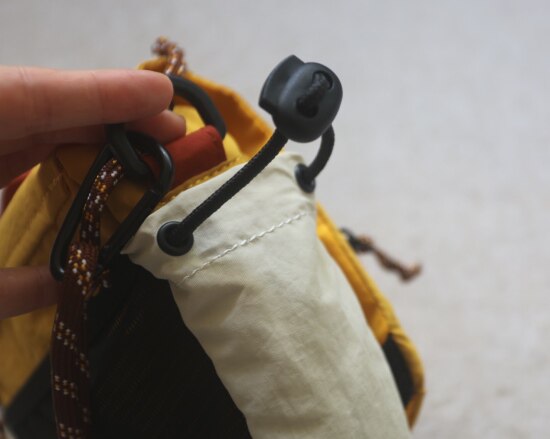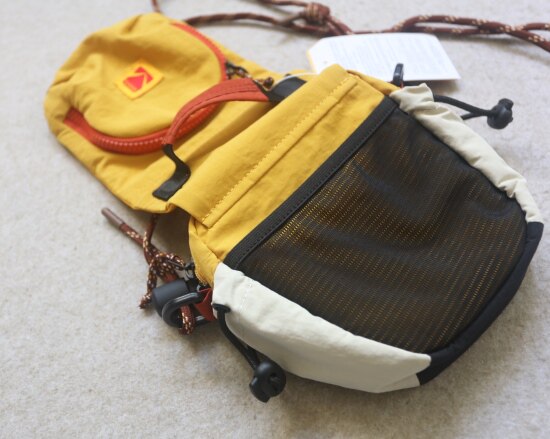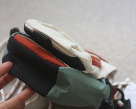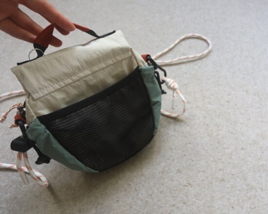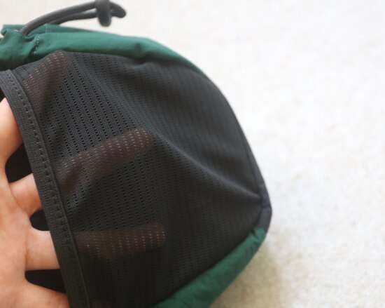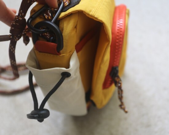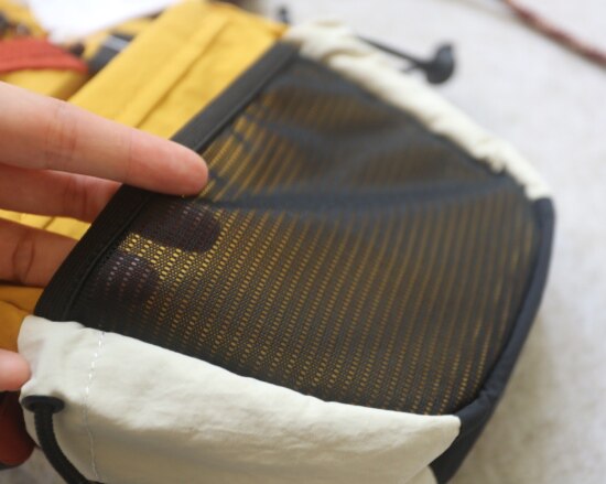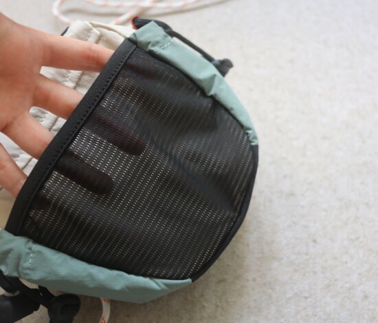 两侧 可抽绳收紧的贴袋 也就几根笔的容量 包后是弹力边的黑色网纱贴袋