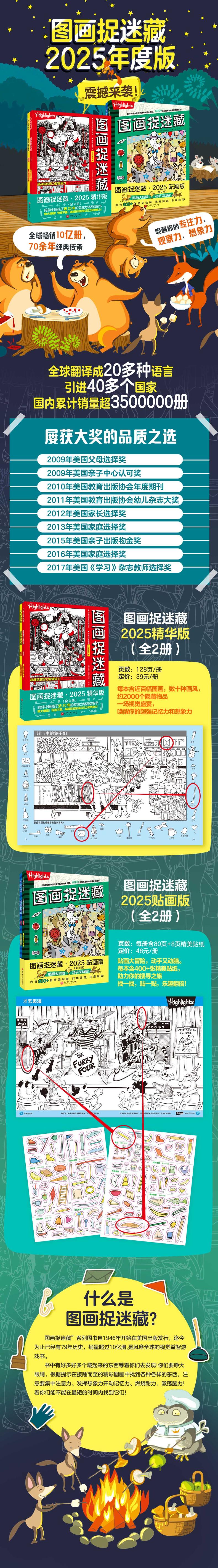 “图画捉迷藏”系列图书自1946年开始在美国出版发行,迄今为止已经有70余年历史,销量超过10亿册,是风靡全球的视觉益智游戏书。教育界专业人士发现,该系列图书每幅图画中的隐藏物品无论是数量还是位置都经过精心设计,每道题都能牢牢地吸和抓住孩子的注意力,做这些练习能够增强孩子的专注力、观察力、创造力和好奇心。而且,玩“图画捉迷藏”游戏对孩子的学习和成长很有意义。寻找隐藏在图画中的东西,能够充分培养孩子的耐心和百折不挠的精神,而最终把隐藏的东西找出来,能够让孩子获得成就感、增强自信心,这一切对塑造孩子的优秀品格和提升孩子的竞争力无疑有着积极的作用。